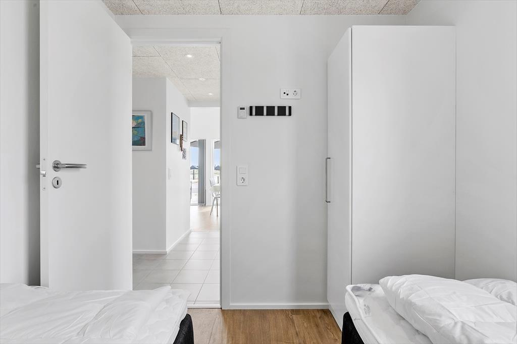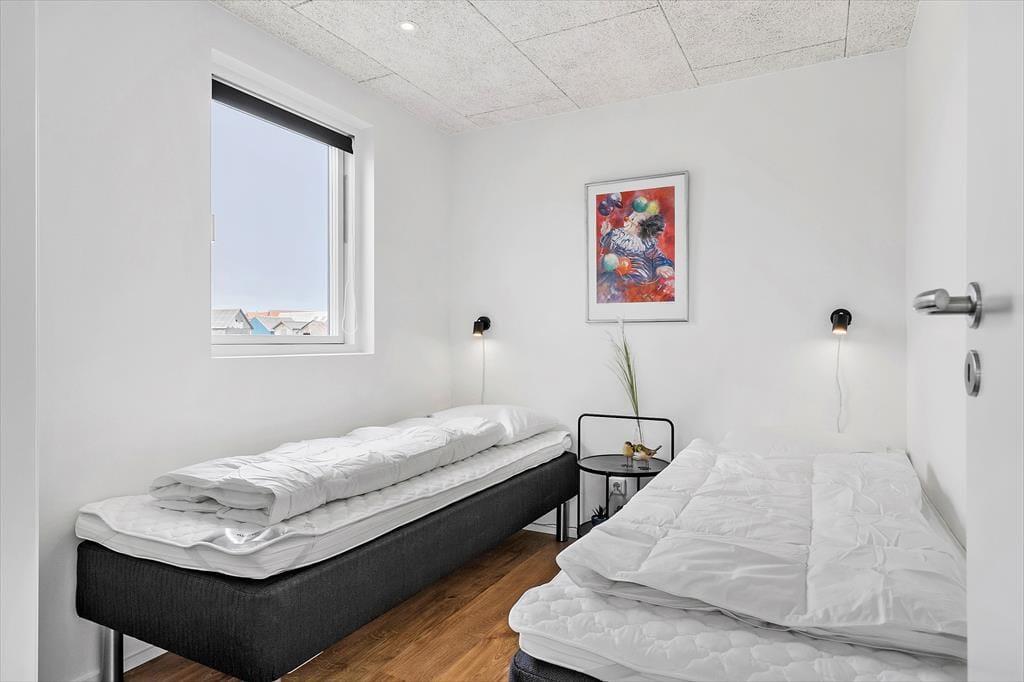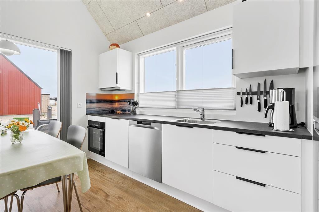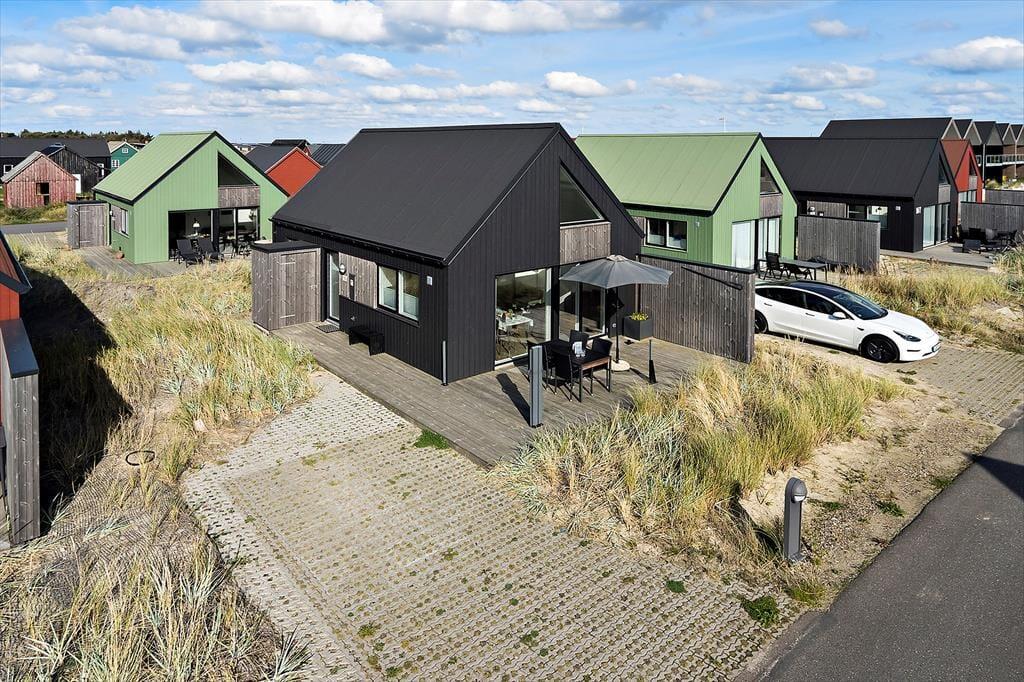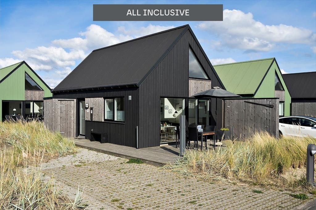 Sommerhuset er opført i 2022, og det samme er de omkringliggende ferieboliger, der hører med til den farverige og charmerende bebyggelse Langsand Langs Sand. Der er ikke kun kælet for arkitekturen, men også for alle indretningsdetaljer, lige fra det stilfulde møblement til gulvvarmen, der findes overalt i huset. Planløsningen er også god: Stue og køkken ligger samlet som et lyst og indbydende opholdsrum, hvor I kan hygge jer med lækker mad, lange snakke over spisebordet og tilbagelænede filmaftener i sofaen. Planløsningen byder derudover på et badeværelse med bruser, vaskemaskine og tørretumbler, og endelig er der to soveværelser med i alt fire sengepladser.
