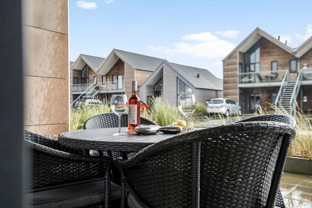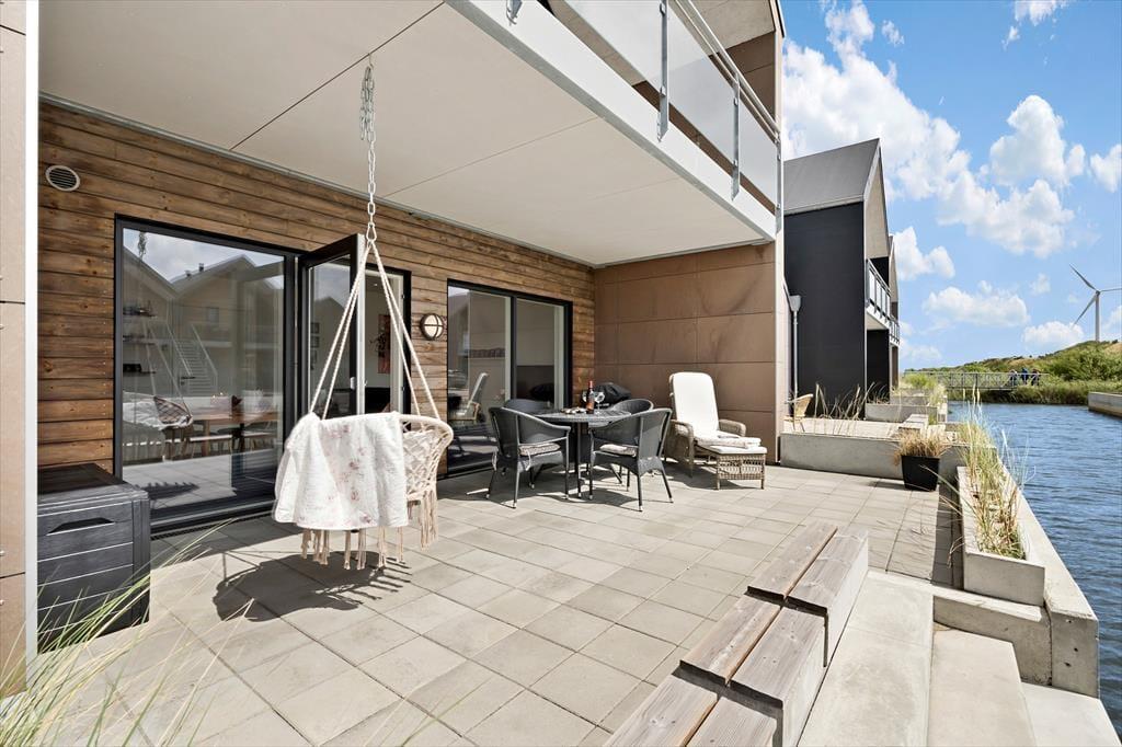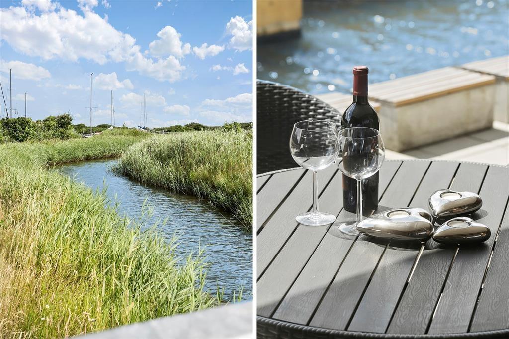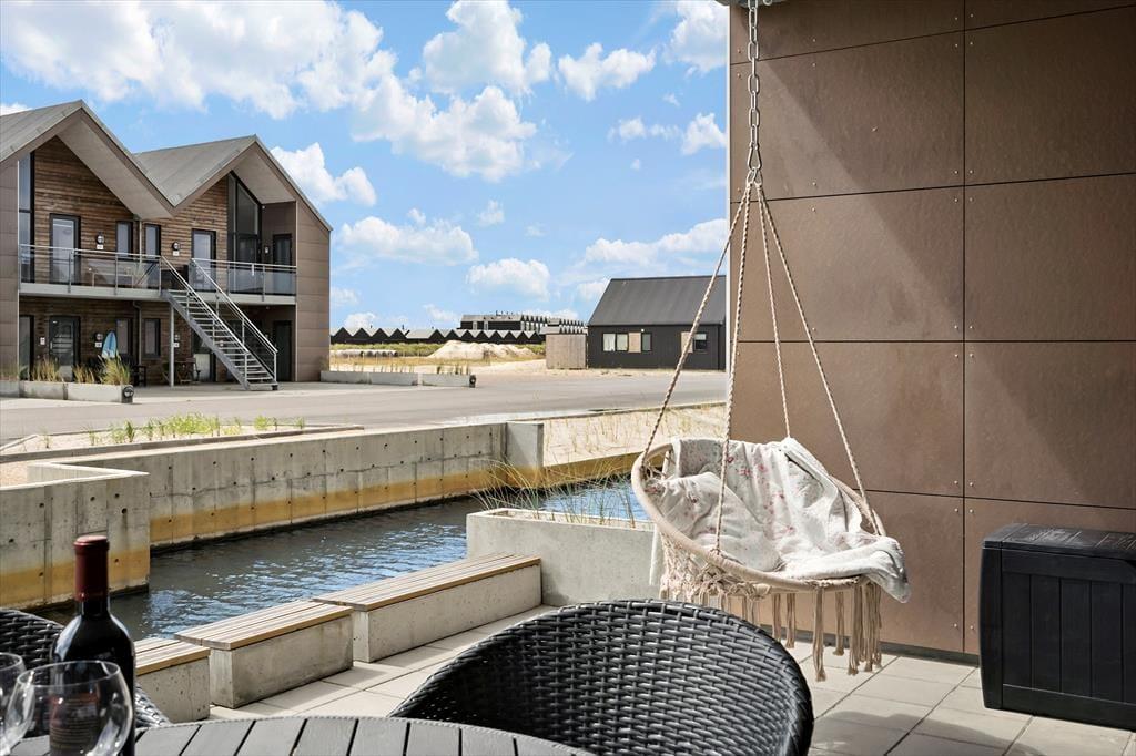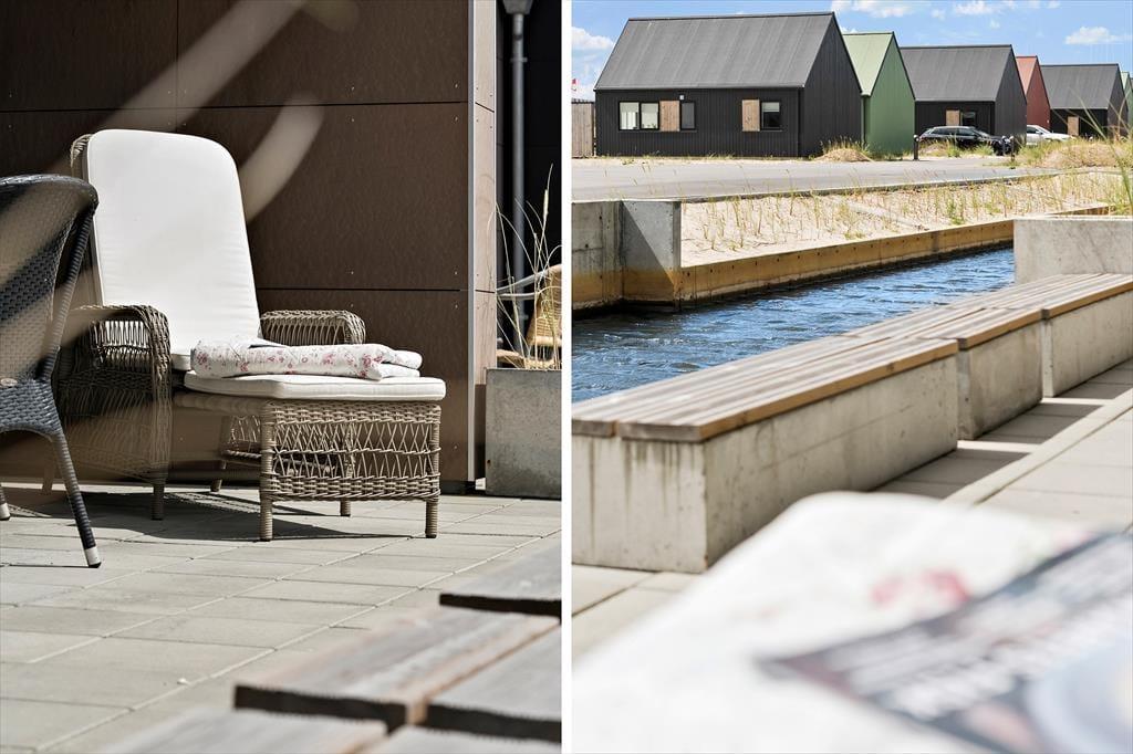 I kanalbyen Langsand Langs Vand ligger ferieboligerne lige ud til vandet, og det har en skøn effekt på udelivet. Når I sidder på lejlighedens store og delvist overdækkede sydterrasse, kan I høre en stille klukken og se solen slå smut på vandspejlet