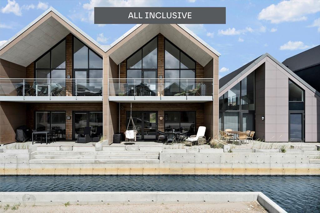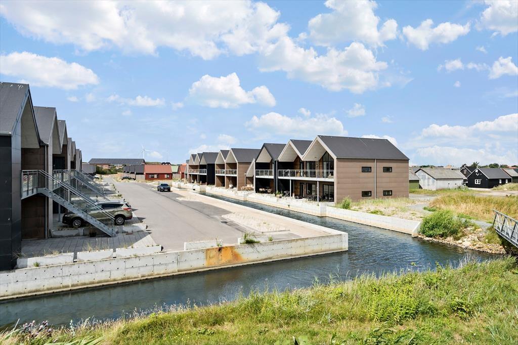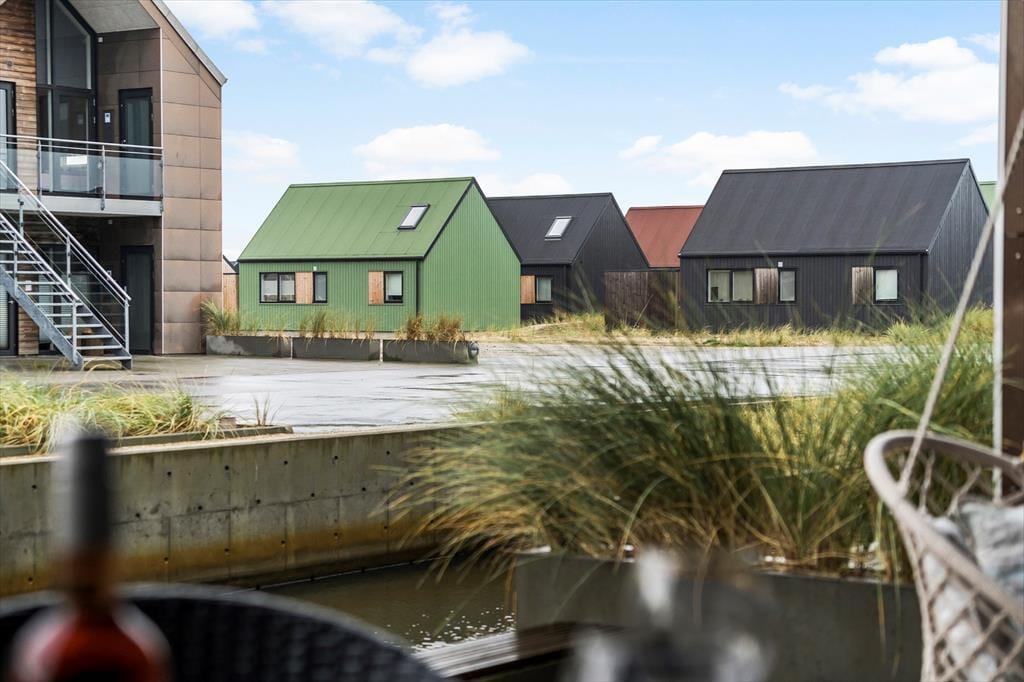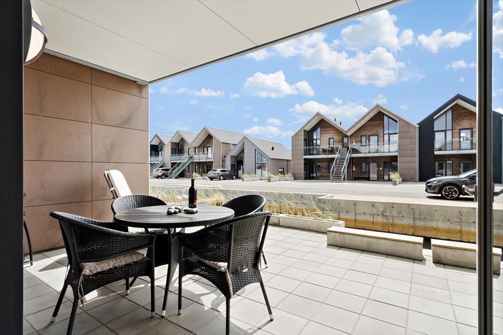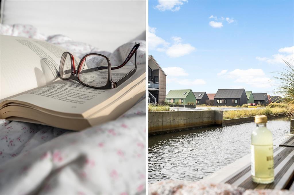I kanalbyen Langsand Langs Vand ligger ferieboligerne lige ud til vandet, og det har en skøn effekt på udelivet. Når I sidder på lejlighedens store og delvist overdækkede sydterrasse, kan I høre en stille klukken og se solen slå smut på vandspejlet