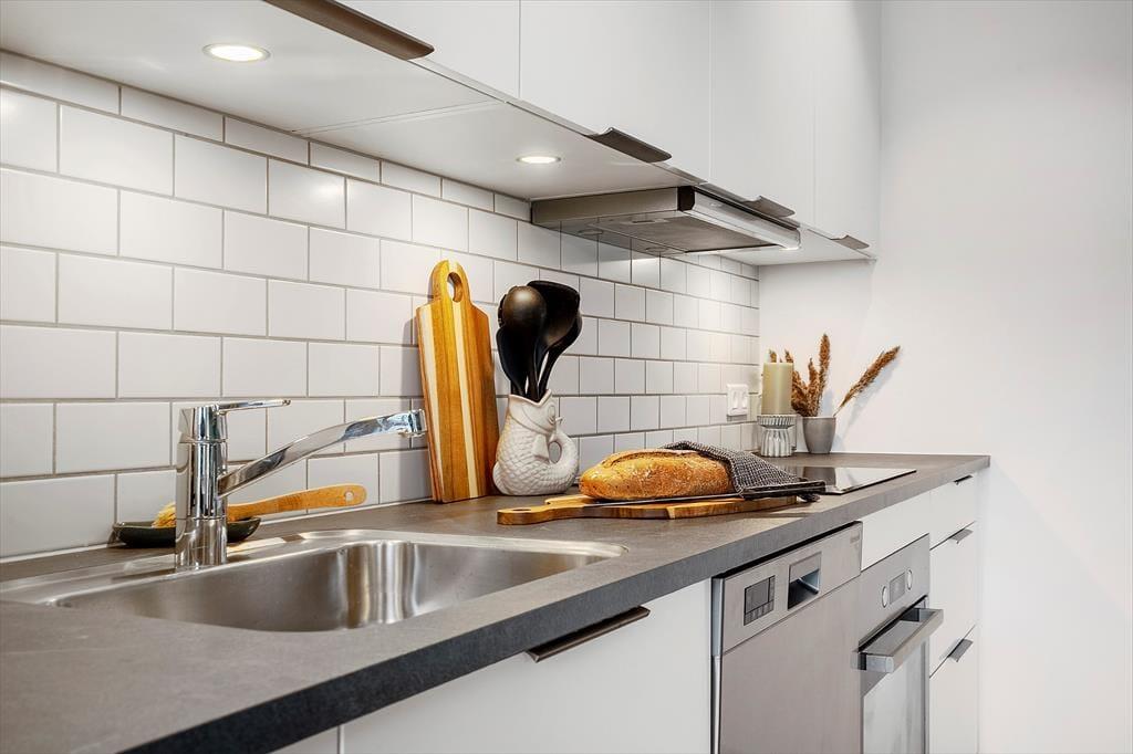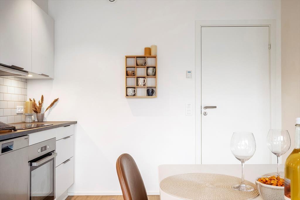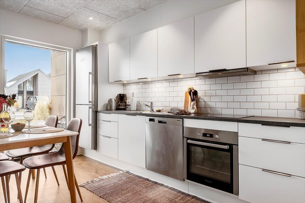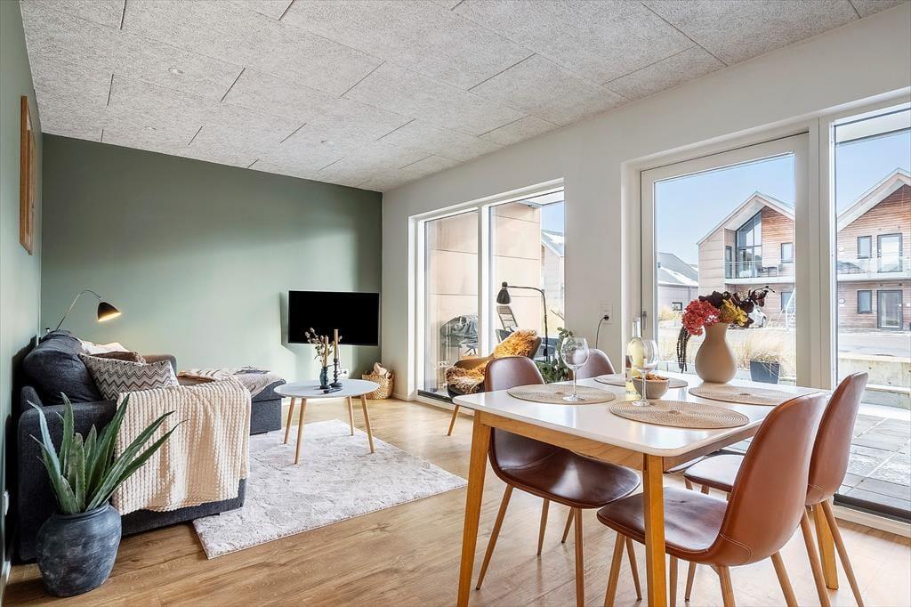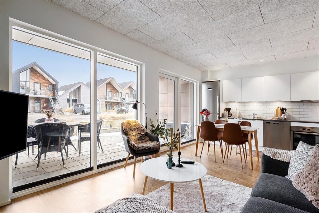 Lejligheden ligger i stueplan i en arkitekttegnet ejendom, der er opført i 2021. Inden døre er atmosfæren lys og venlig, og der er gjort god brug af hver eneste af de 55 m2. Køkken og stue er forenet, så I kan nyde samværet, uanset om madlavningen er et fællesprojekt, eller om der bliver hyggesnakket på tværs af rummet. I kan tænde for fladskærms-tv’et, hvis I vil følge med i nyhederne eller jeres yndlingsprogrammer i løbet af ferien, og i en moderne lejlighed som denne er der selvfølgelig også god wi-fi-forbindelse. Badeværelset er udstyret med bruser, gulvvarme og kombi-vaskemaskine, og fra entréen har I adgang til et dejligt soveværelse, hvor I kan sove godt og længe.