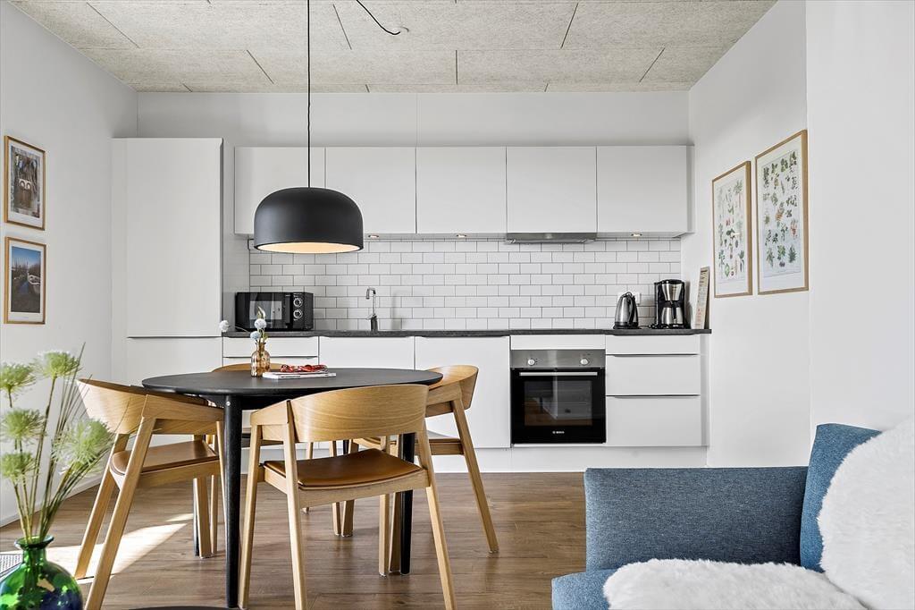 Lejligheden er placeret i stueplan, så du har god kontakt med vandet udenfor – ikke bare med fjorden, men også den flotte kanal, der løber lige forbi ejendommen. Det er nemt at mærke feriefornemmelsen indfinde sig i så smukke og naturskønne omgivelser, og du kan oplagt vælge at tage dagene i roligt tempo i lejlighedens elegant indrettede rum. Ved entréen ligger både et rummeligt soveværelse og et godt brusebadeværelse, der begge er holdt i lyse farvetoner. Den samme indbydende stil præger opholdsrummet, der indbyder til hyggelige madlavningsstunder i det åbne køkken, langstrakte middage ved spisebordet og total afslapning i sofaen.