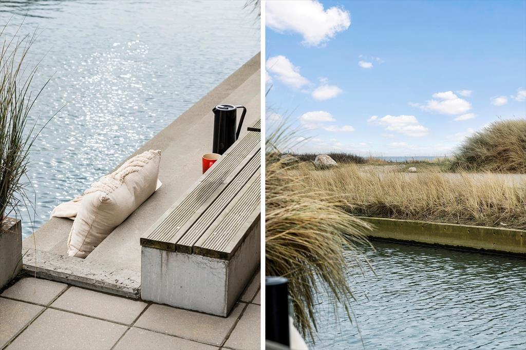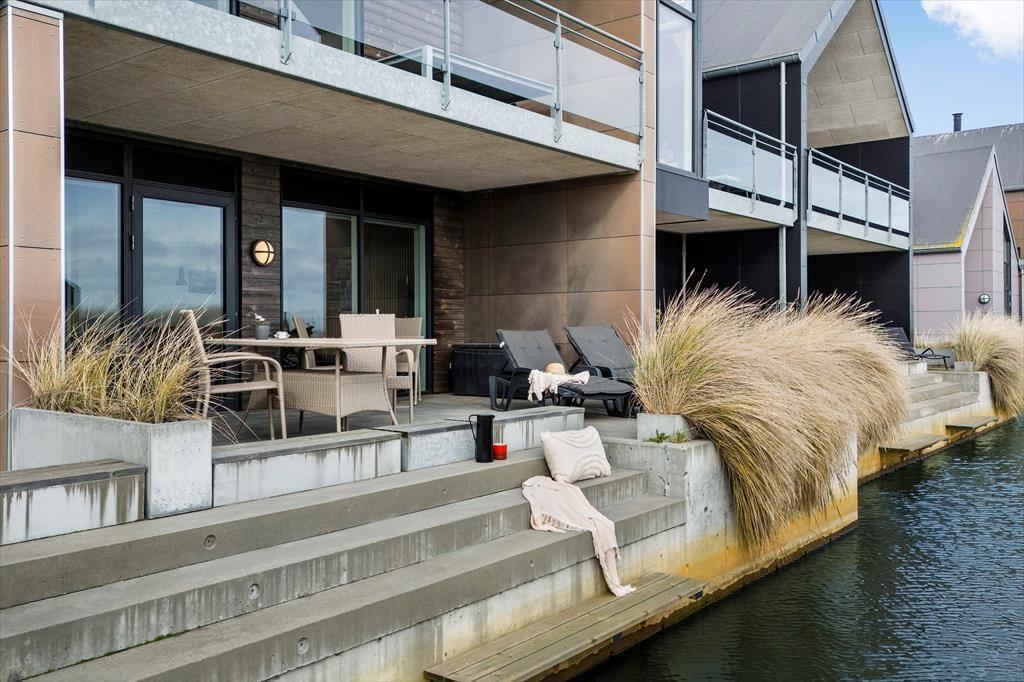 Den store sydvestvendt delvis overdækkede og lukkede solterrasse, der ligger i forlængelse af stuen, kan hurtigt blive din foretrukne opholdsplads, når vejret er lunt og sommerligt. I hvert fald er det et skønt sted at være, uanset om du vil sidde under overdækningen eller helt ude i det fri. Du kan ligefrem slå dig ned på trappen, der fører helt ned til kanalens vandspejl – og hvis du har medbragt et SUP-board, kan du måske endda stævne ud på vandet fra din egen terrasse. De flotte havemøbler sørger for, at du kan sidde komfortabelt, og på den anden side af ejendommen er der god plads til at parkere bilen.