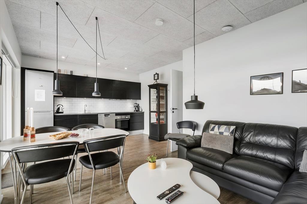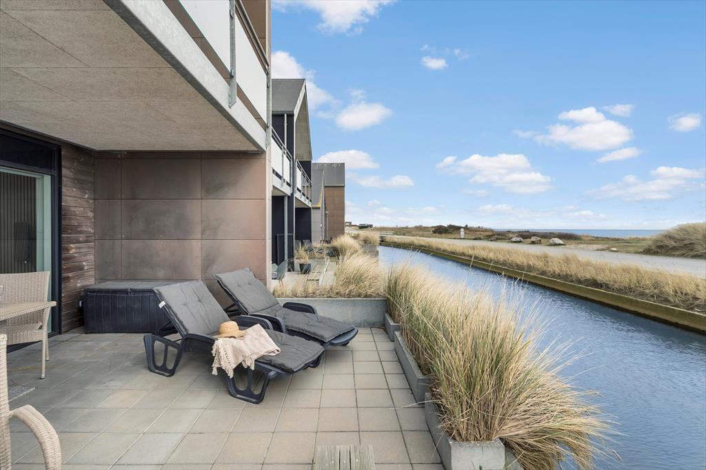 Lejligheden ligger i første række i det moderne feriebyggeri, der går under navnet Langsand Langs Vand, og det betyder, at du har udsigt til fjorden, der venter bare 75 meter væk. Især i stuen er vinduerne store, så de naturskønne omgivelser bliver inviteret helt indenfor – og det er altså et dejligt bagtæppe at have, når du slapper af inden døre med din kære. I stuen er der stilfuldt møblement og et integreret køkken, og med et soveværelser og et badeværelse har I alt det nødvendige inden døre.
