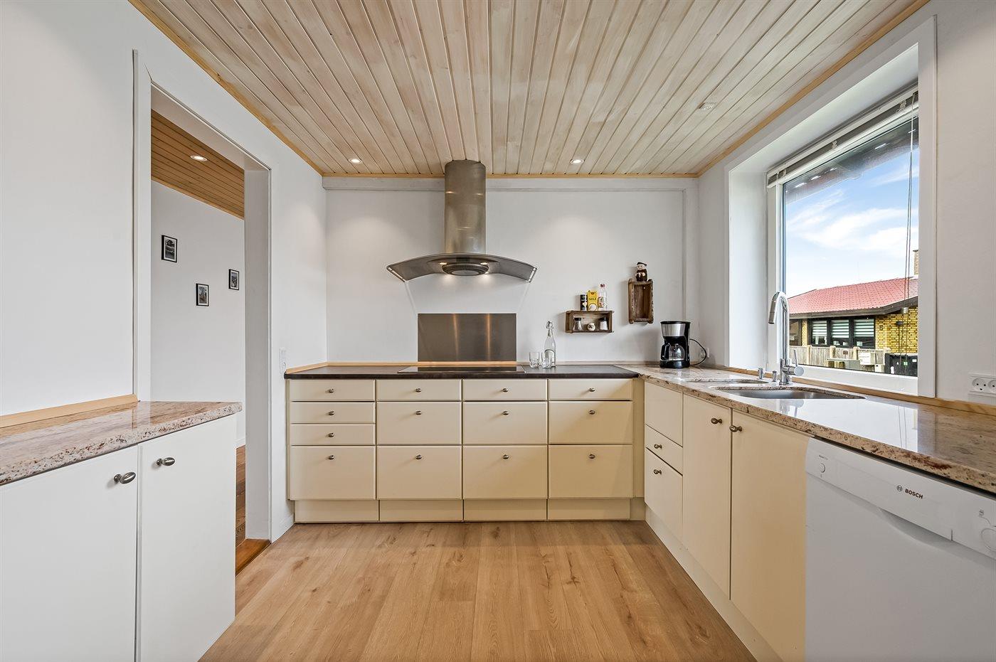 Køkkenet er udstyret med 1 køleskab. Der er 4 keramiske kogeplader, varmluftovn, mikrobølgeovn samt opvaskemaskine.