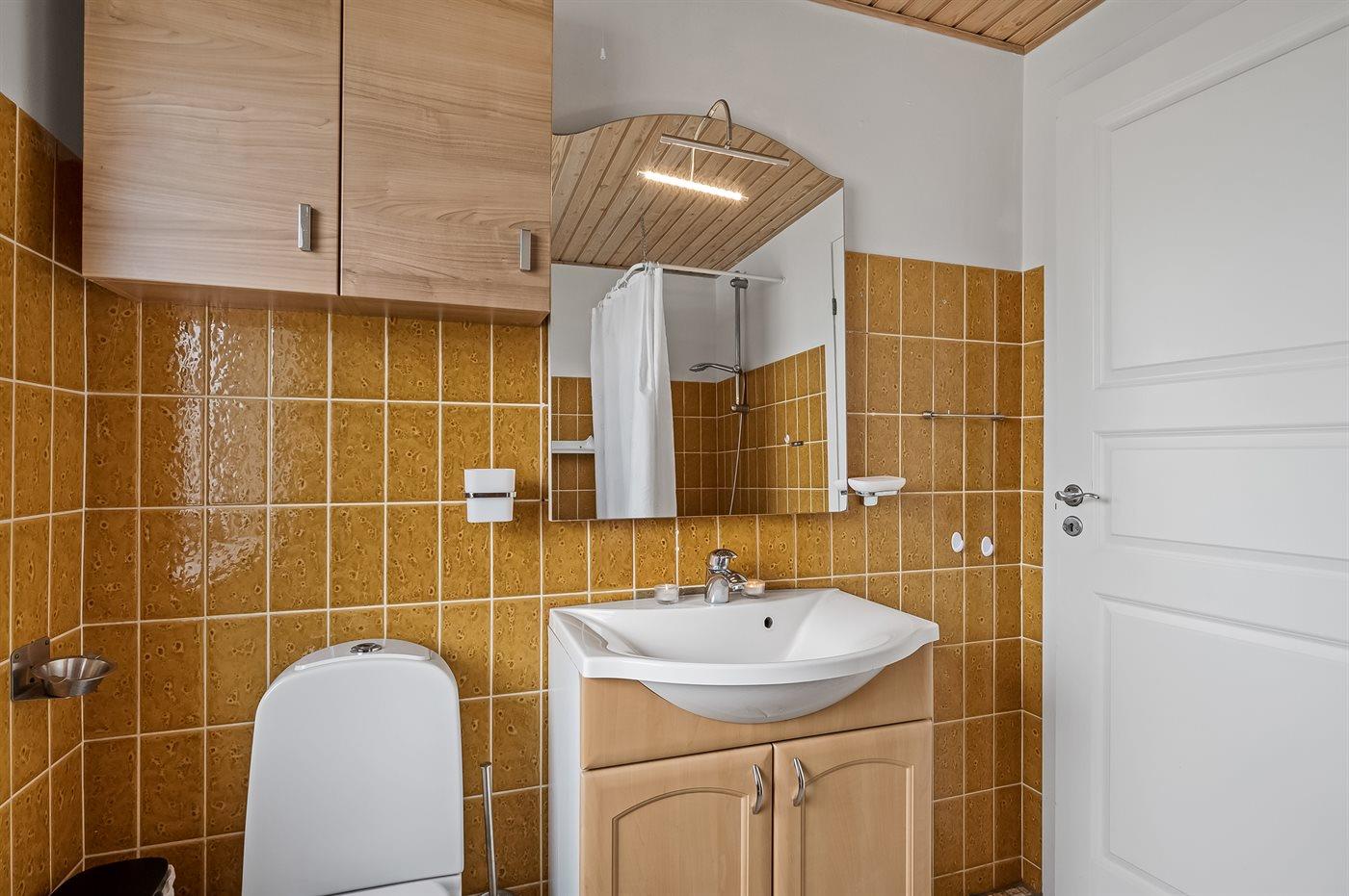 Der er 1 badeværelse med bruseniche og 1 toilet.. Badekar.