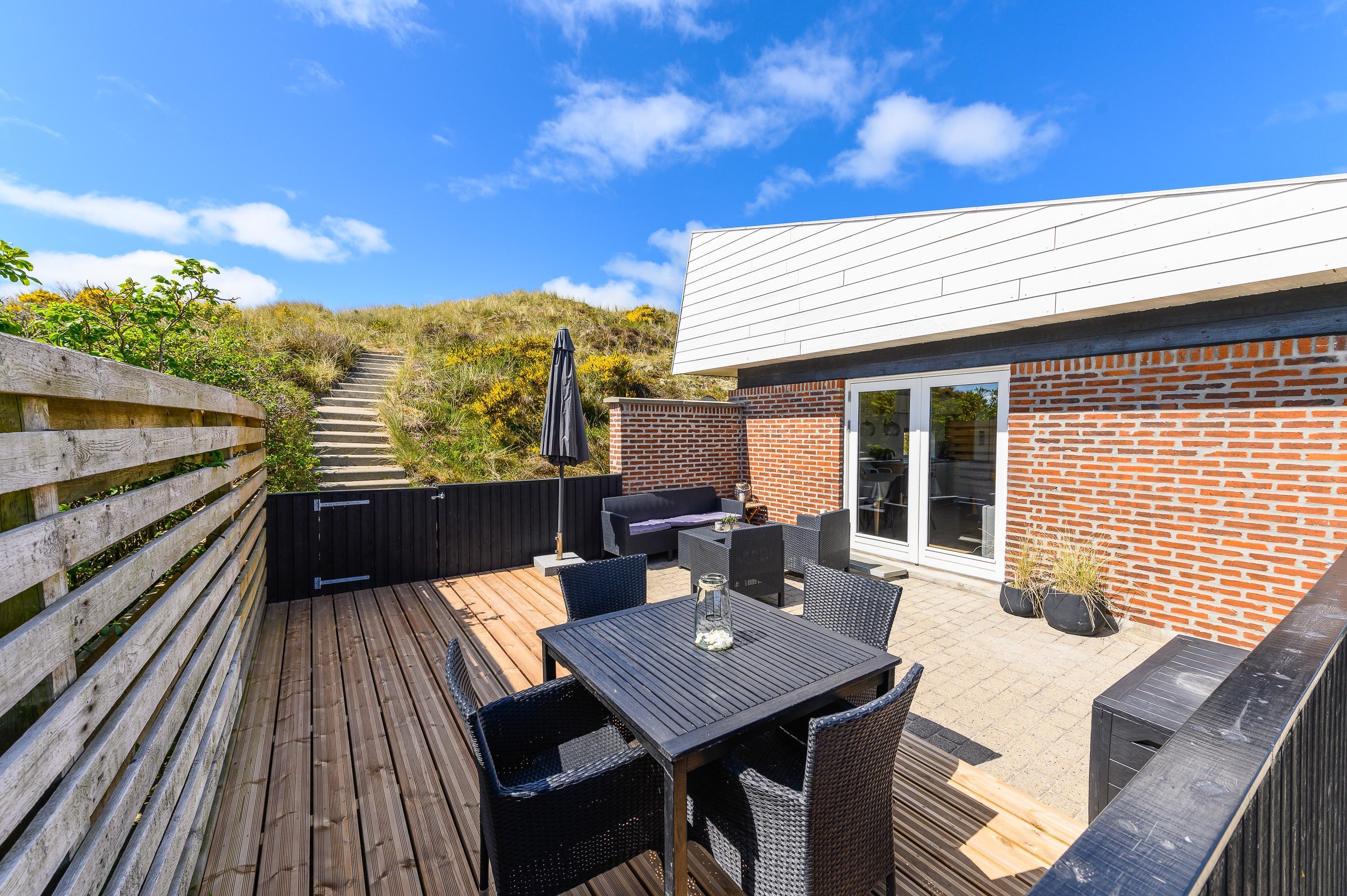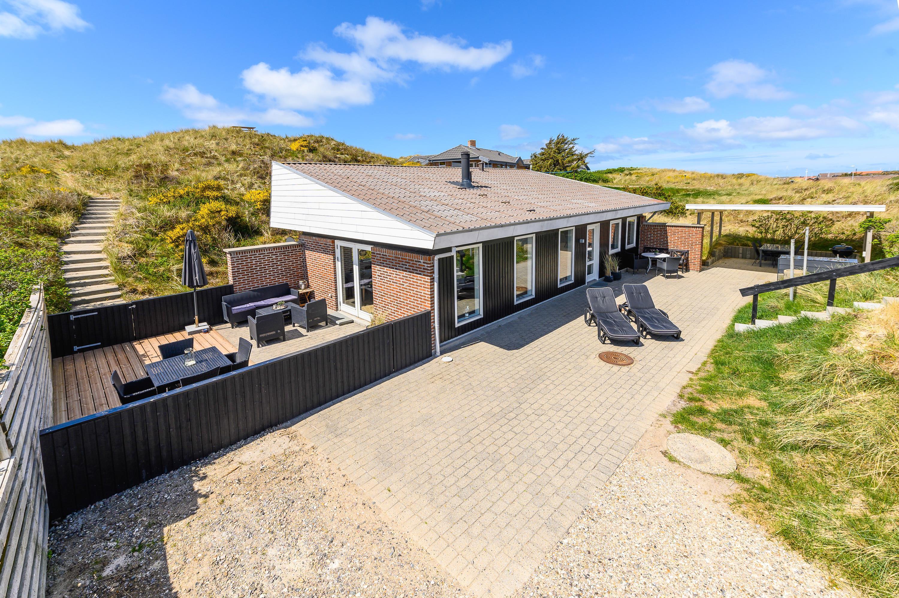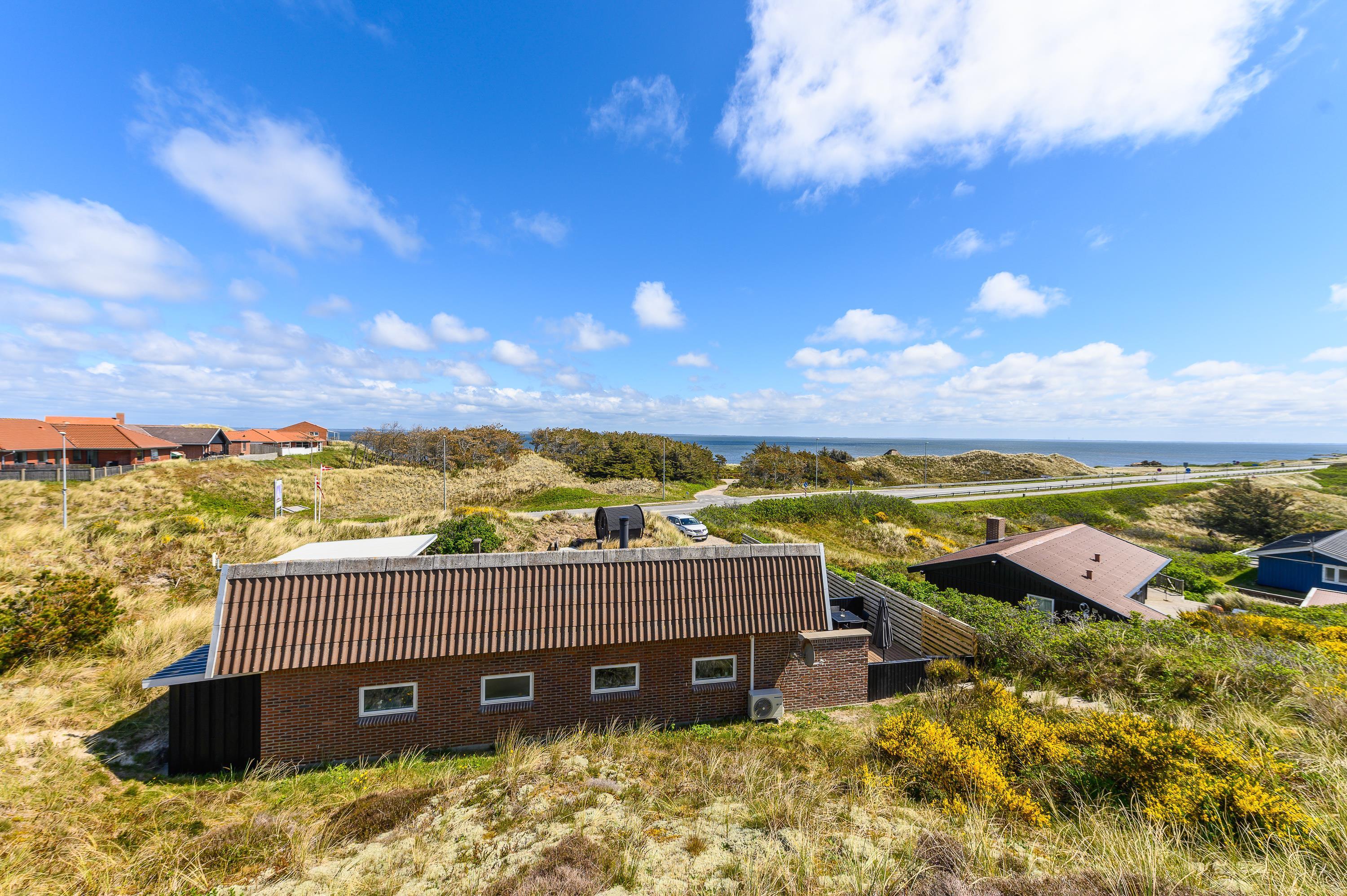 Dette feriehus er placeret på en stor naturgrund og ligger i læ af en kæmpe klit midt i den fascinerende vestjyske natur. Fra den sydvendte, lukkede terrasse går der trapper op til toppen af klitten, hvorfra den vidunderlige udsigt rigtig kan nydes ved en helt privat udsigtspost. I forbindelse med den overdækkede, nordvendte terrasse finder I et stort og praktisk udekøkken. Efter en lang gåtur ved Vesterhavet kan I nyde en afslappende stund i den varme udesauna.