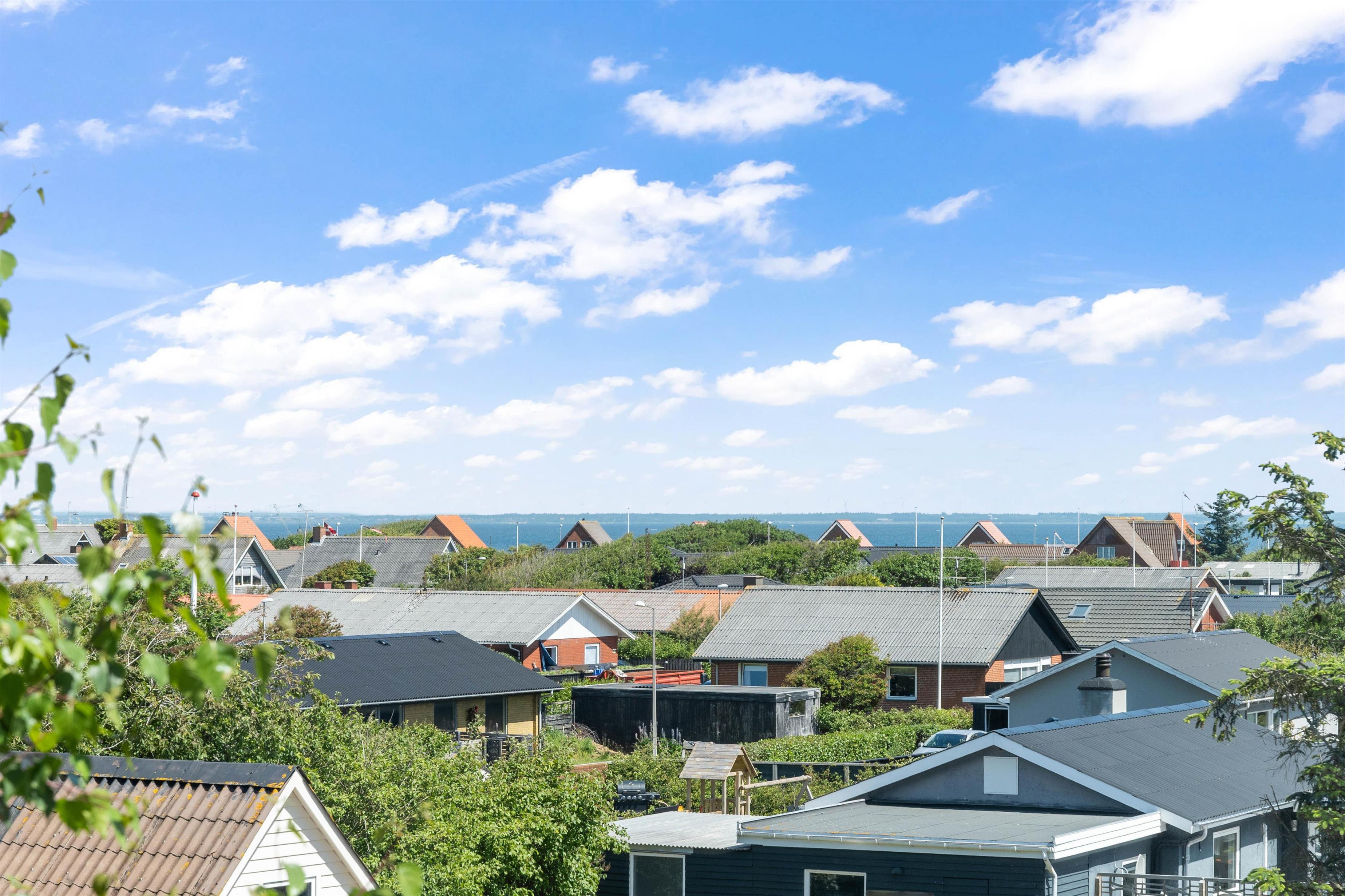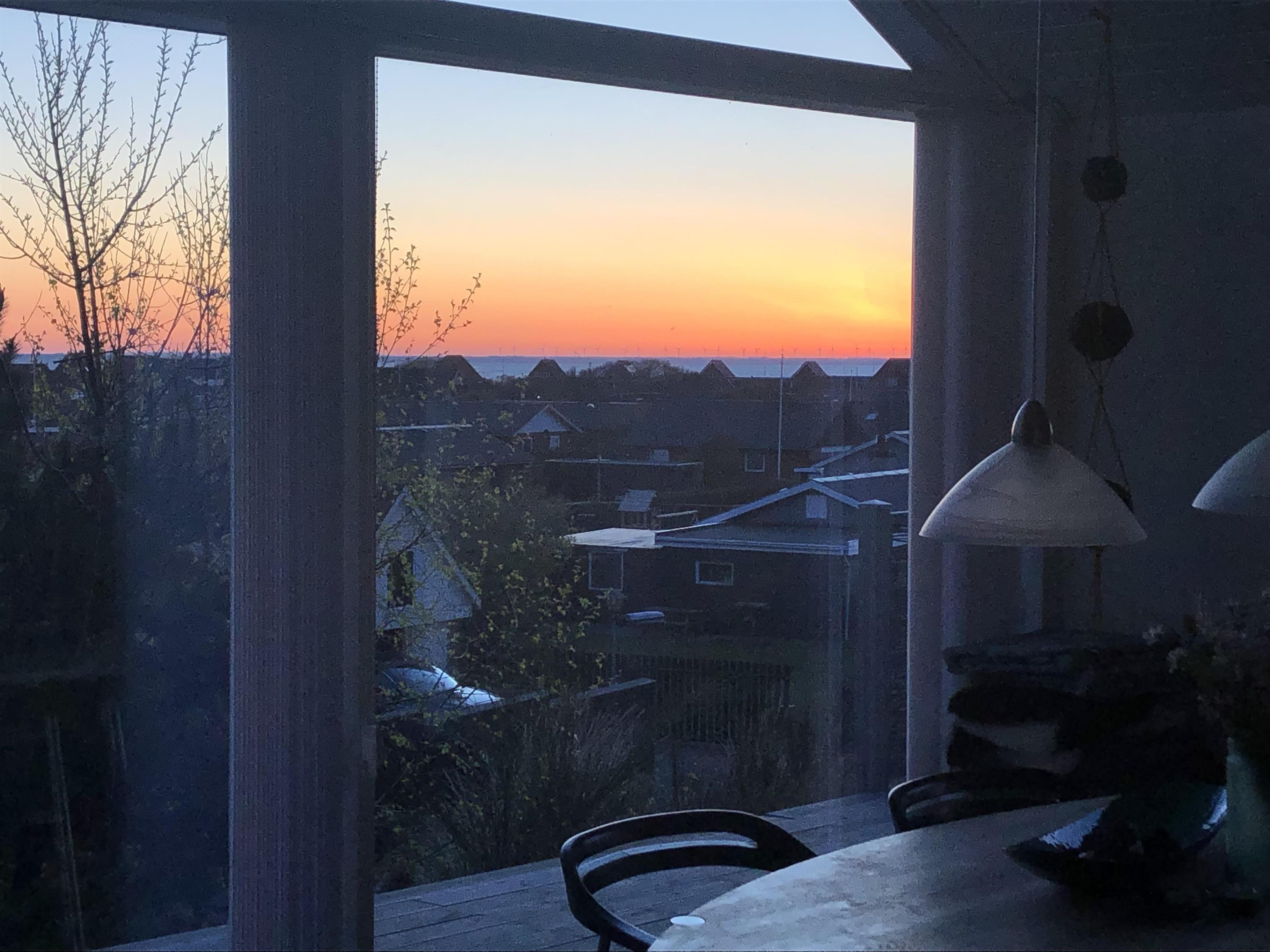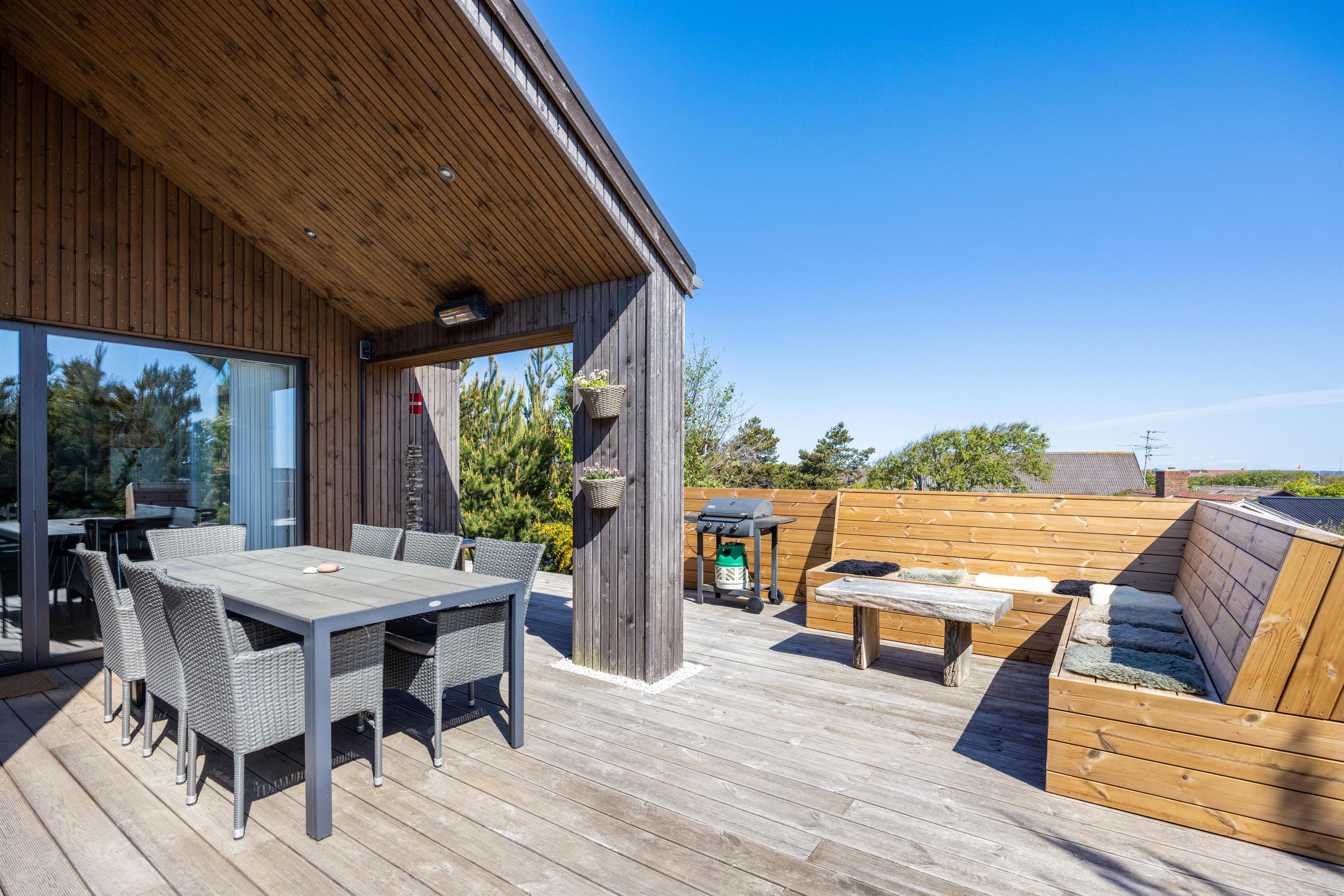 Fra køkkenalrummet er der to udgange til den flotte træterrasse, der er delvist overdækket og godt afskærmet. Her kan morgenkaffen med fordel nydes til en smuk solopgang og en skøn panoramaudsigt over byen og Ringkøbing Fjord - Ligesom også de lange sommeraftner kan nydes her – også efter duggens fald, hvor I kan tænde for terrassevarmeren. Både havemøbler og liggestole står til jeres rådighed, så I har de bedste forudsætninger for at nyde de varme sommerdage udendørs.