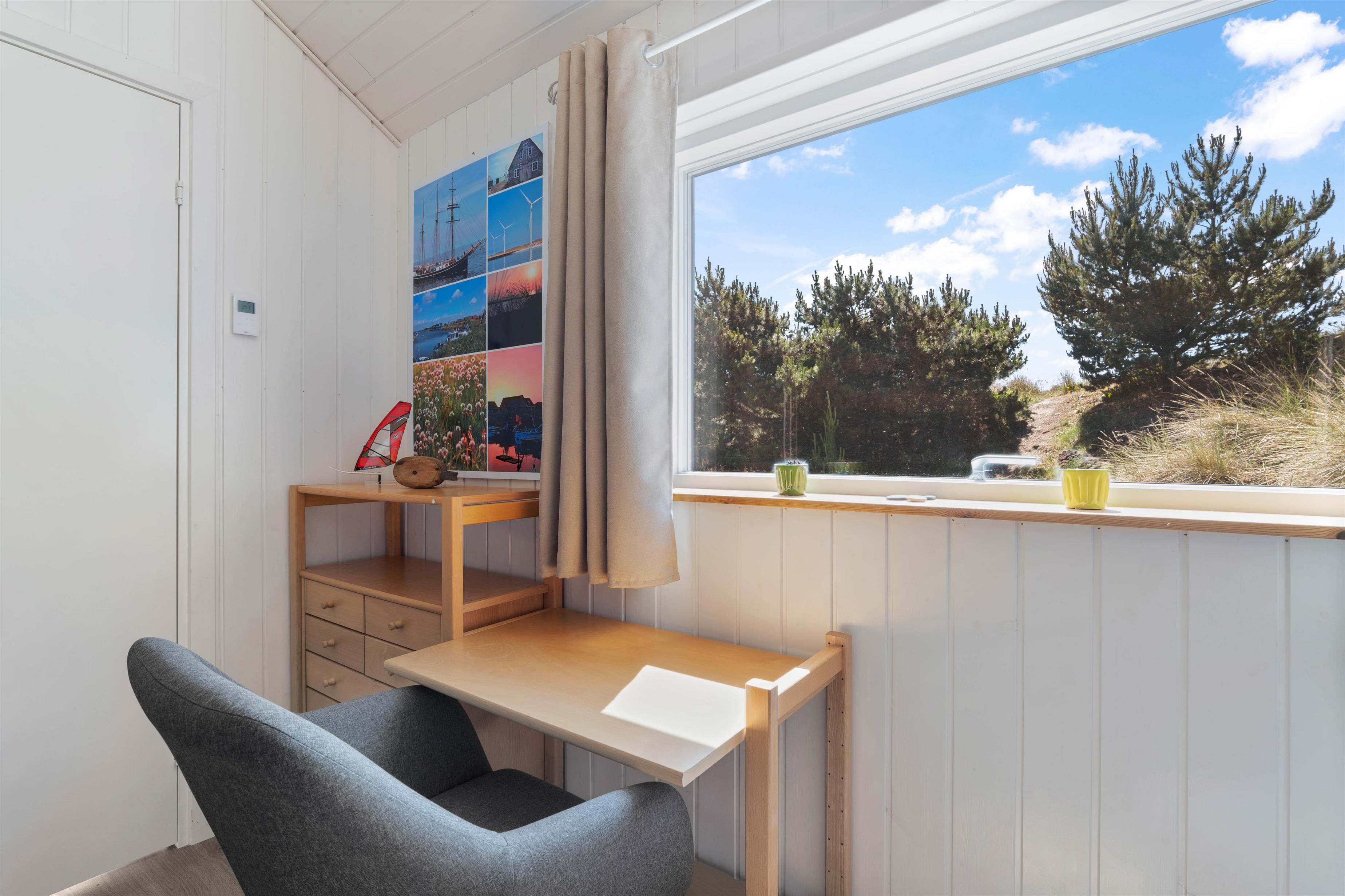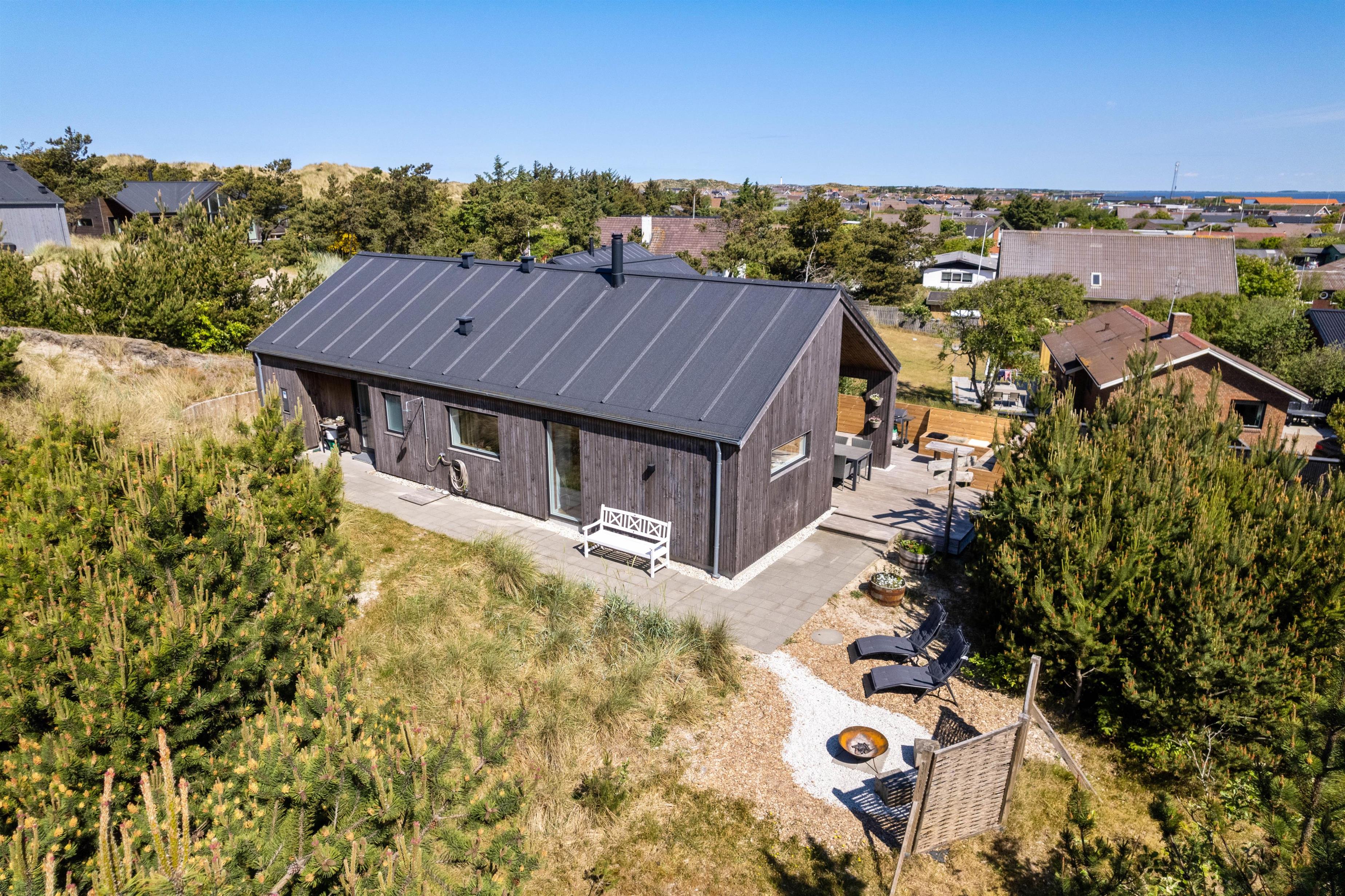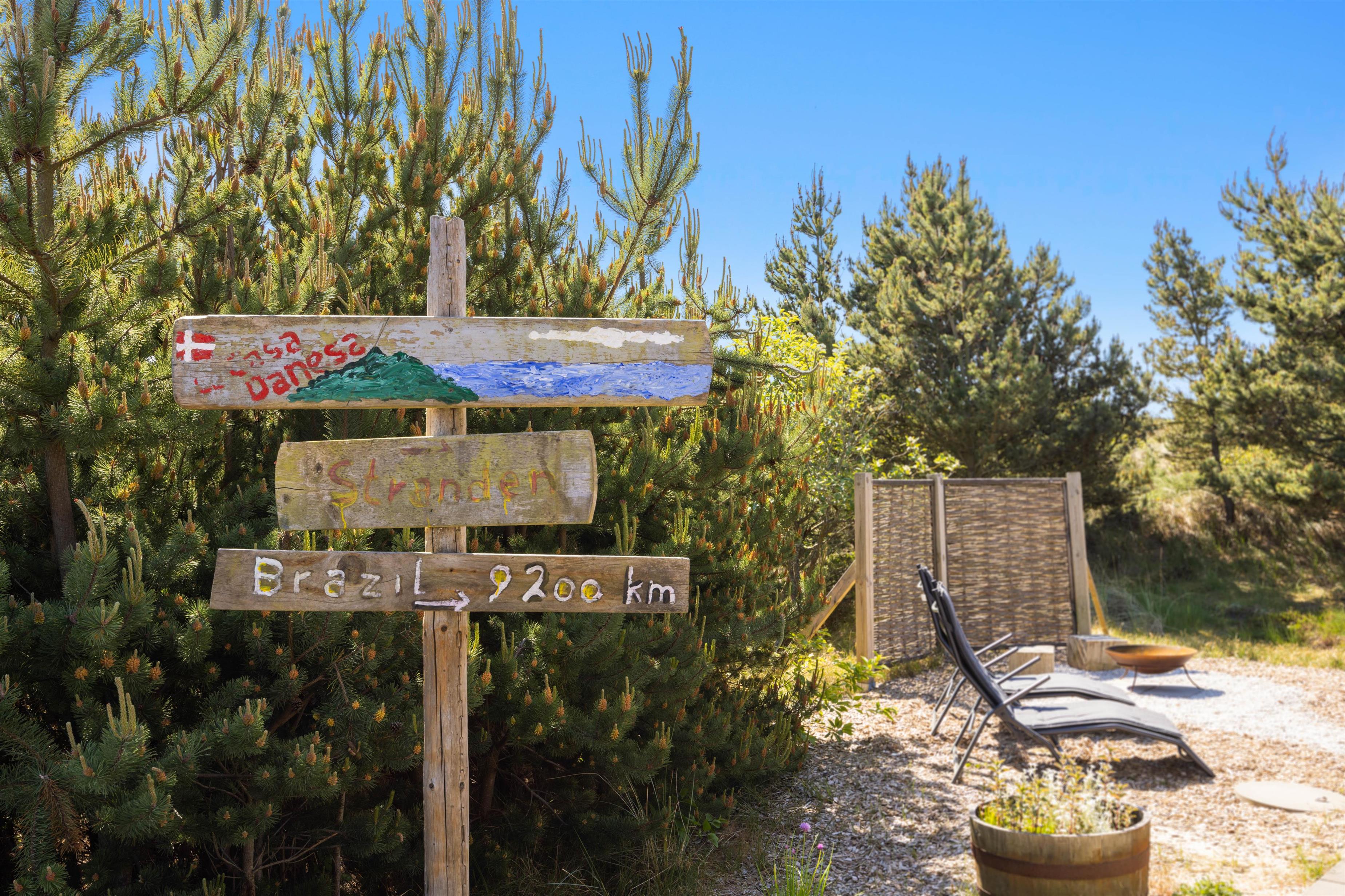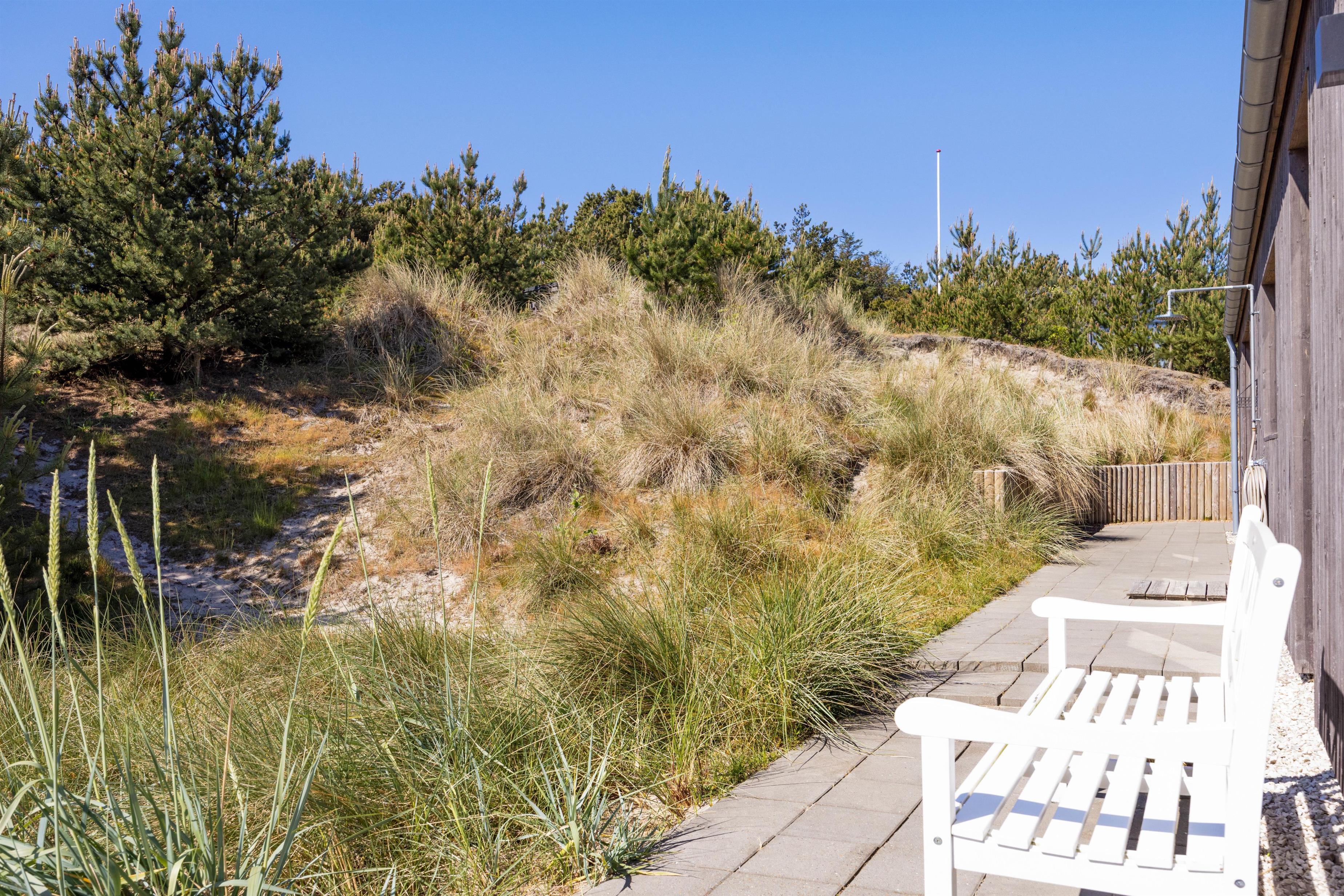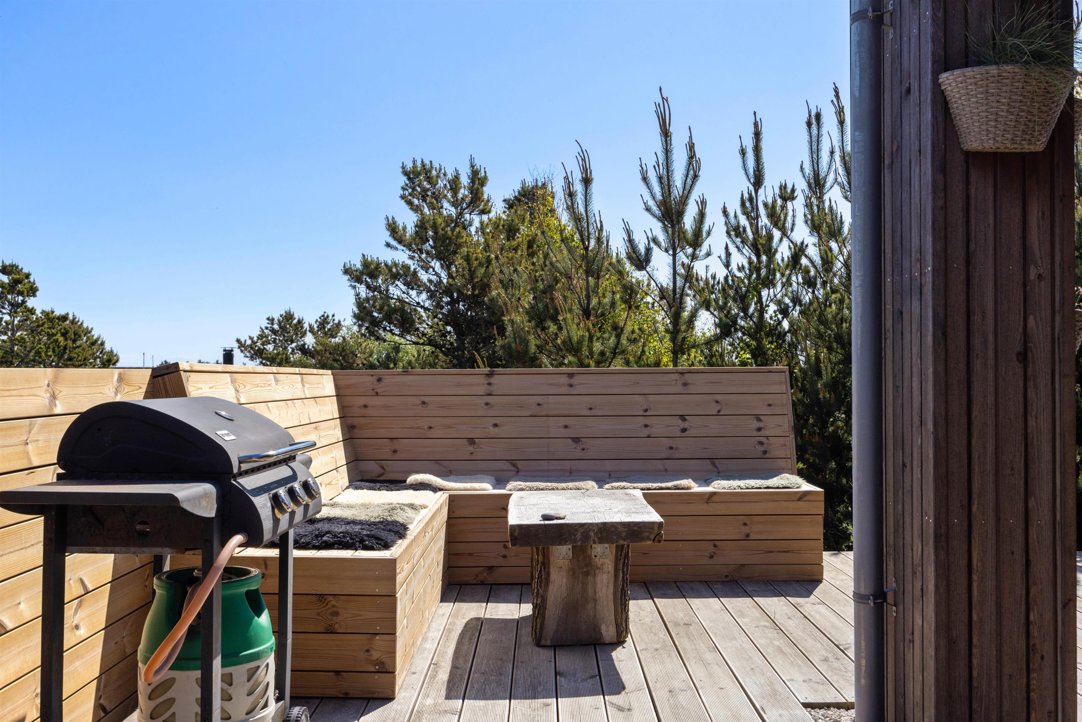 Der er flere skønne kroge omkring sommerhuset, hvor I ugeneret kan hygge jer i de varme dagtimer, og en udebruser (kan benyttes fra april til november) er lige ved hånden, hvis det skulle blive nødvendigt med en afkøling - eller hvis I skal have skyllet sandet af tæerne efter en tur ved Vesterhavet. Den lille bålplads er et godt bud på aftenhygge efter en skøn grillmiddag på terrassen.