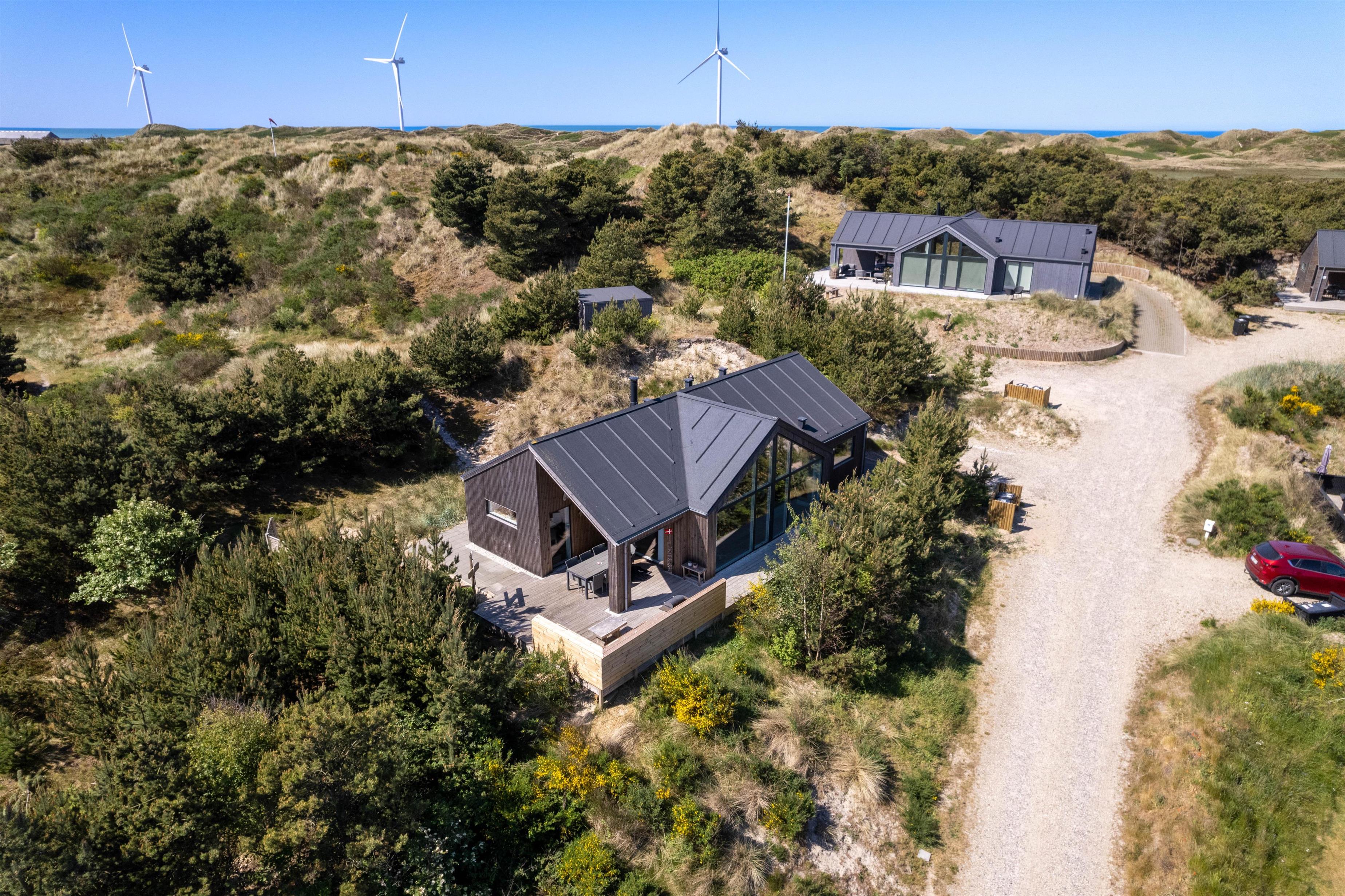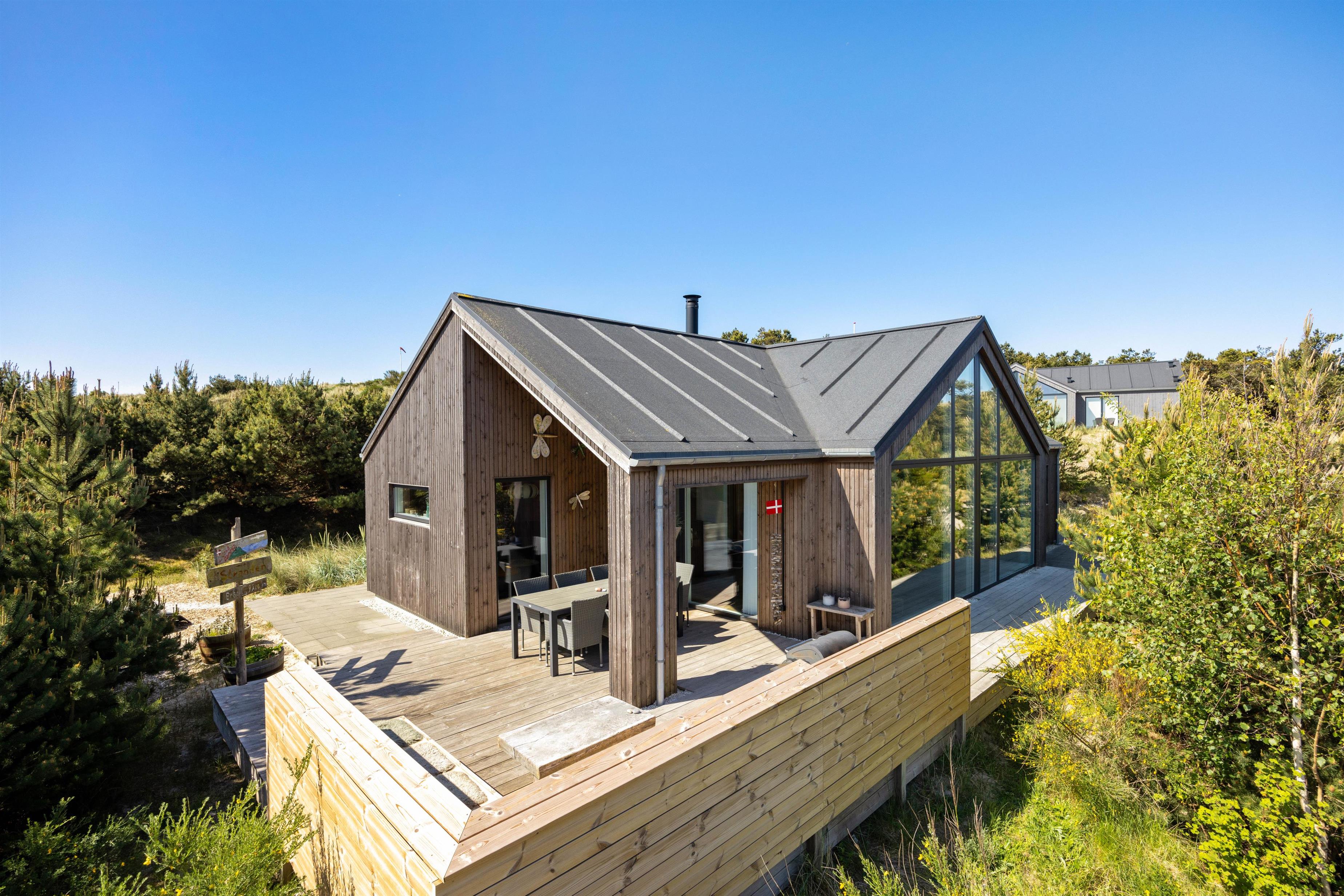 Sommerhuset på Dakotavej 41B i Hvide Sande er bygget i 2019 og indrettet af Cassia og Charles, der vandt tv-programmet Sommerdrømme. De flotte trægulve, de hvide lofter og vægge, der indimellem brydes af fint afstemte farver, går stilrent igennem hele huset, og flere smarte detaljer gør feriehuset helt unikt. Beliggenheden midt i Hvide Sande, men samtidig roligt og naturskønt helt ud til heden og klitterne gør stedet ideelt til en afslappet ferie tæt på stranden og Vesterhavet. Med sommerhusets centrale belligenhed er I i gåafstand til indkøb, svømmehal, kabelpark m.m.