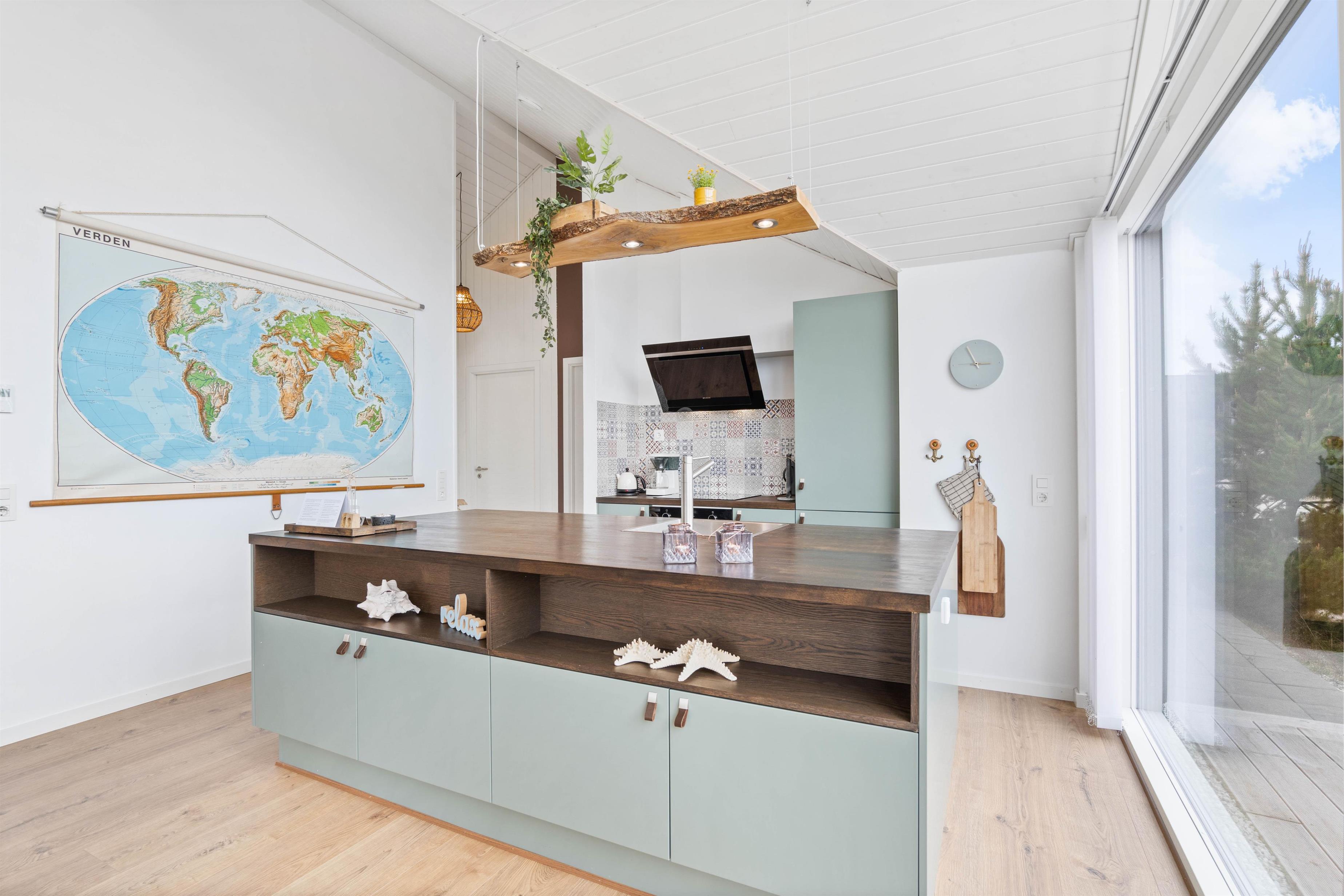 Allerede når I træder ind i sommerhuset, vil I bemærke, at der er kræset for detaljerne. I opholdsstuen, der er feriehusets hjerte, er der et flot lysindfald fra de store panoramavinduer. Her er der virkelig lagt op til mange hyggelige timer, både før og under og efter tilberedning af dagens måltider i det moderne køkken, der med opvaskemaskine, mikroovn og induktionskomfur ikke lader noget tilbage at ønske.