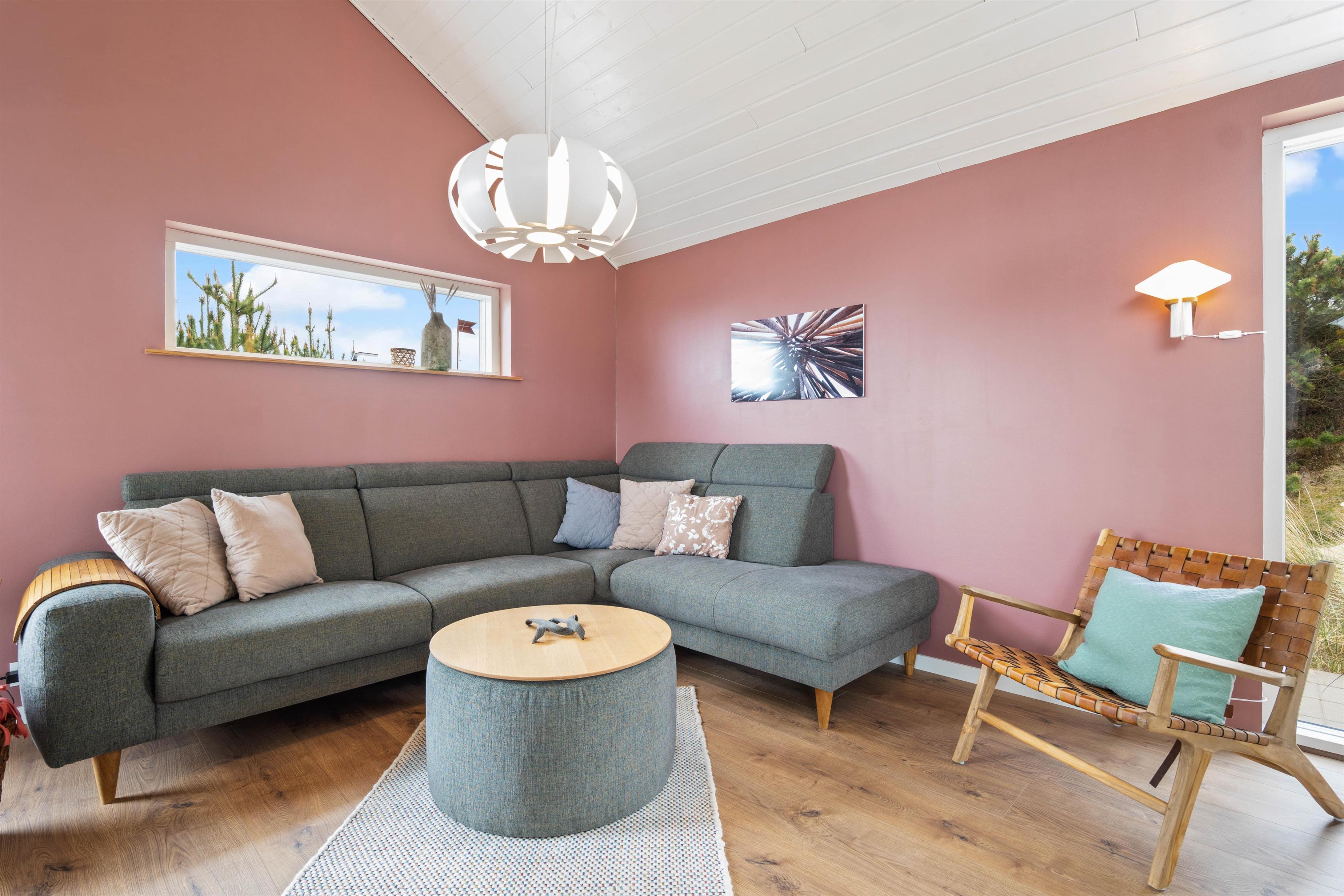 Den hyggelige brændeovn er centralt placeret i spiseafdelingen og spreder herfra sit hyggelige skær og karakteristiske varme. Opholdsstuen ligger i åben forbindelse med køkkenalrummet, og det charmerende sofahjørne kan virke tillokkende på enhver, der trænger til at slappe af med en god film eller bog efter en fantastisk dag i den friske vesterhavsluft.