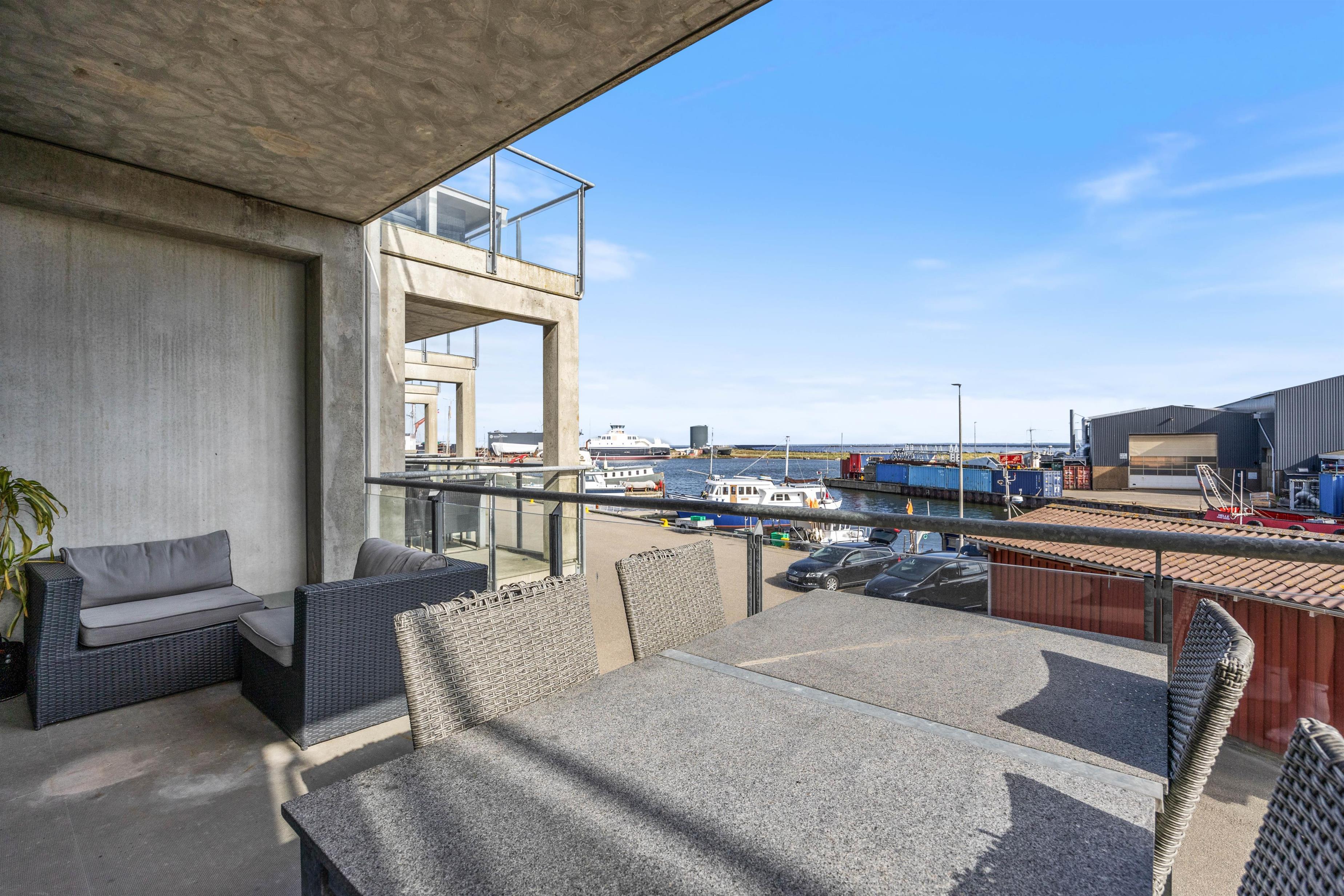 Fra alrummet kommer I ud på den overdækkede og afskærmede terrasse, hvorfra I har udsigt til det charmerende havnemiljø i Mamrelund. Her får I den fulde oplevelse af livet på havnen, og der er altid ly og læ at finde.