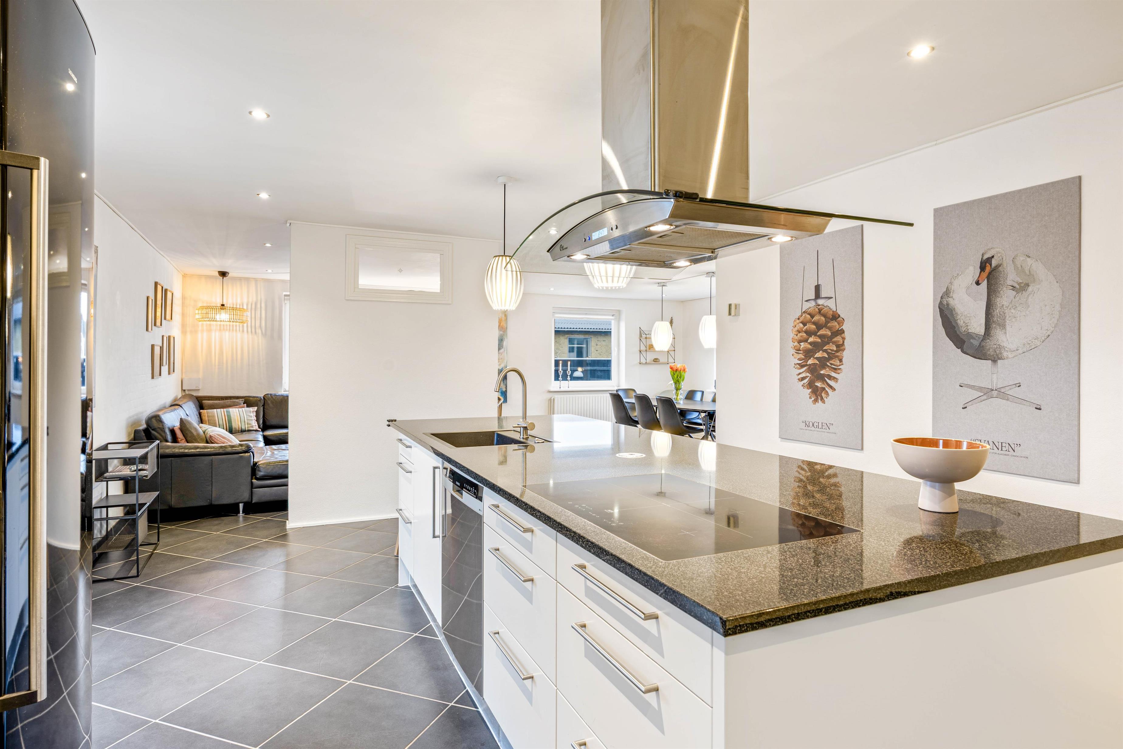 Opholdsstuen er lys og indbydende, og på de lidt køligere dage, kan man lade sig dumpe ned i sofaen med en kop kaffe og en god bog.