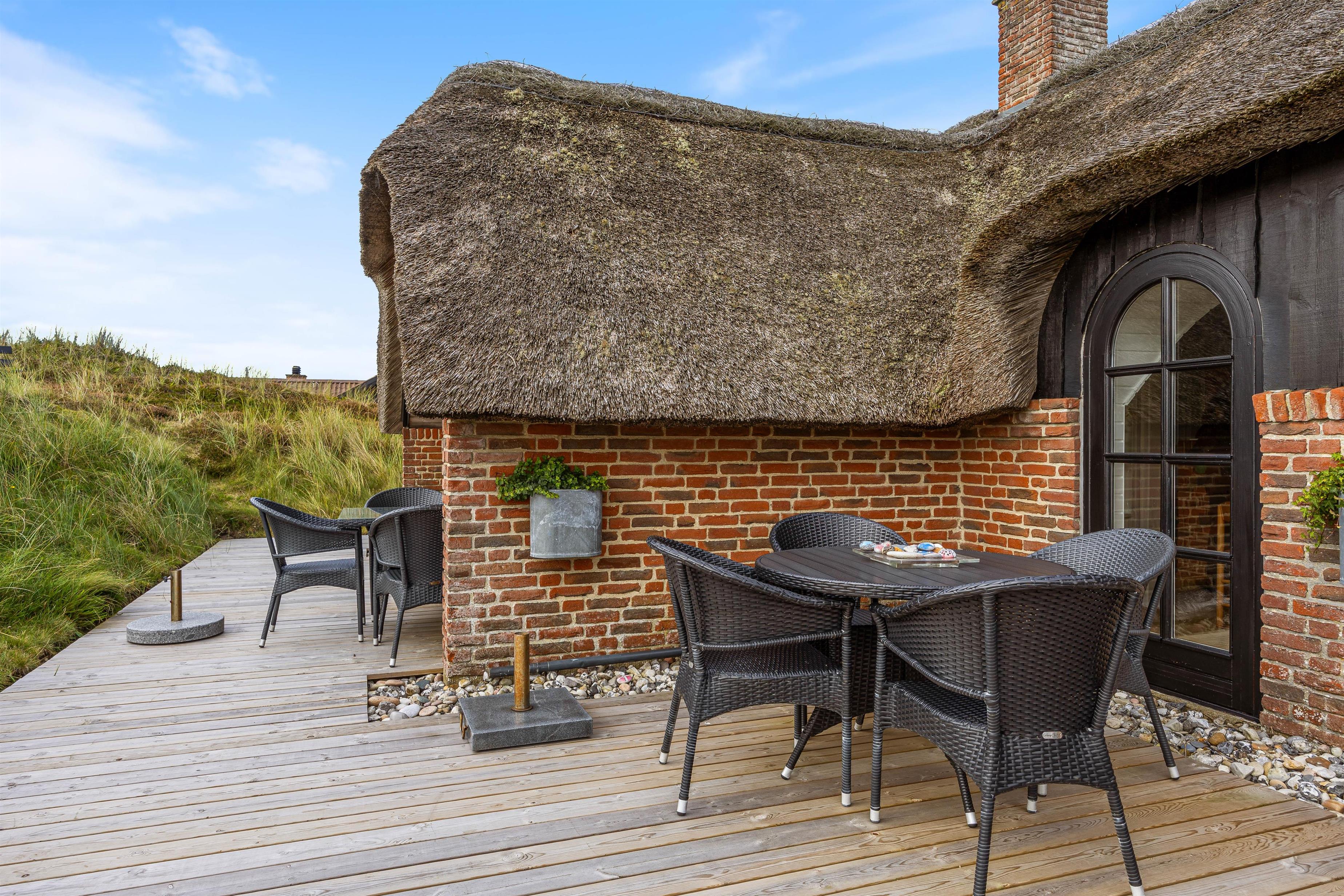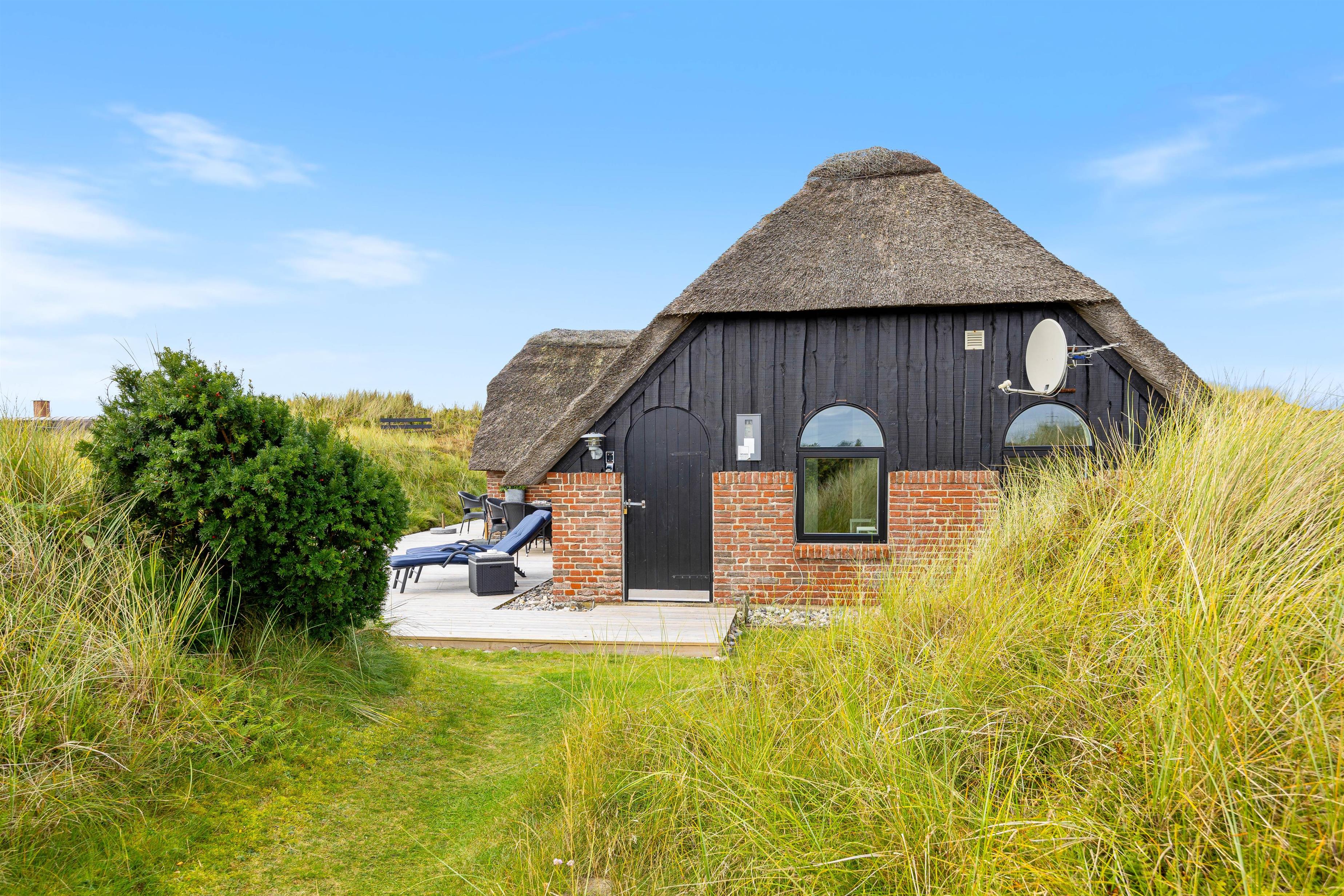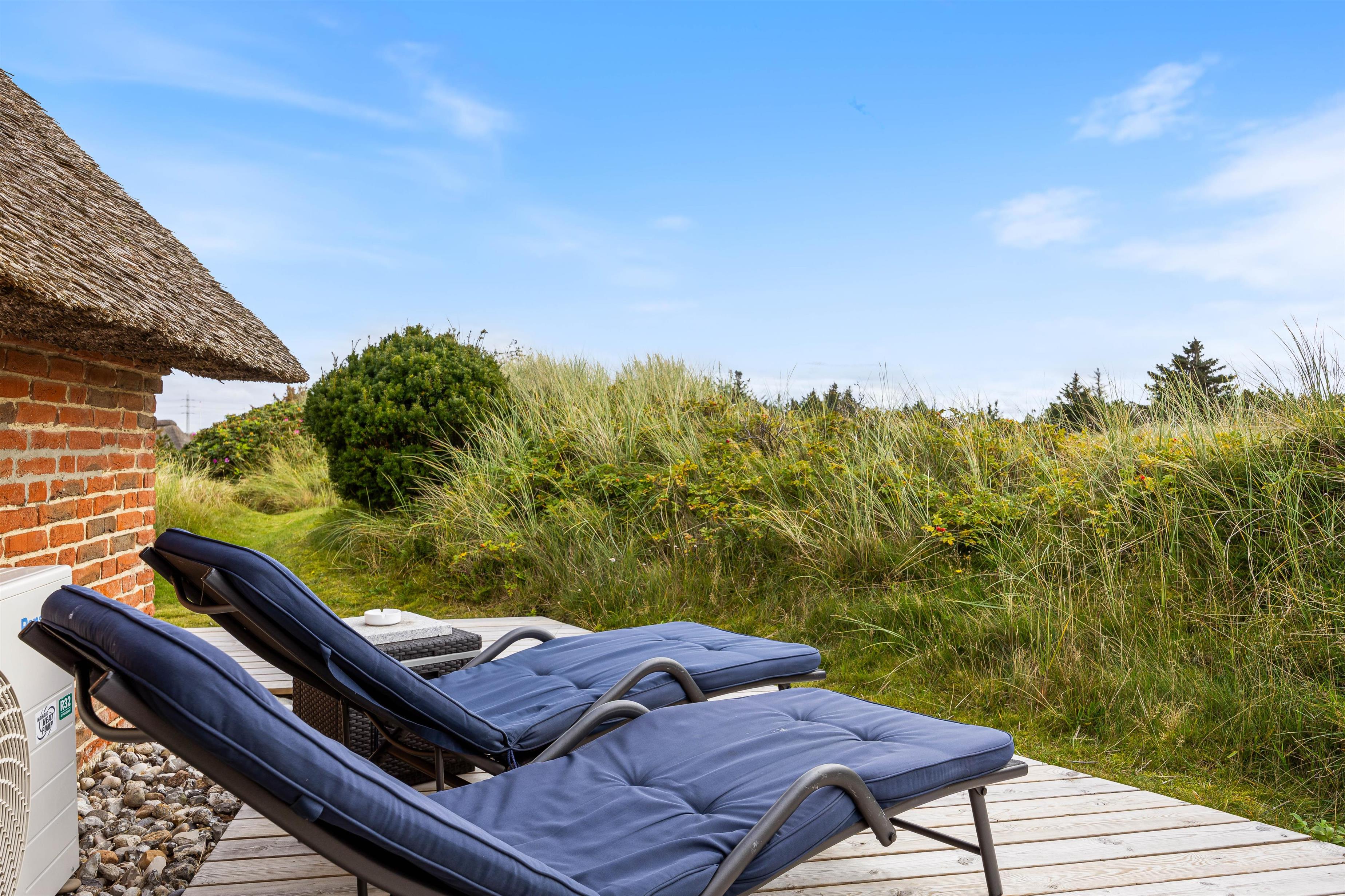 Dette sommerhus er beliggende på en dejlig klitgrund. På terrassen kan I nyde jeres måltider, som I kan tilberede på feriehusets tilh'rende grill, eller slappe af i liggestolene med en god bog.
