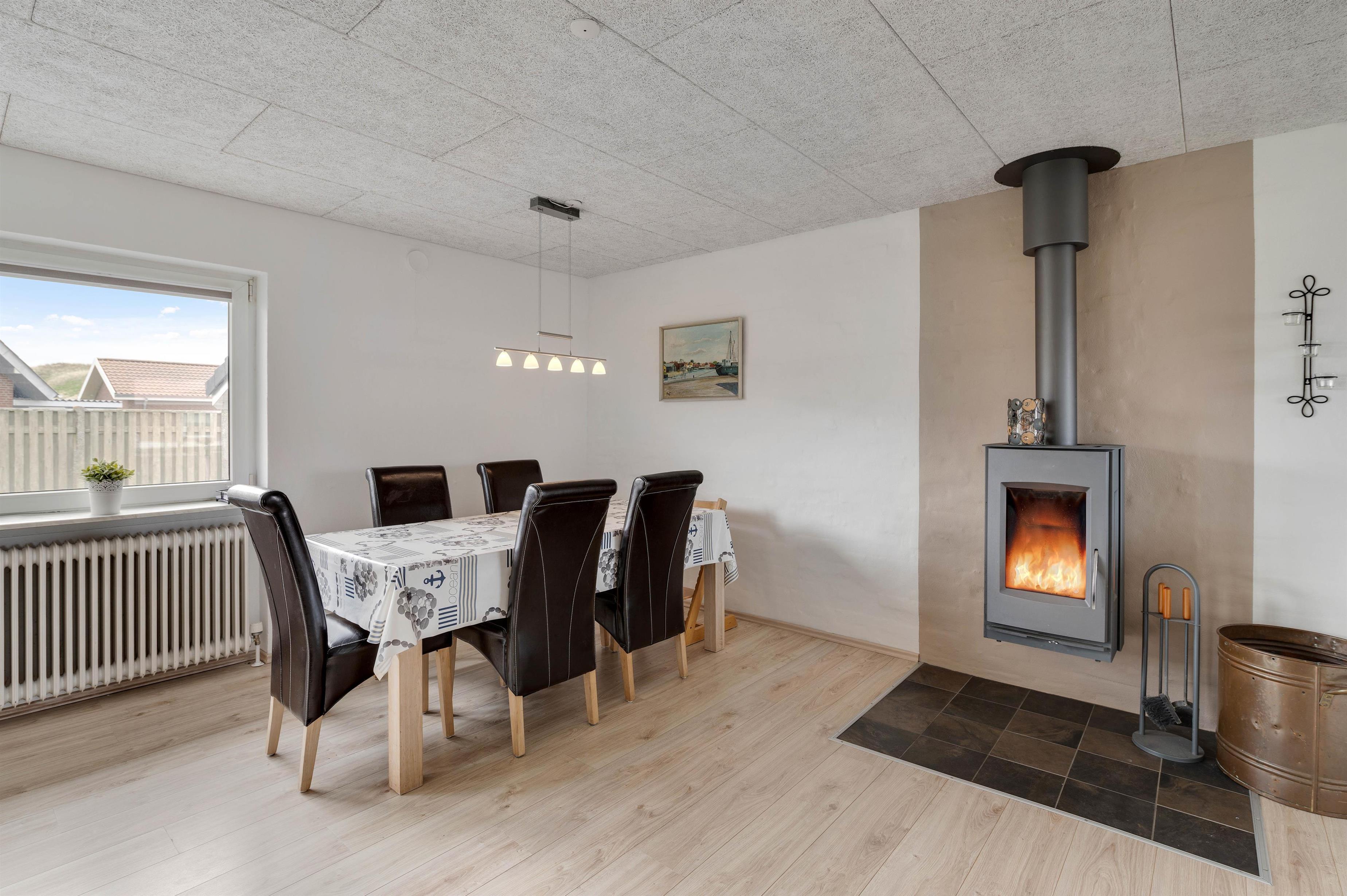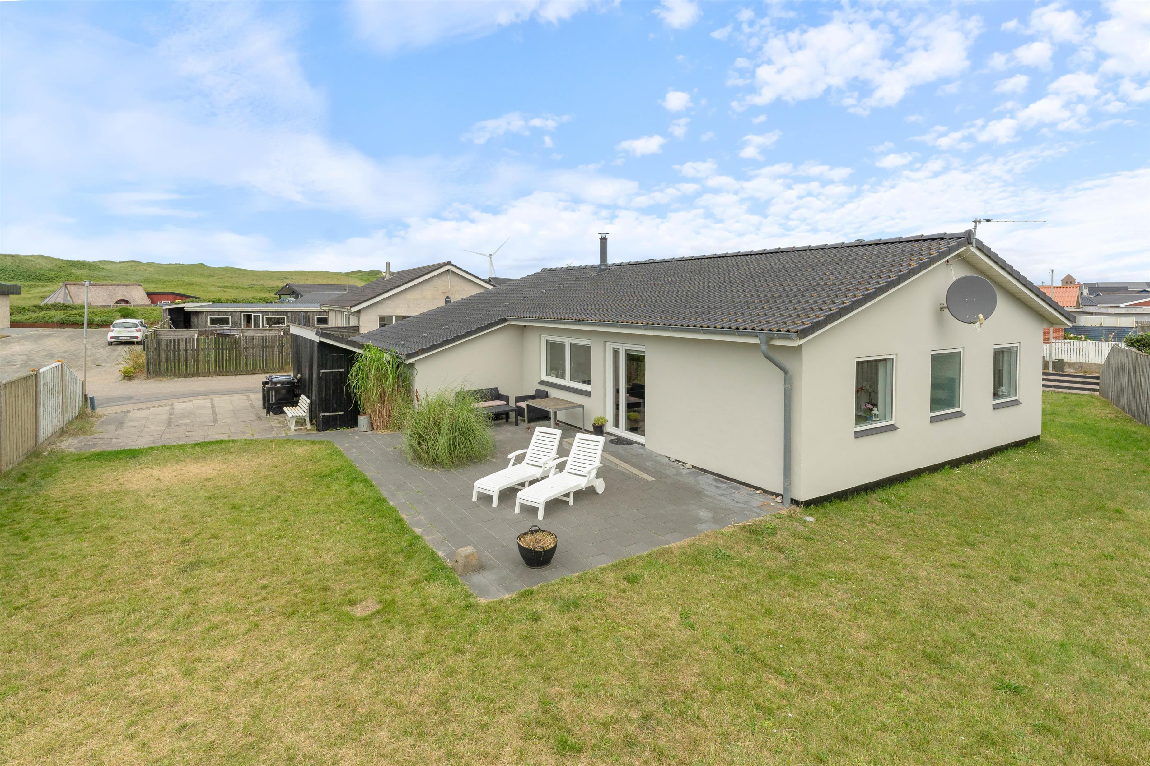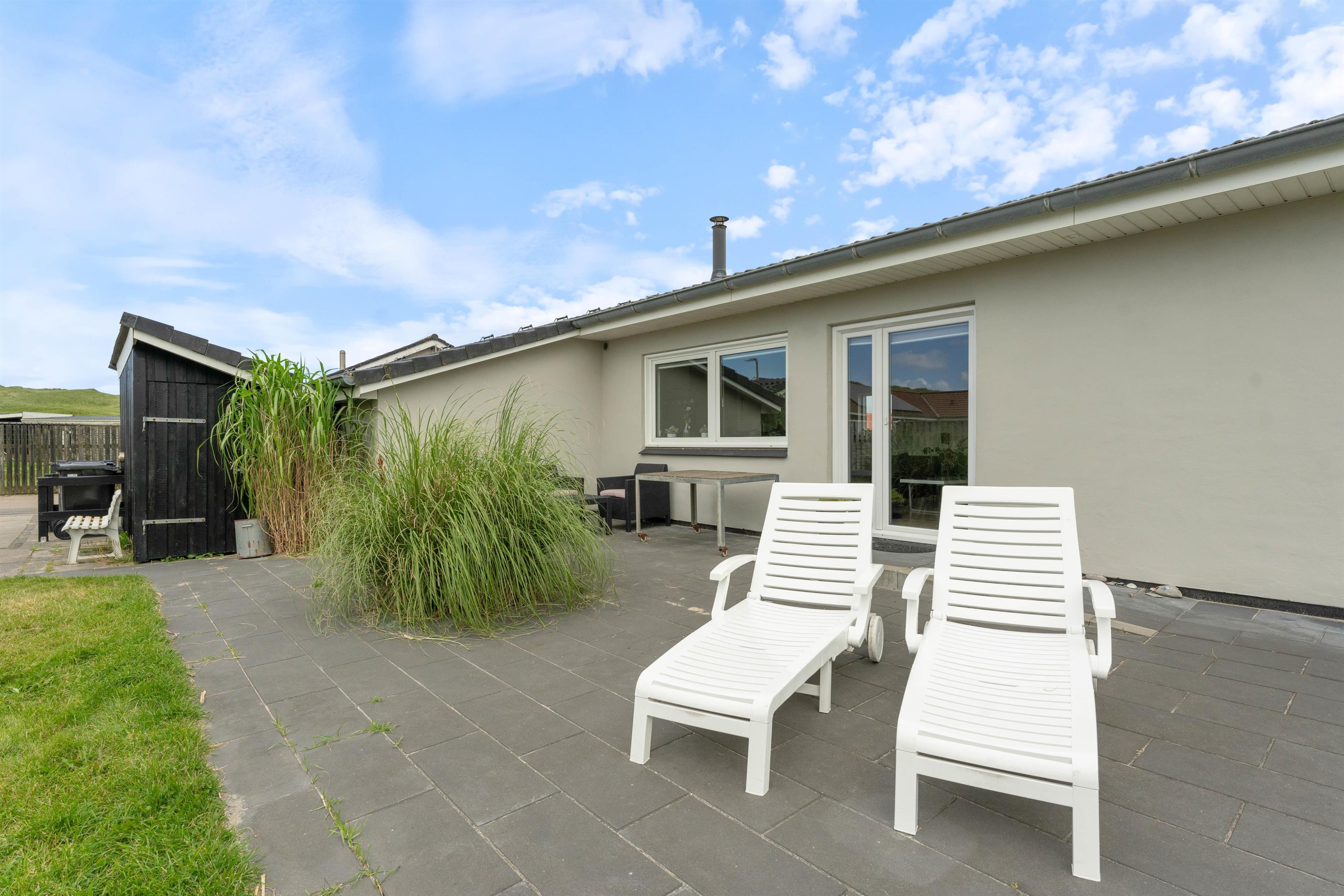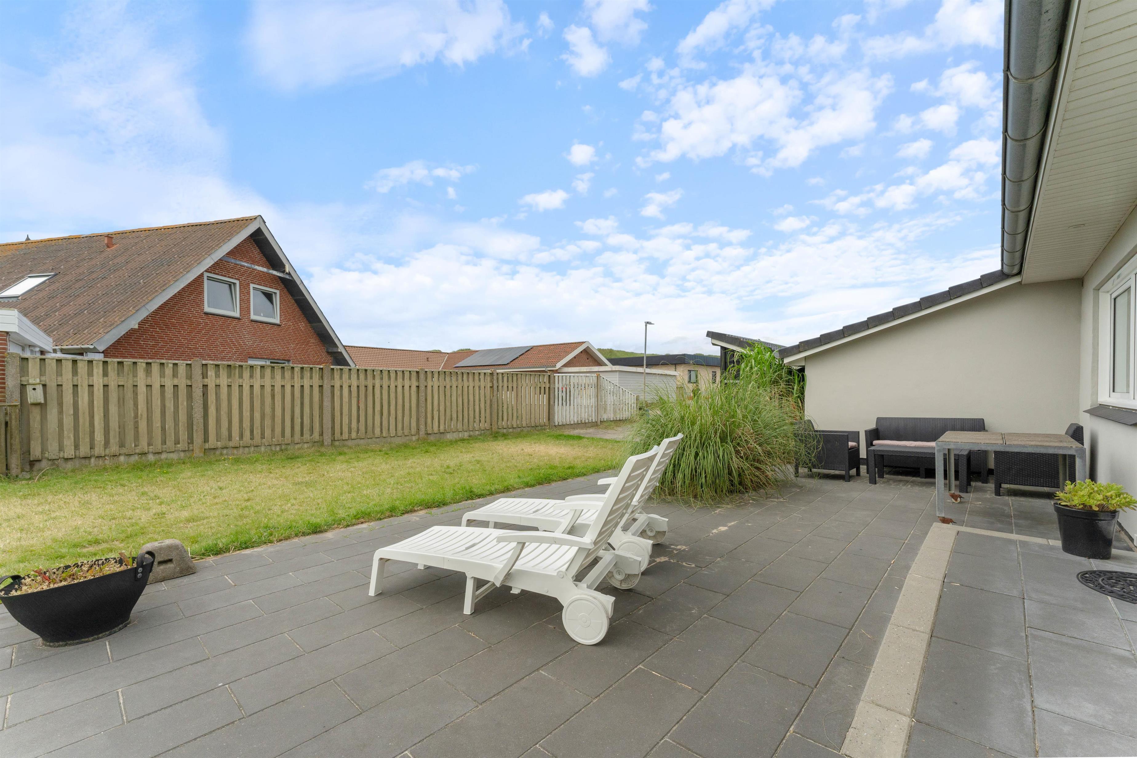 Fra stuen har I direkte udgang til den sydvendte terrasse, hvor I kan nyde dagen i solen. Her kan også spises et lækkert grillmåltid efter en god dag ved Vesterhavet. Stranden ligger kun 250 meter fra feriehuset, og her kan I gå lange ture, samle muslingeskaller eller bygge det største sandslot med børnene. Det kan også anbefales at se den smukke solnedgang fra første parket - måske med fødderne i vandkanten på en lun sommeraften.