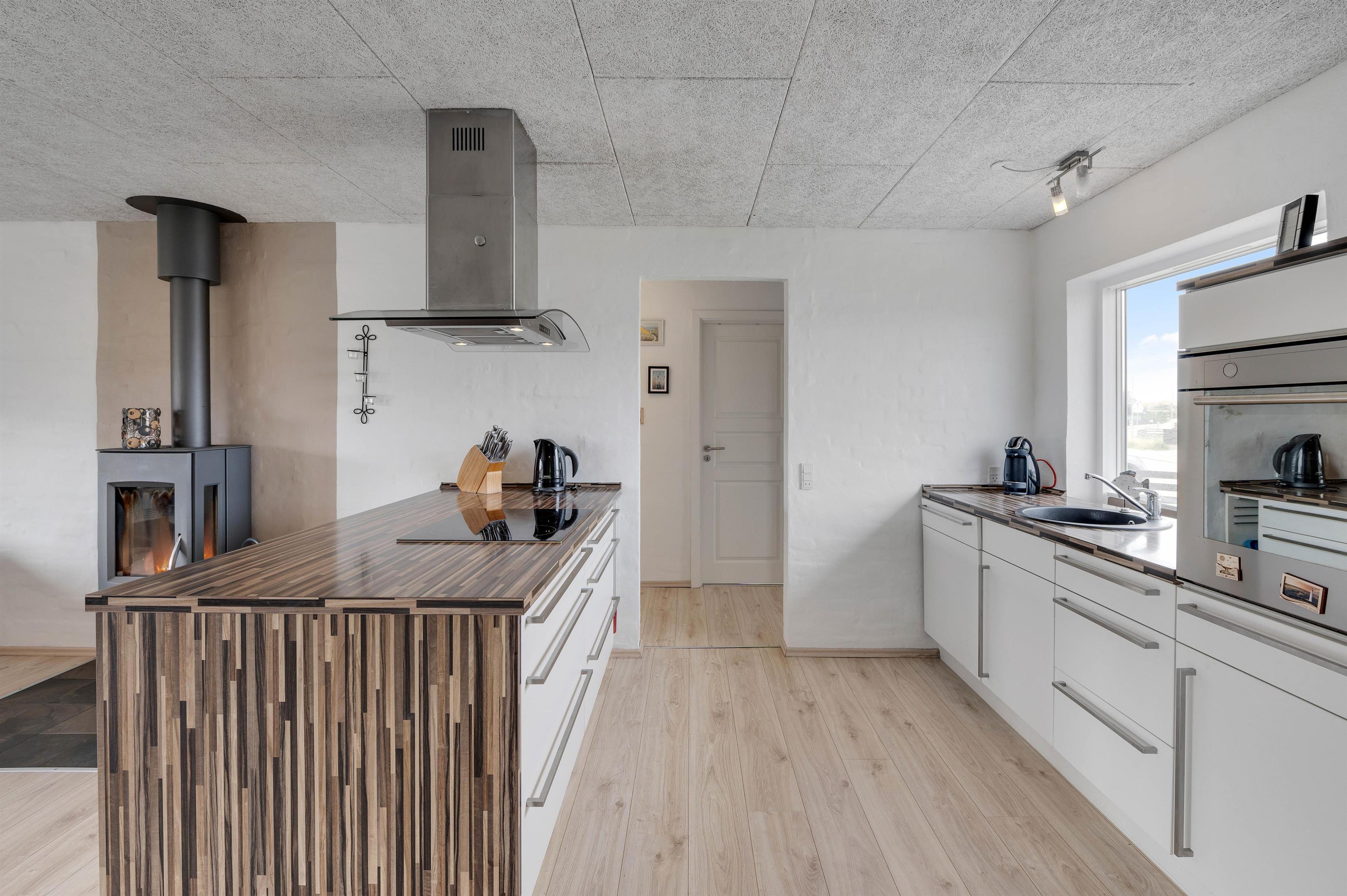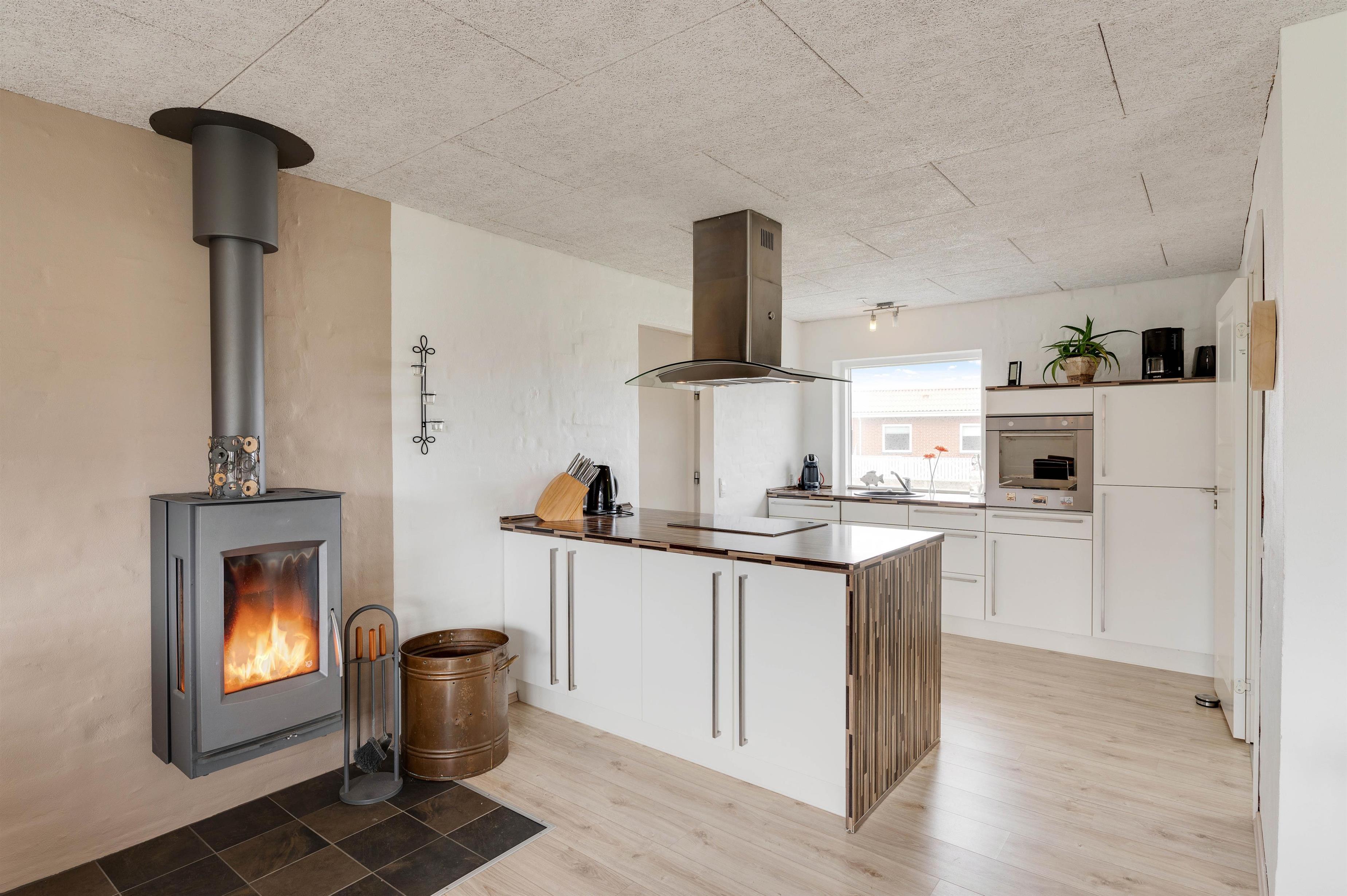 Stuen og køkken er i åben forbindelse, så hele familien kan samles – også når der skal laves mad. Her finder I en brændeovn, som spreder varme og ekstra hygge til ferien, når I for eksempel tager et spil kort eller nyder en kop kaffe.
