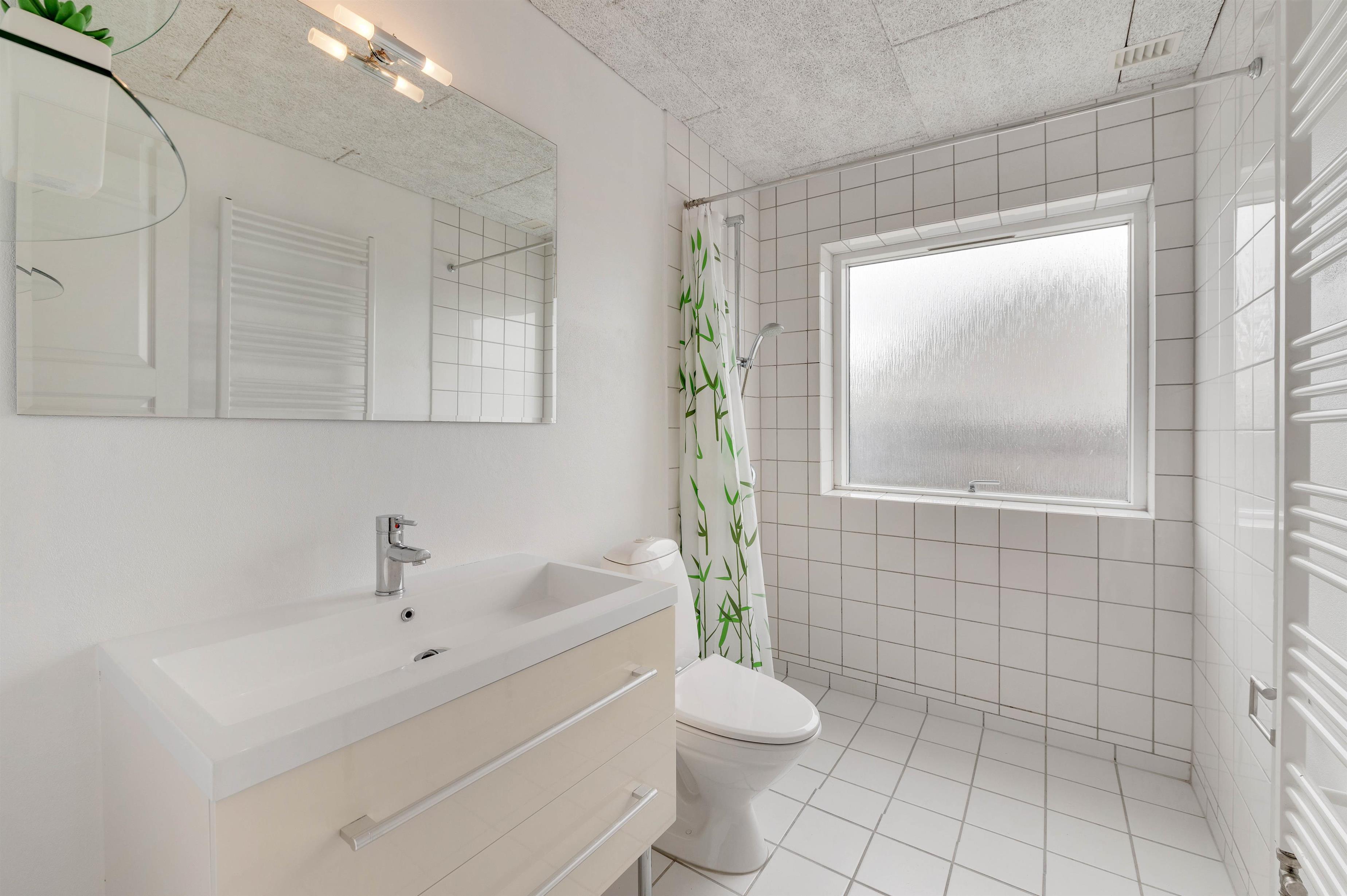 Feriehuset har 1 badeværelse samt 1 gæstetoilet. Der er altså ingen grund til bekymring for lang kø til toilettet om morgenen. Her er desuden også vaskemaskine og tørretumbler, så I har mulighed for tøjvask under ferien.