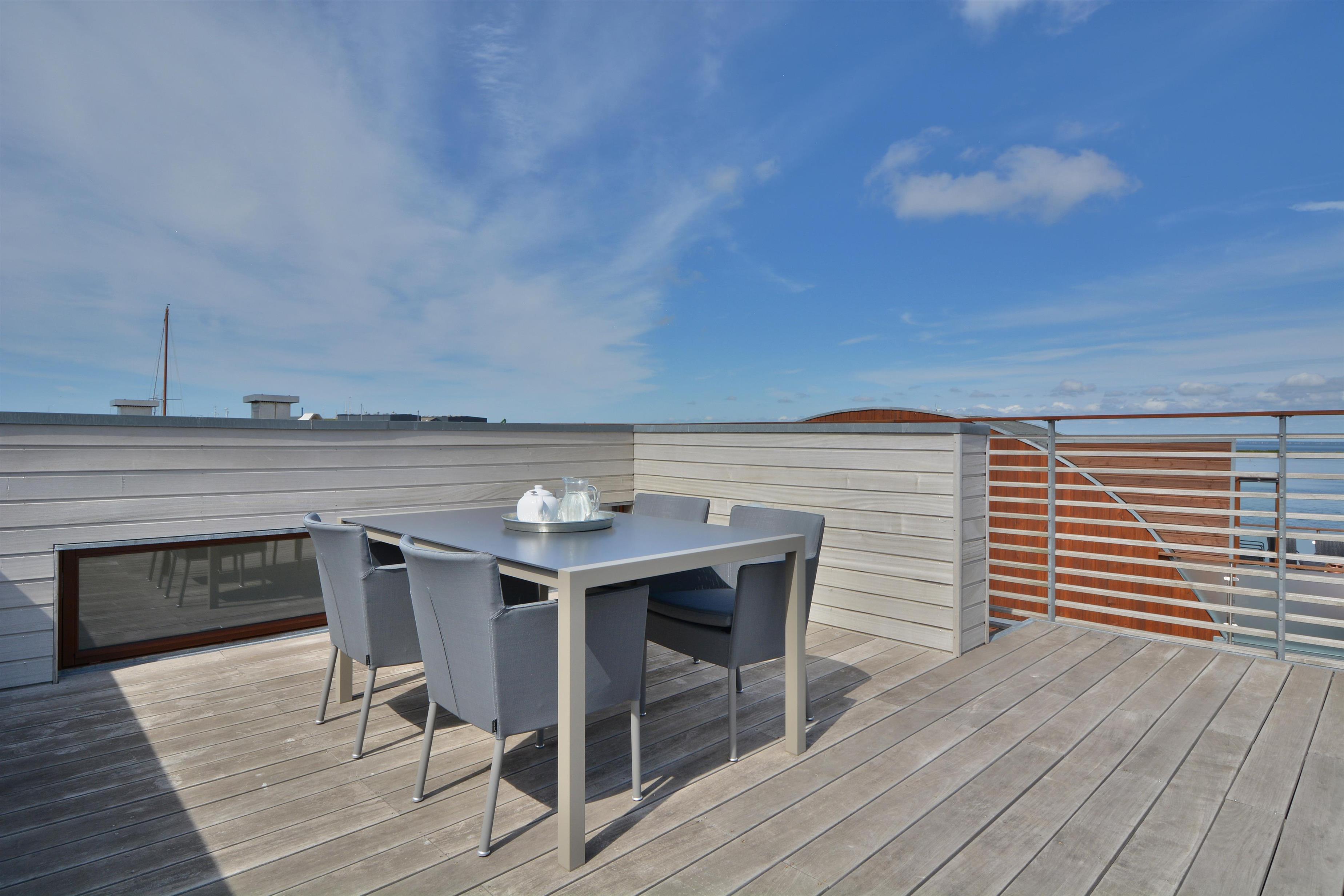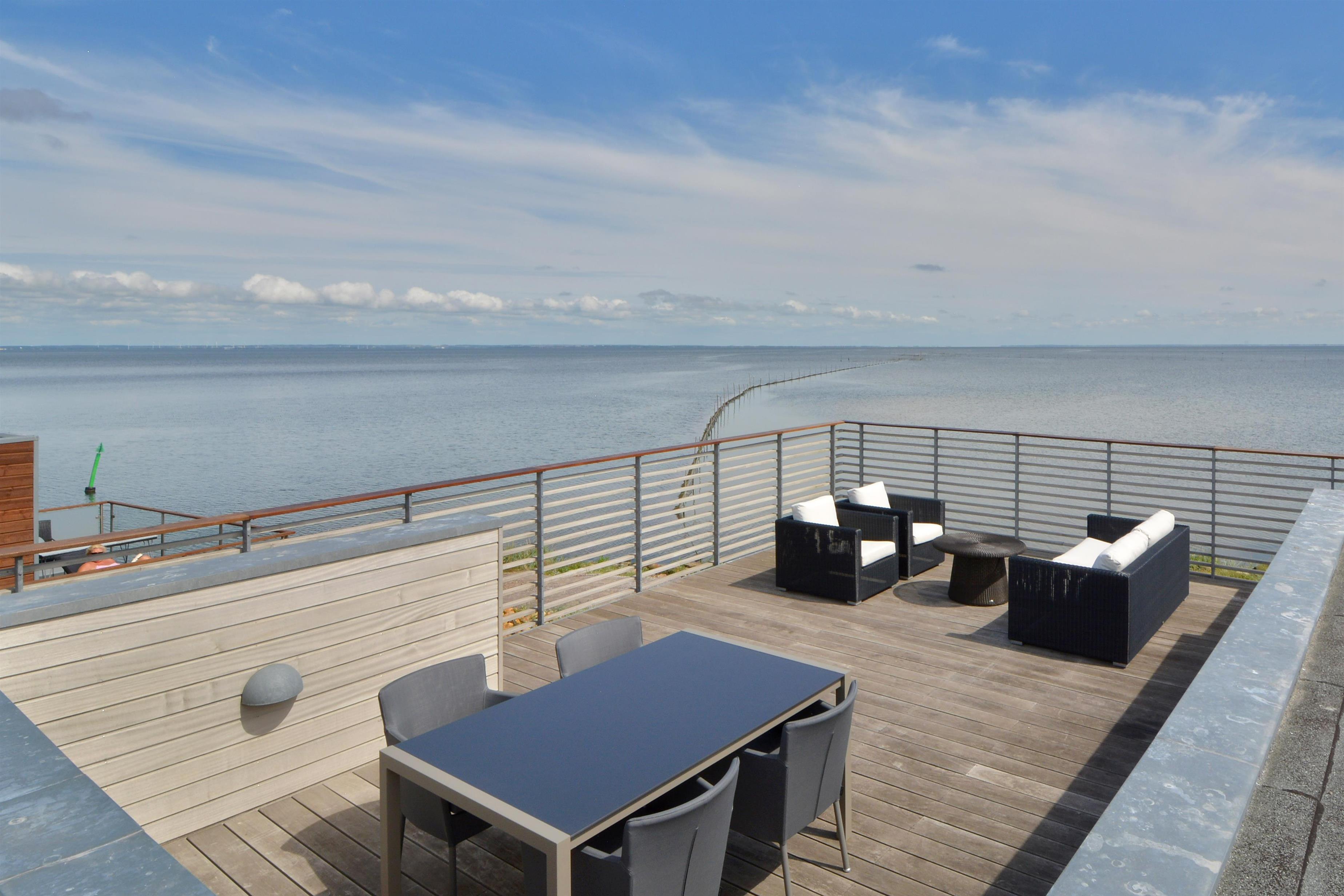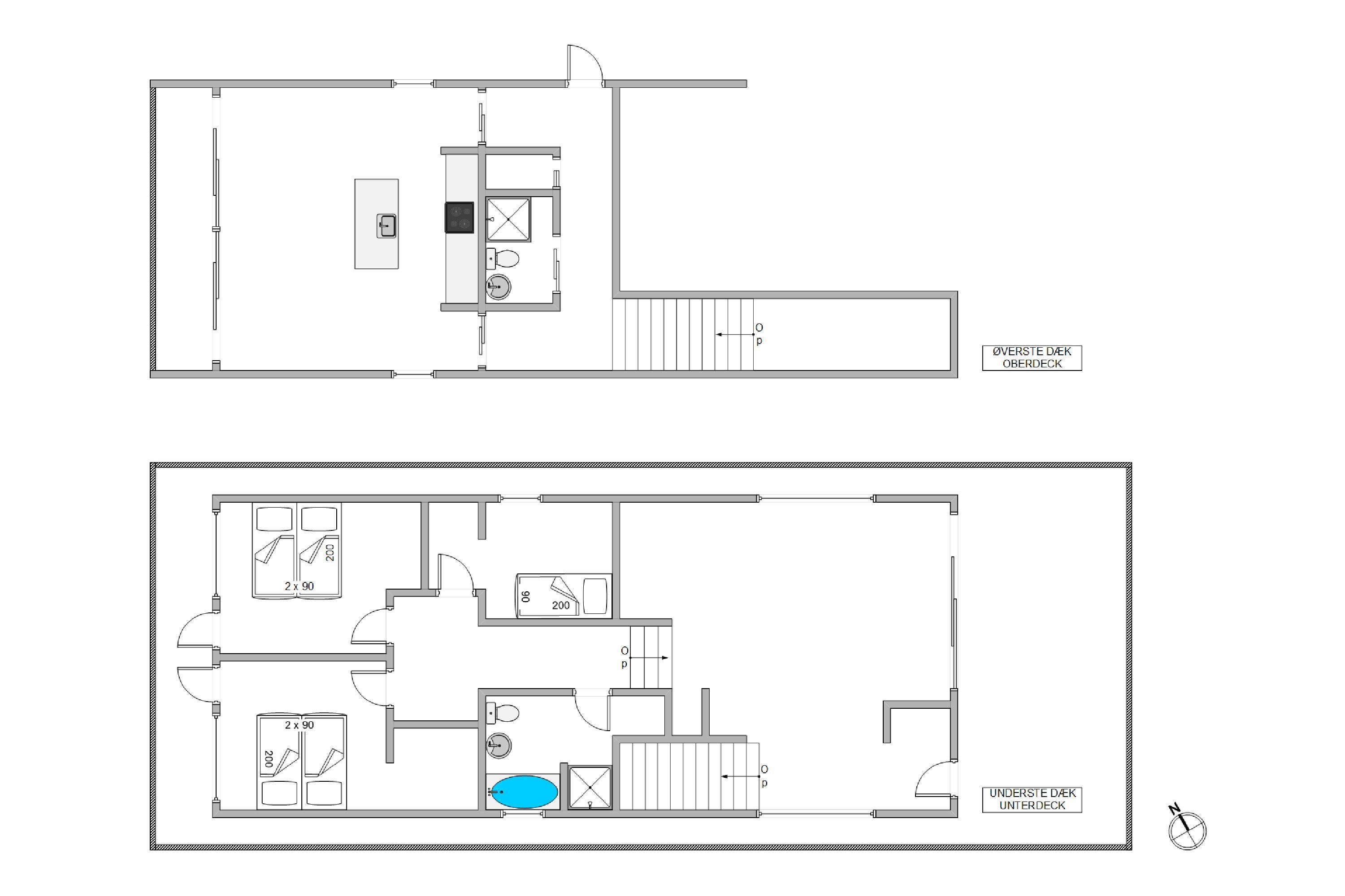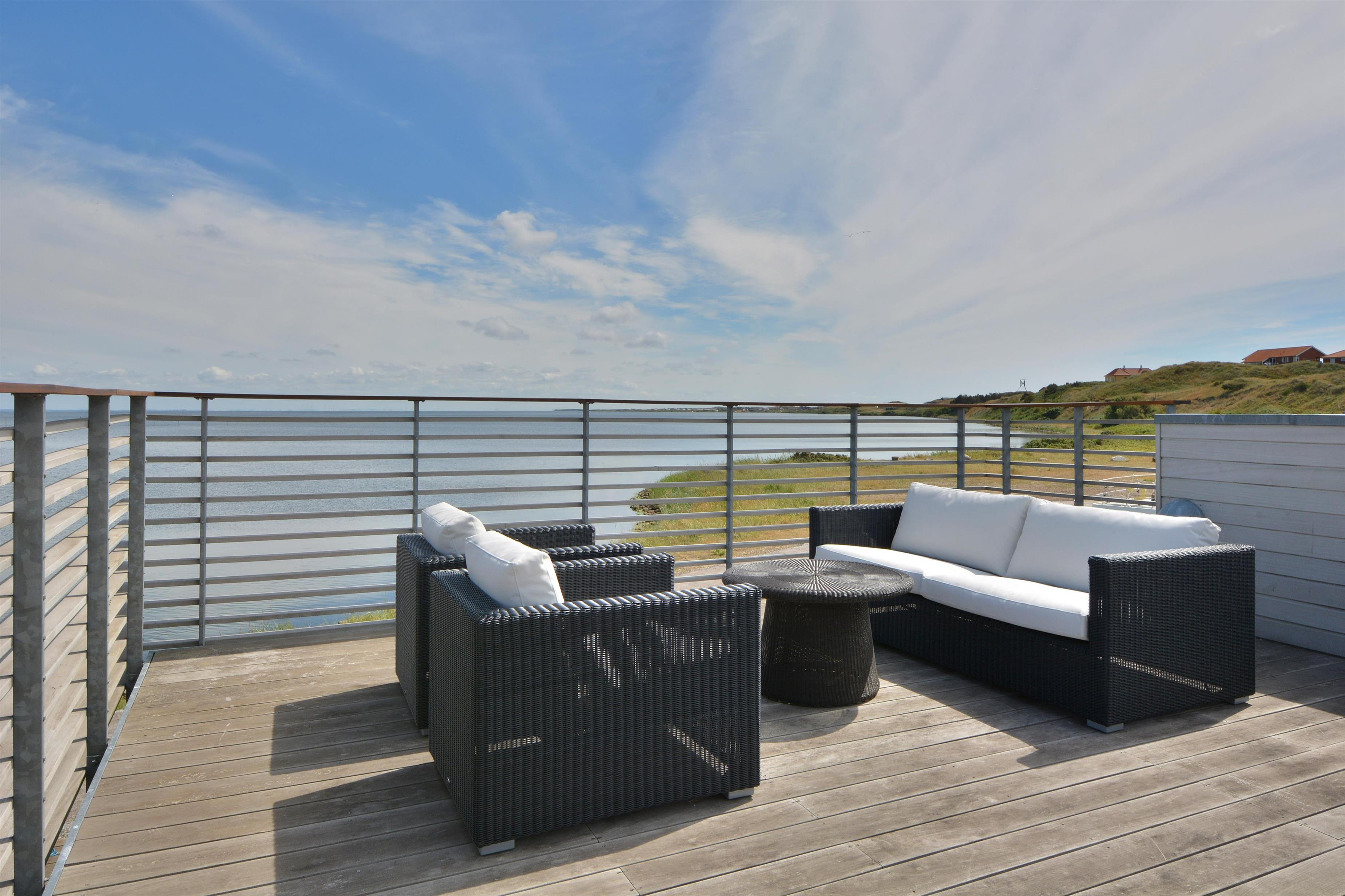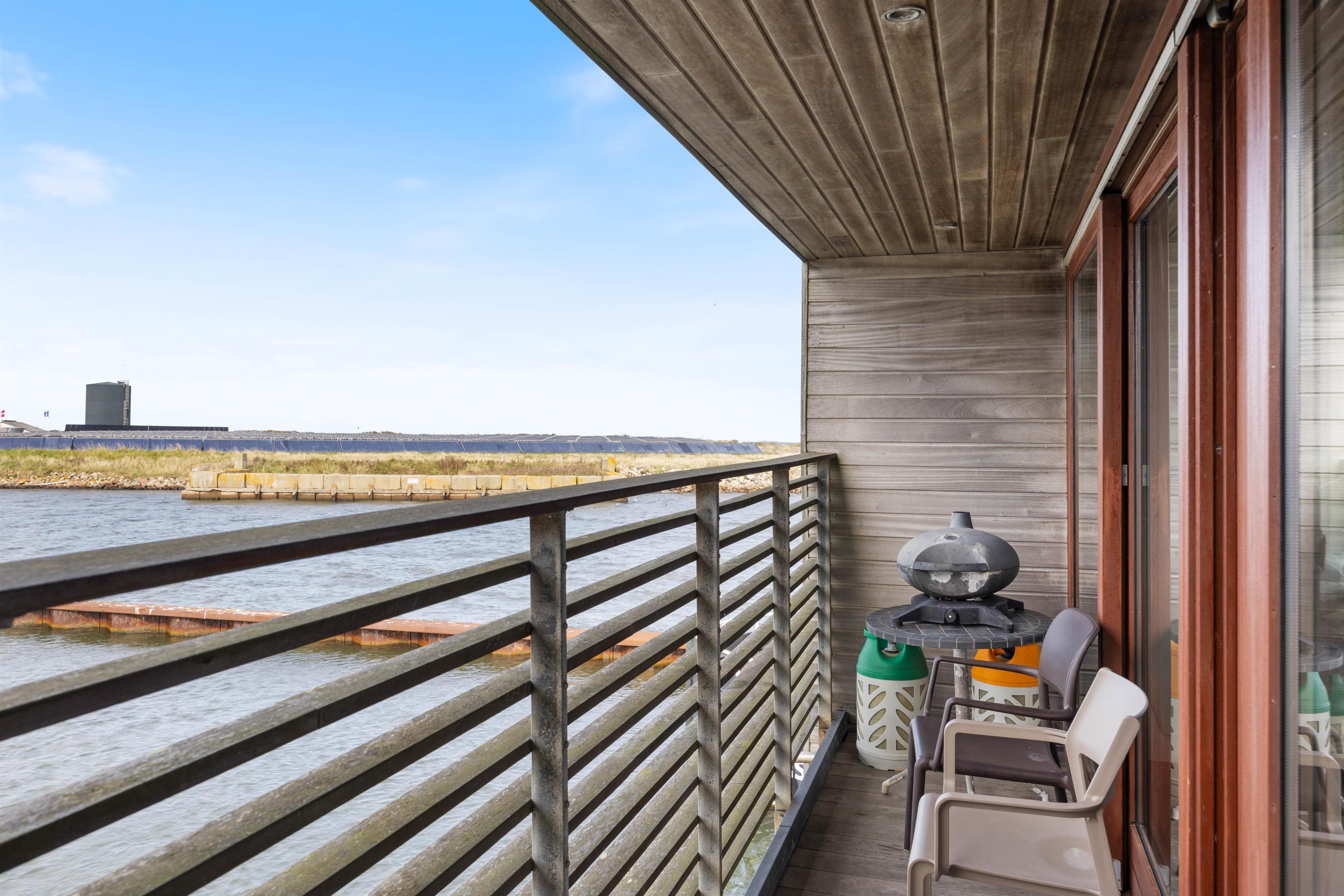 Husbåden har også terrasser på begge plan. Nederst er der en mindre terrasse og øverst er der en noget større, som også er delvist afskærmet. Og her kan I nyde en smuk udsigt over fjorden og Hvide Sande havn, - og måske nyde en grillmiddag, tilberedt på bådens gasgrill.