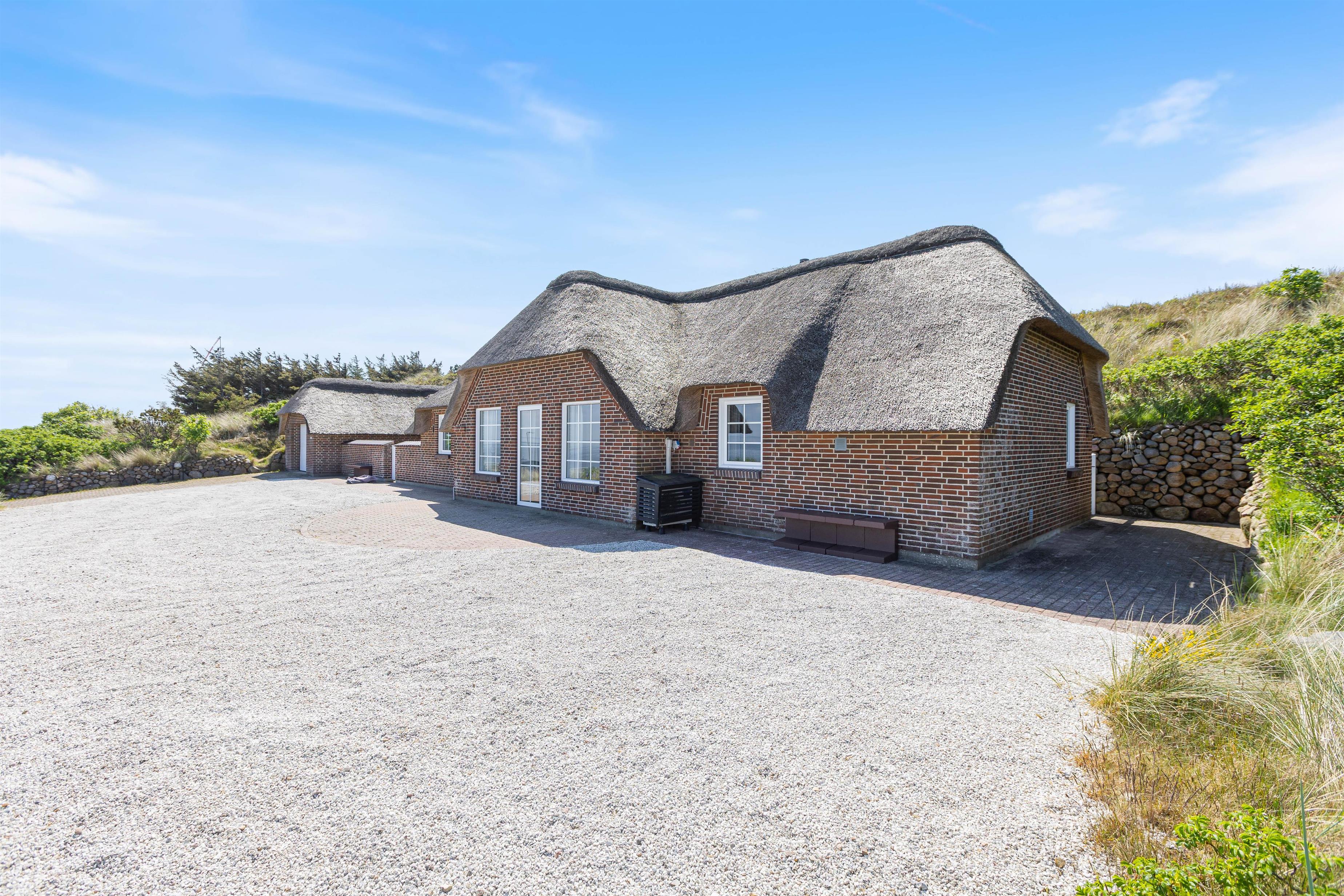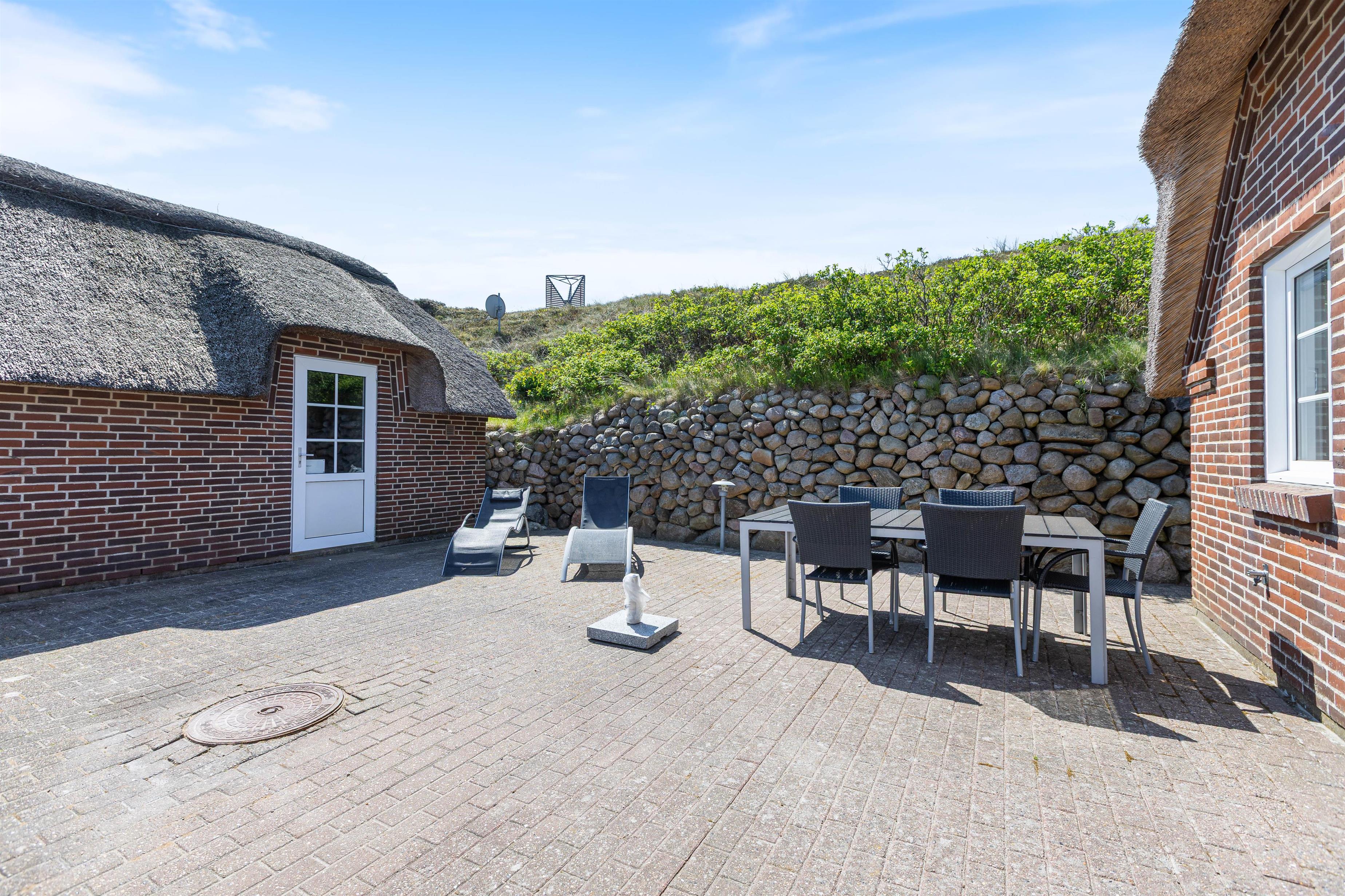 Den lukkede terrasse er primært mellem garagen og huset, og her er man helt for sig selv. Huset er placeret højt, og den store klit mod vest giver både privatliv og læ. Den flotte stensætning op mod klitten viser den detaljeorientering, som er kendetegnende for huset. Foran huset mod øst er der en åben terrasse, som er velegnet til brug i formiddagstimerne.
