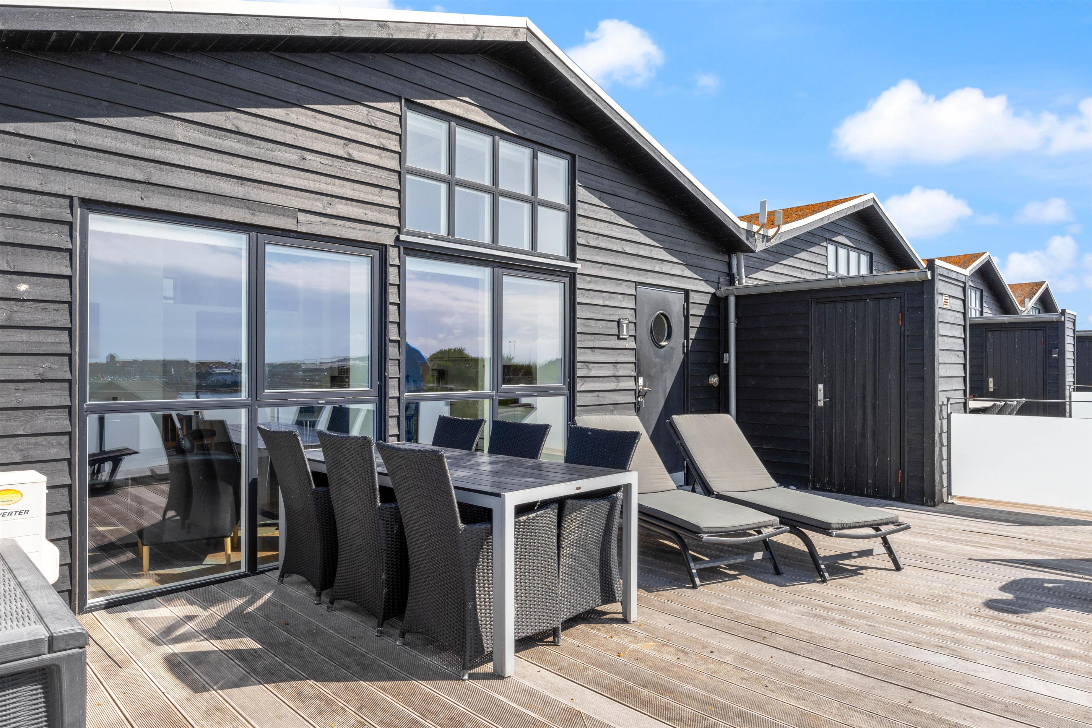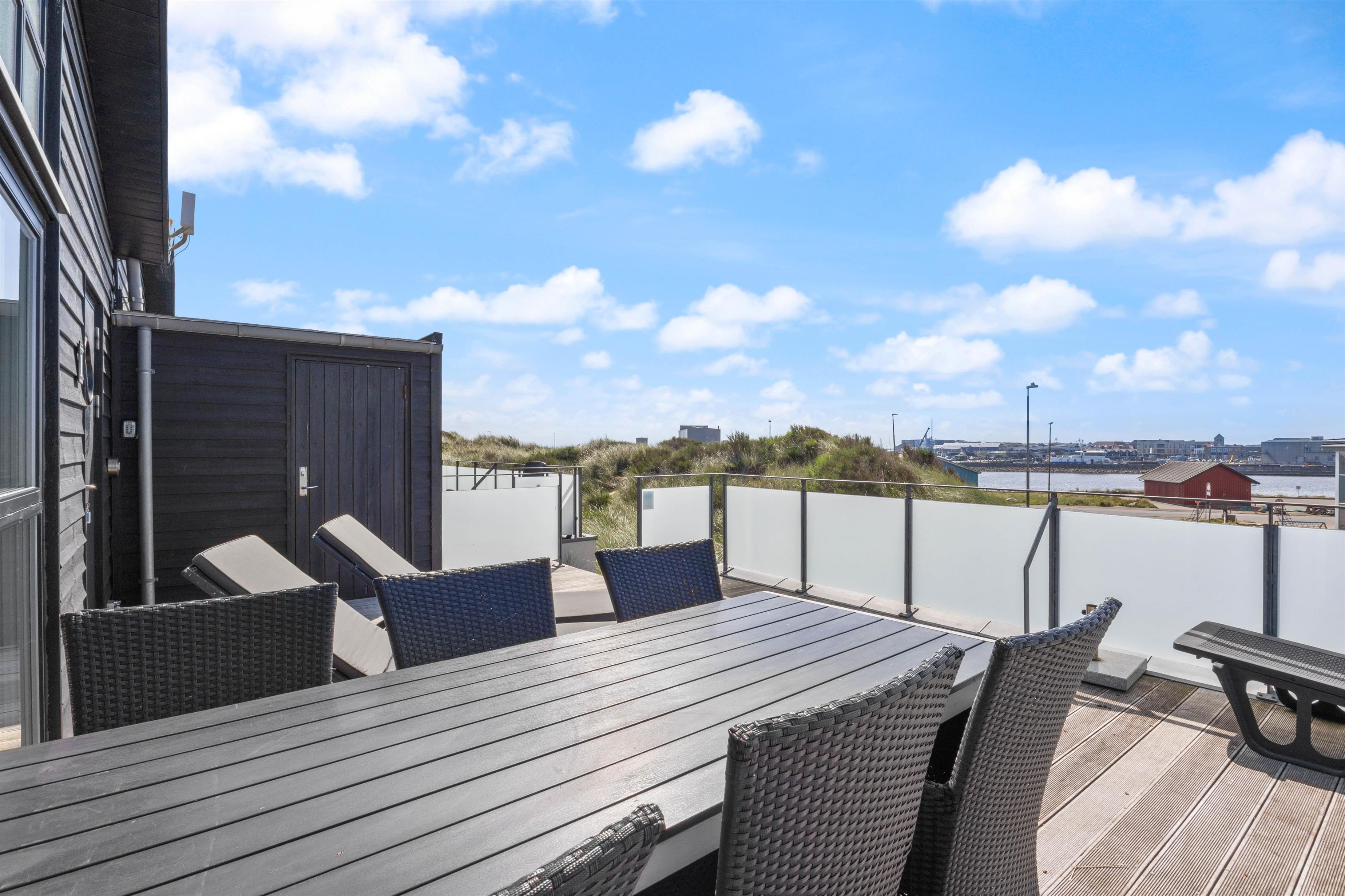 Nyd en afslappende stund på den lækre sydvendte terrasse. Tænd op i grillen og lav et lækkert grillmåltid og hæld rødvin i glassene, mens I nyder udsigten til Vesterhavet og måske en smuk solnedgang. Om dagen kan I nyde solskinnet fra liggestolene og følge med i livet på havnen og ved slusen
