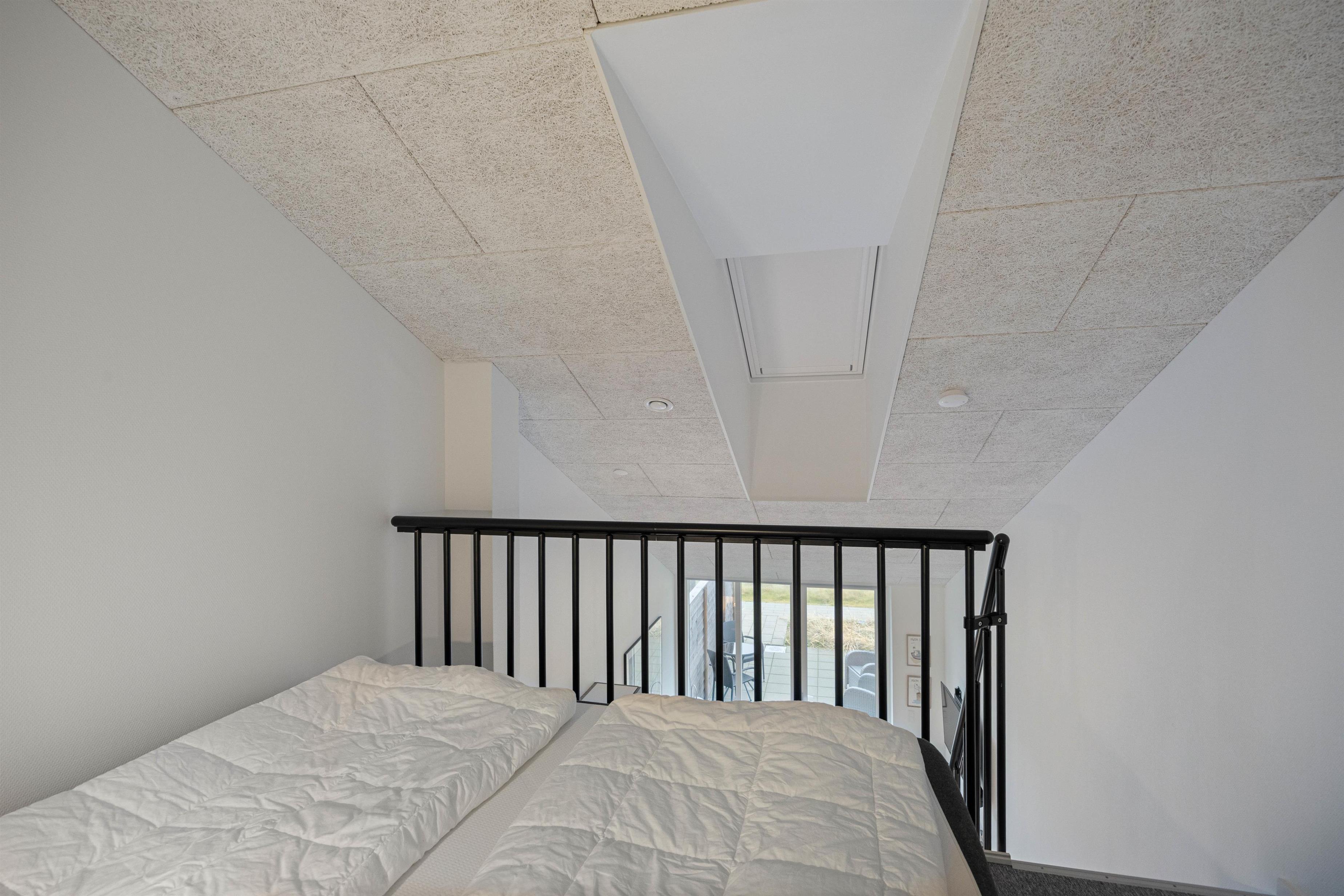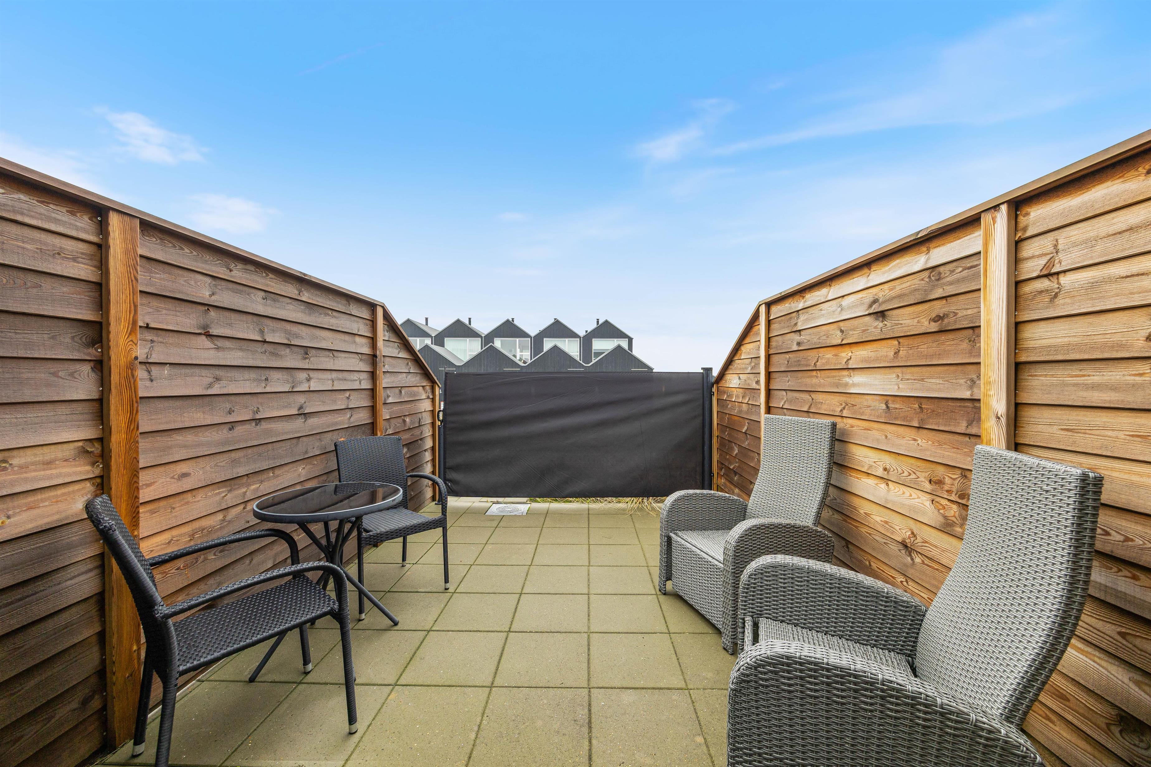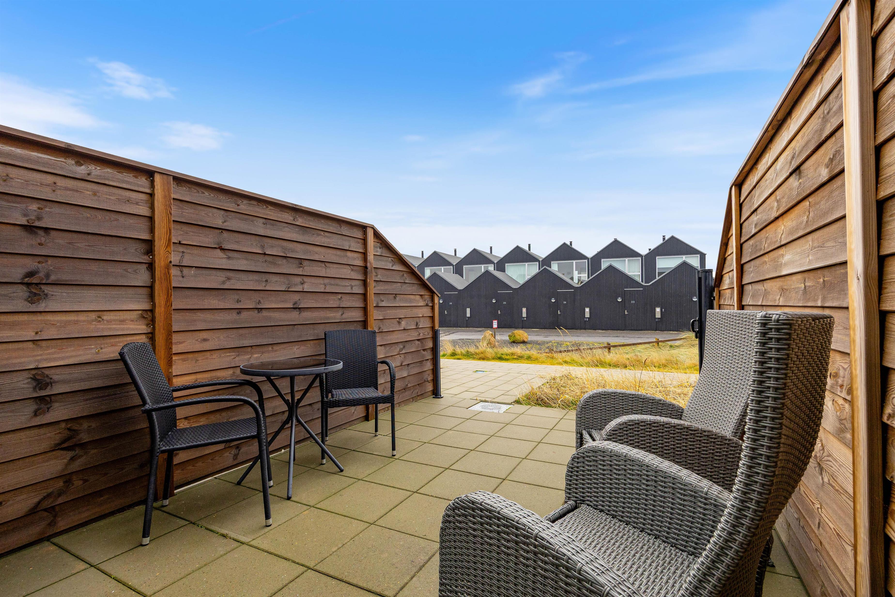 Terrassen er åben og delvist afskærmet, hvilket gør det til et perfekt sted at søge hen med sin morgenkaffe. Herfra kan man nyde udsigten over ferielejlighederne, og måske man kan spotte Ringkøbing Fjord mellem husene.