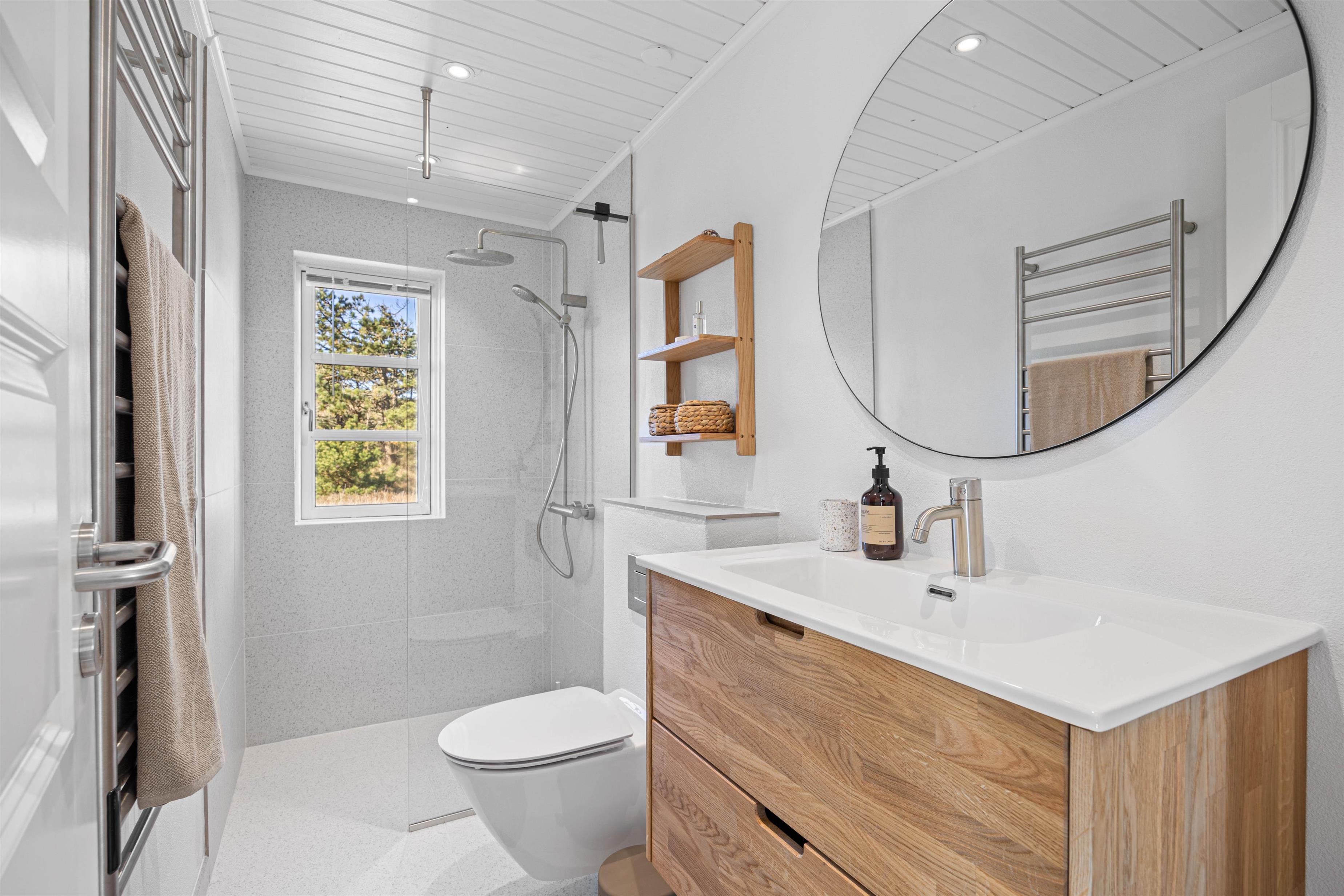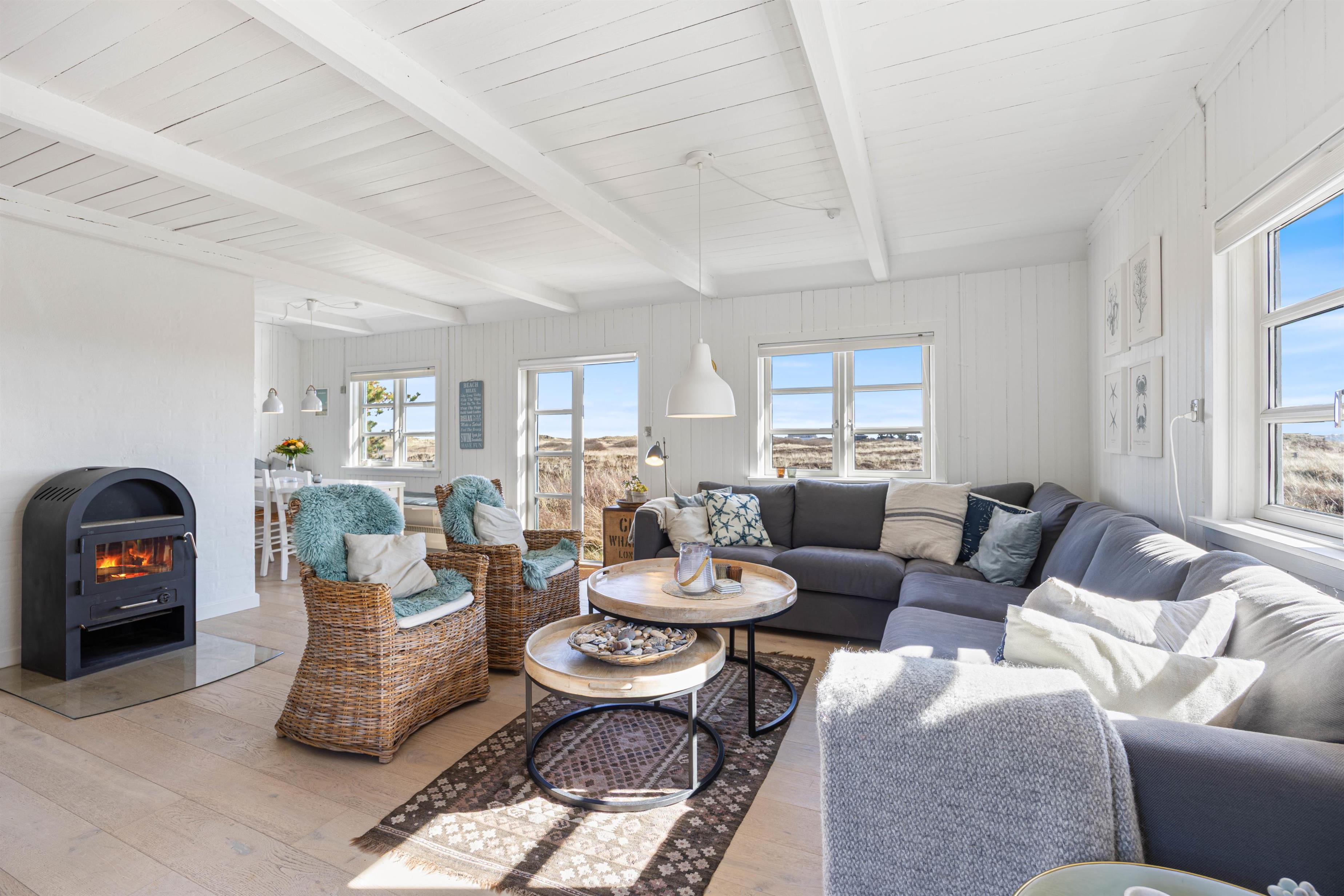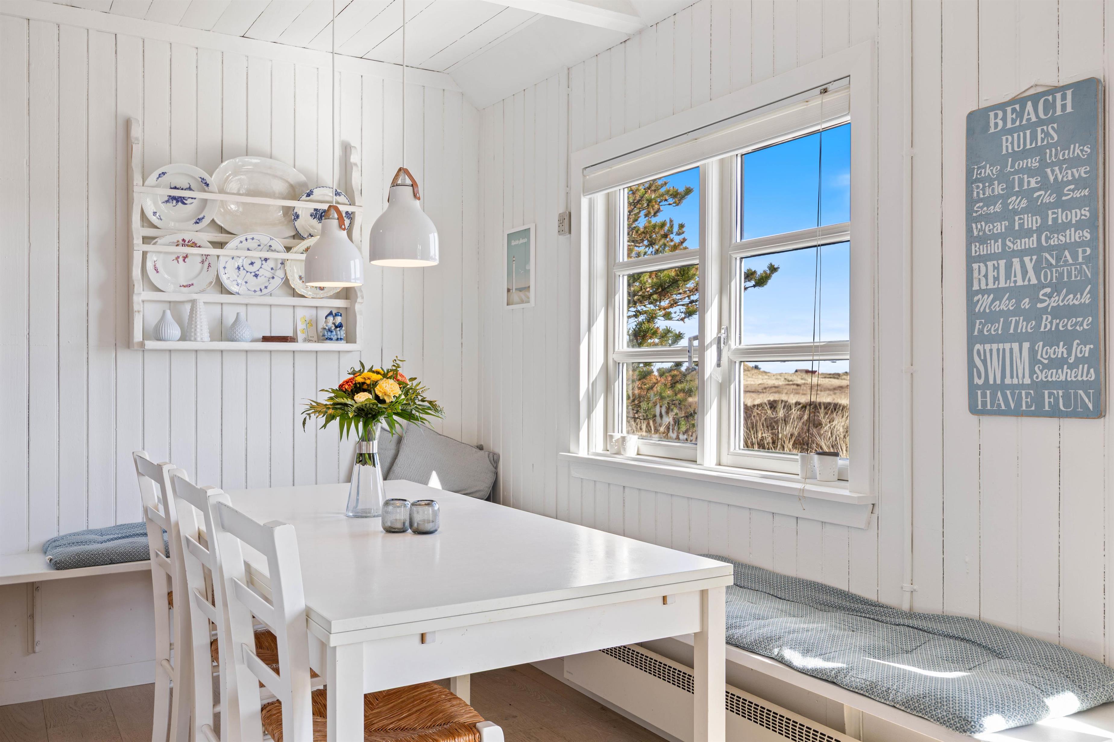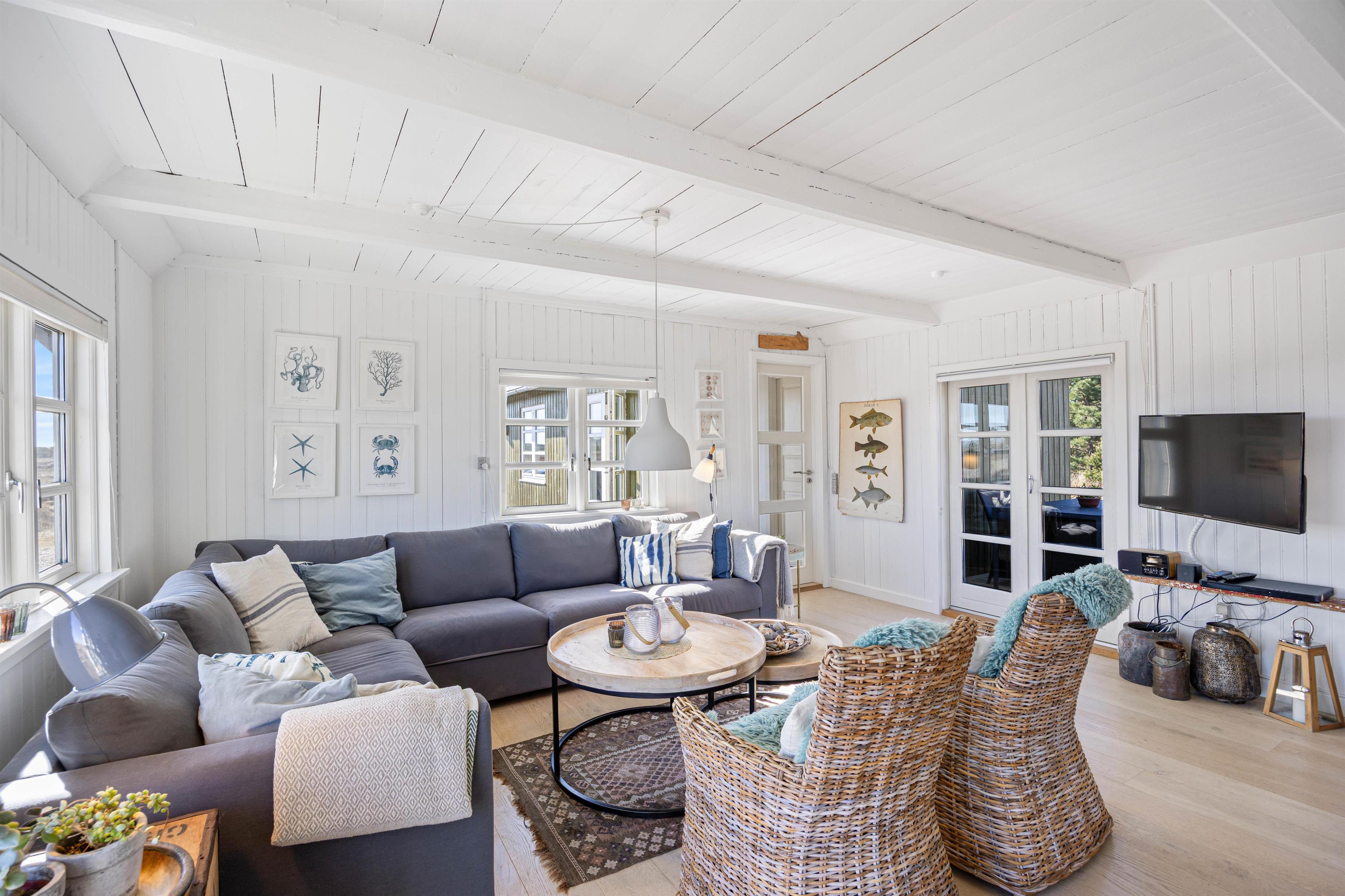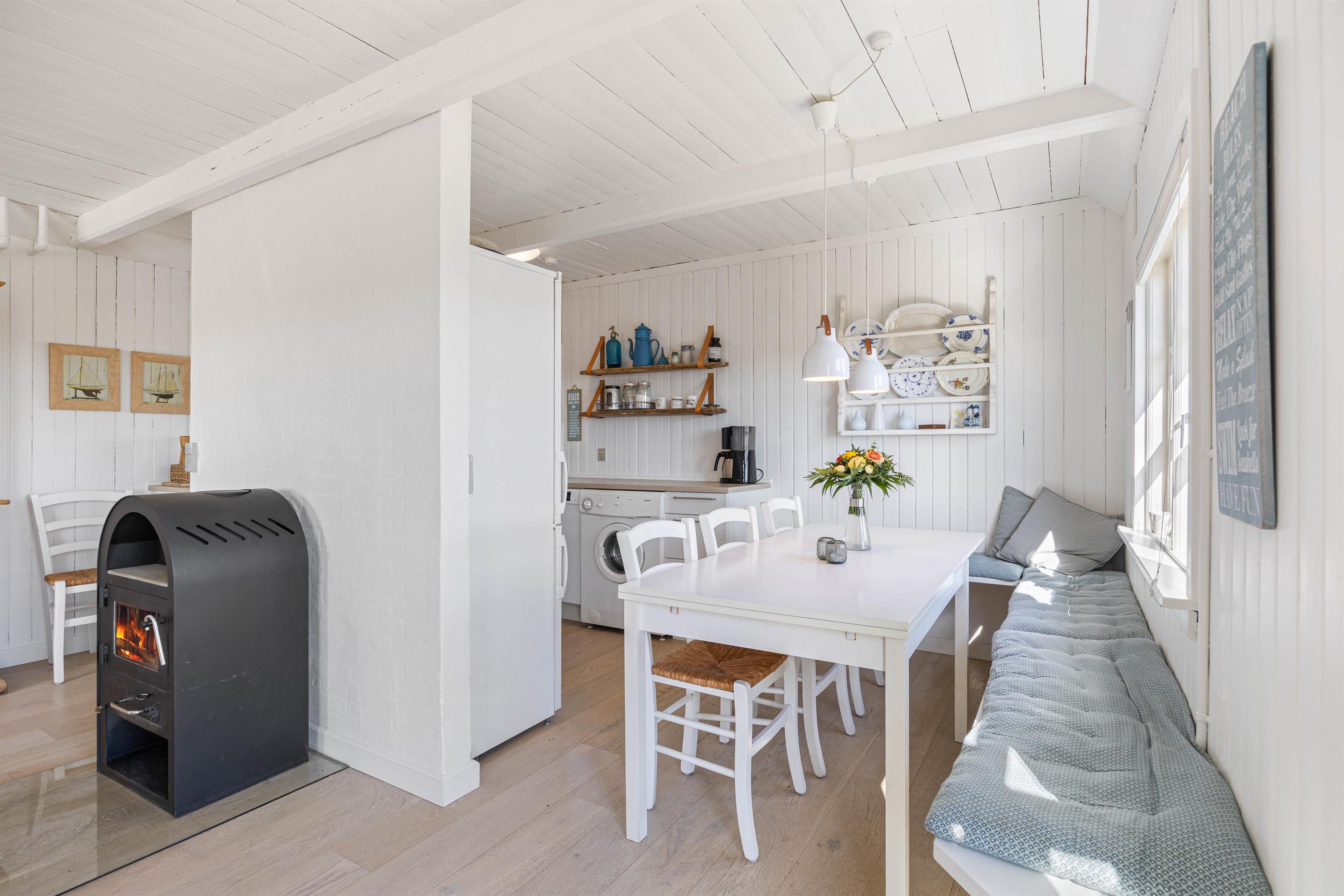 Sommerhuset er opført i klassisk sommerhusstil med træbeklædt facade og træterrasse. Indvendigt er træværket og de synlige loftsbjælker malet hvide. Det skaber i kombination med de rå trægulve og rustikke elementer i interiøret en god og luftig atmosfære i huset. Rundt i hele huset finder du små maritime elementer, som passer godt til husets placering mellem fjord og hav. Huset er desuden indrettet komfortable møbler og i rolige farver – og her er god plads til jeres lille familie. Husets leverum, stue og køkken i åben forbindelse, gør det nemt at være sammen, selvom børnene spiller i stuen og der laves mad i køkkenet.