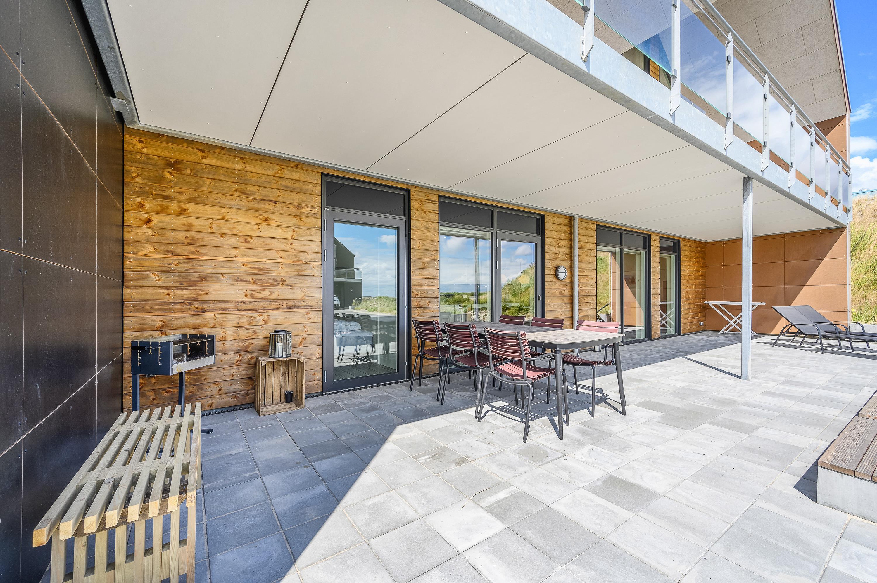 På den store, sydvendte og delvis overdækkede, terrasse lige udenfor stuen – og i vandkanten – kan man virkelig nyde naturen og fiskerbyen Hvide Sande her.