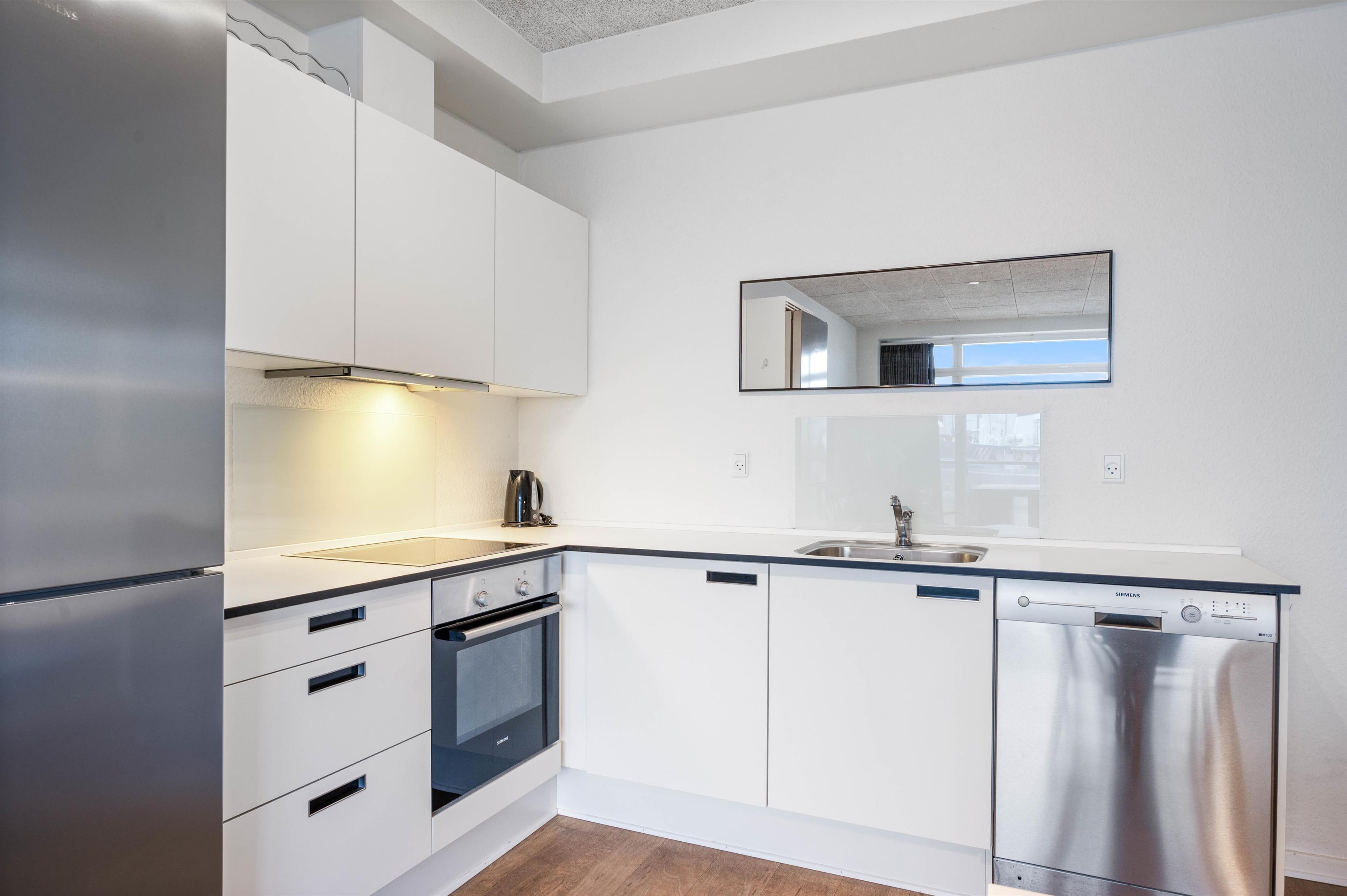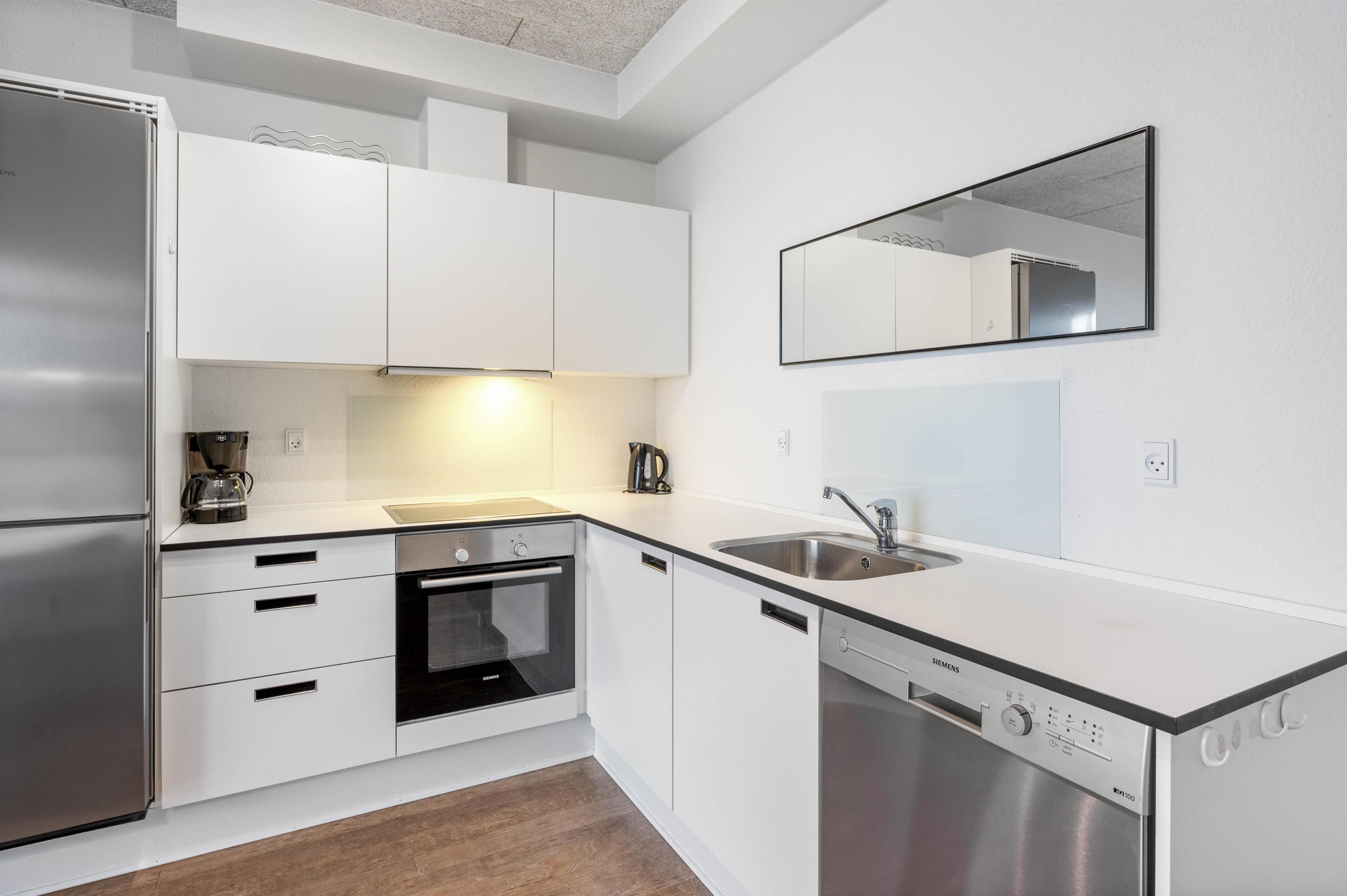 Stue, køkken og spiseafdeling flyder sammen i ét stort opholdsrum, og i det veludstyrede køkken finder I en opvaskemaskine, mens badeværelset er udstyret med vaskemaskine og tørretumbler - her er altså tænkt på det praktiske for jer.