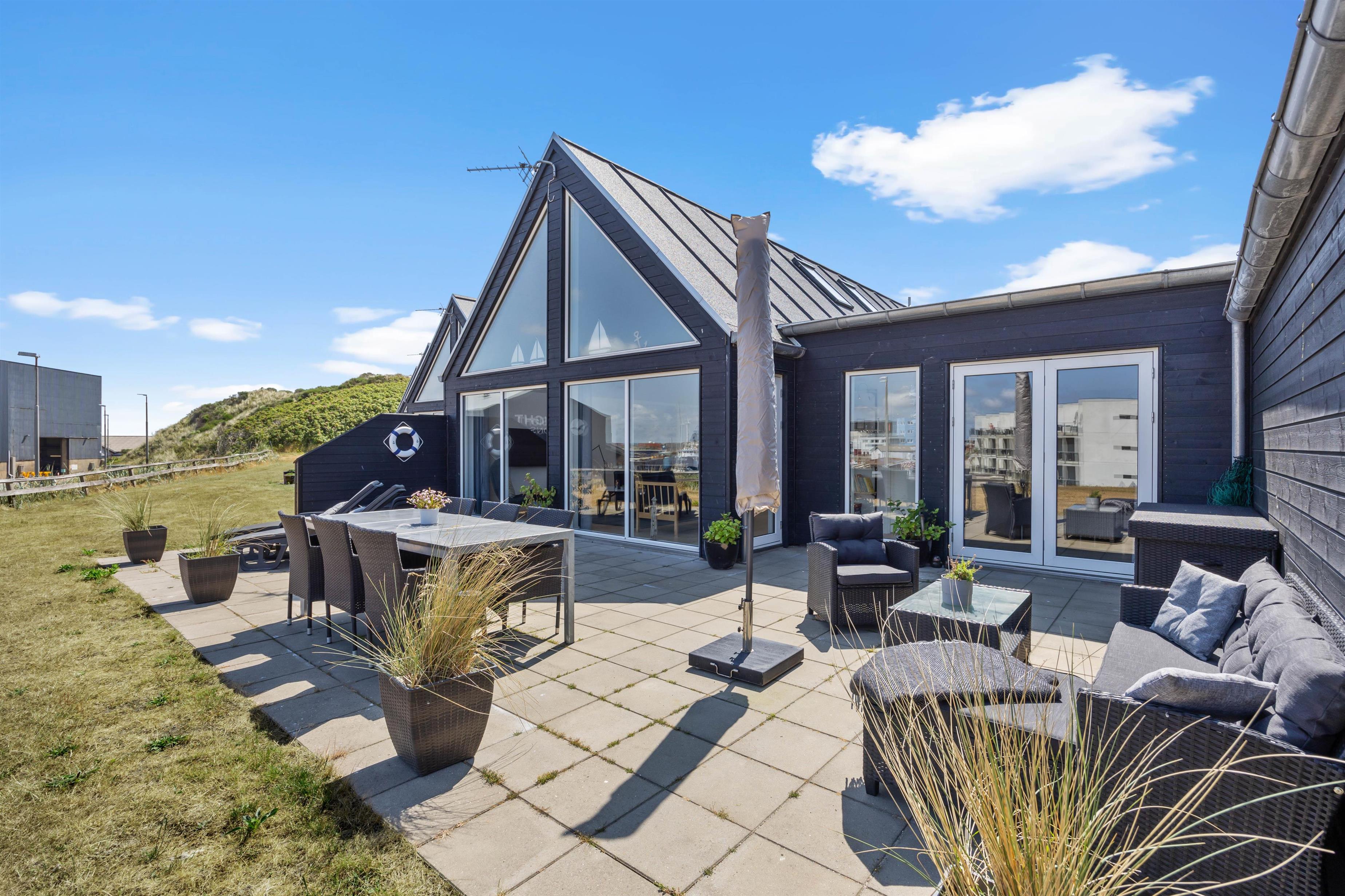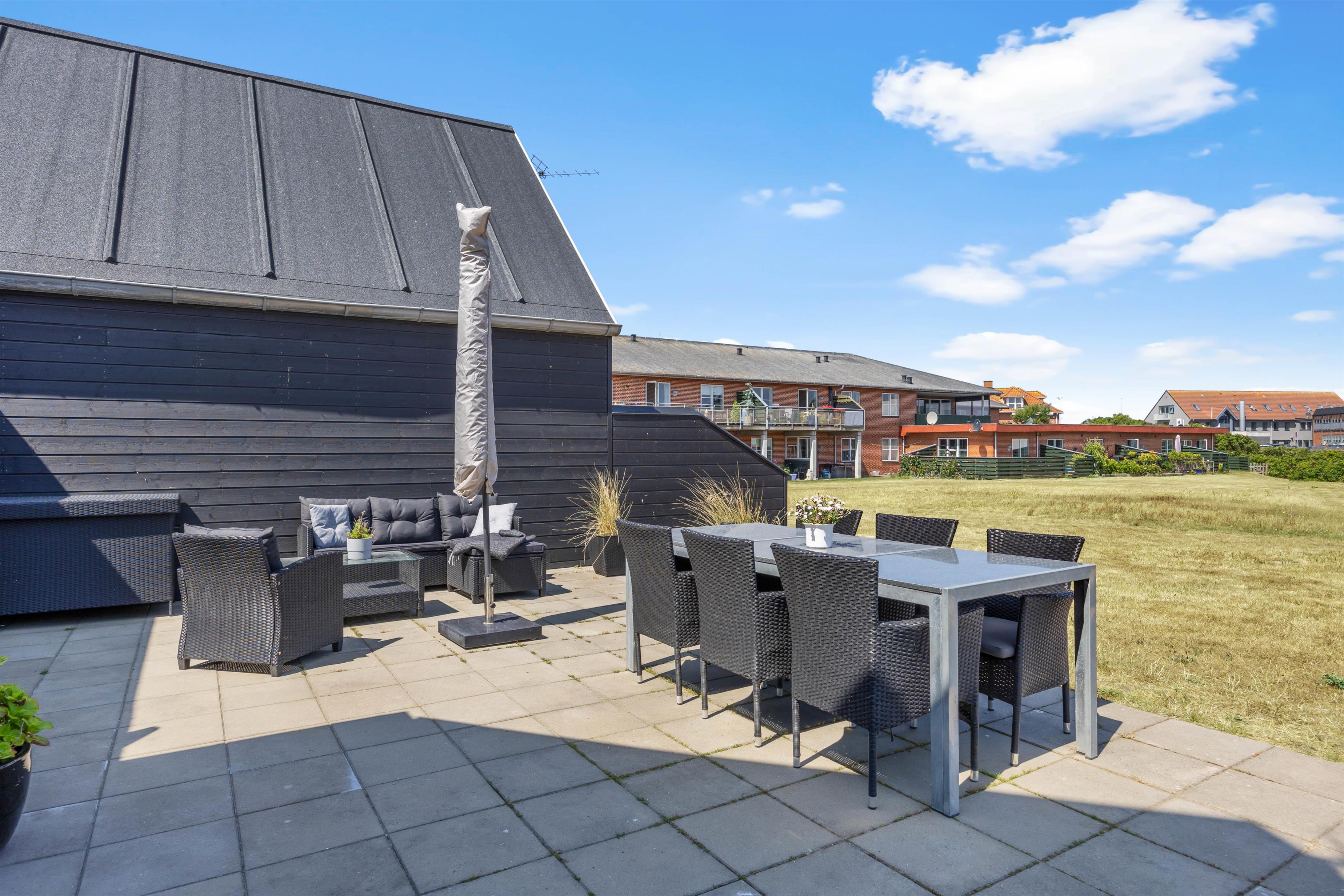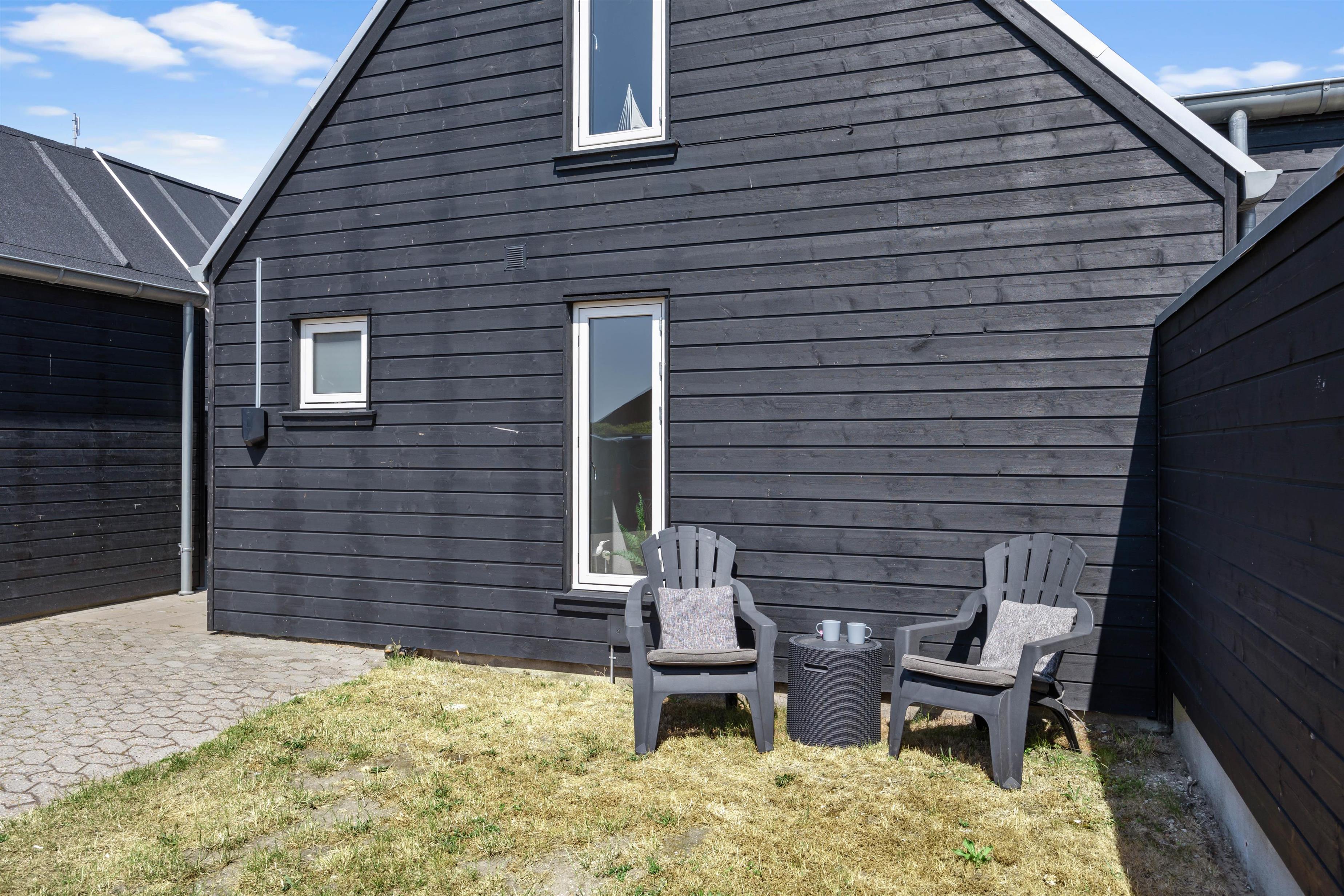Mod syd er der en helt lukket terrasse. Her kan I slappe af helt ugeneret og nyde en skøn grillmiddag, måske med friskfangede fisk fra havnen, tilberedt på gasgrillen. Nyd middagen i skæret fra den smukke aftenhimmel. Udenfor vil I fra april til november kunne nyde et forfriskende skyl under udebruseren.
