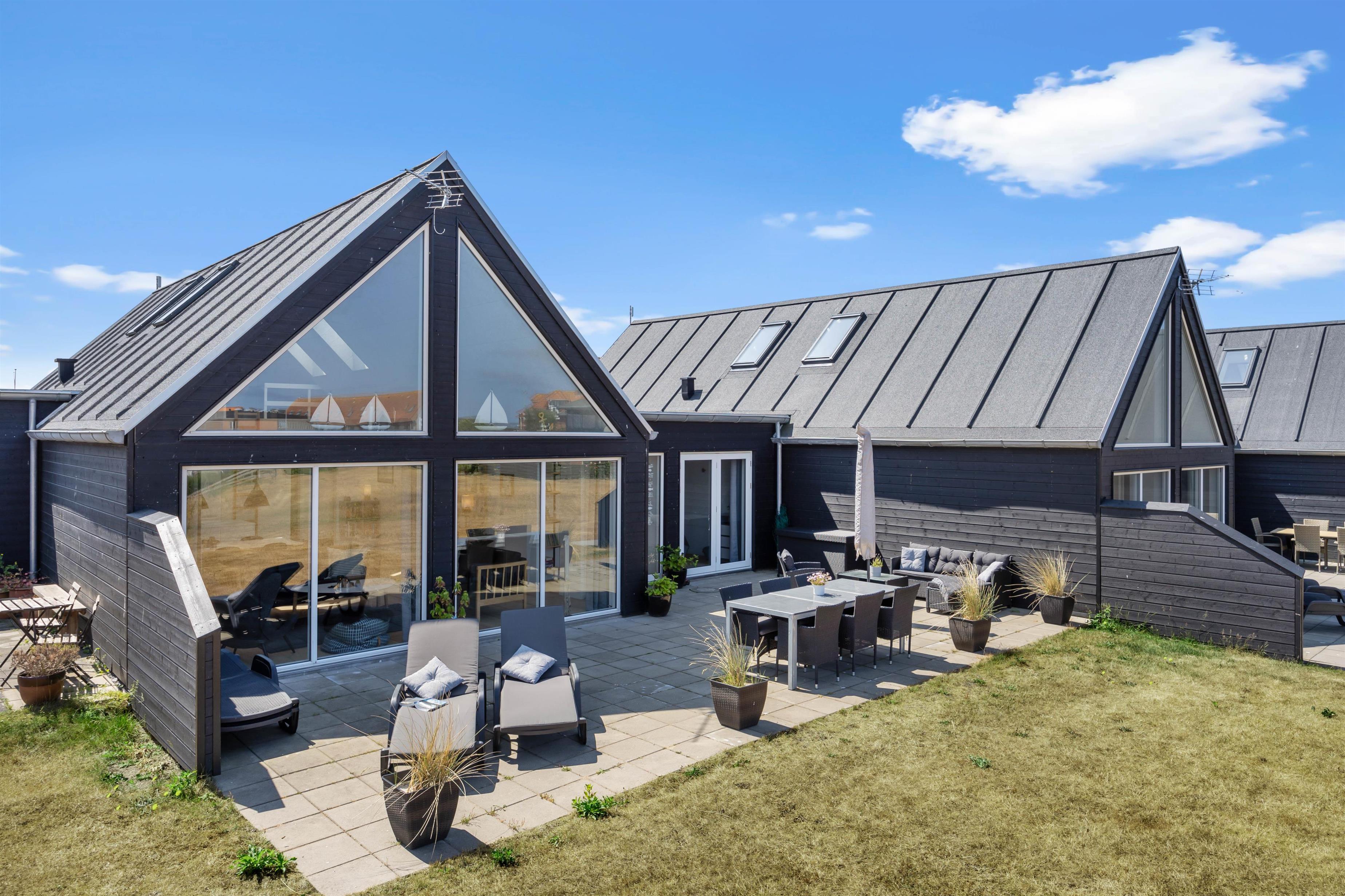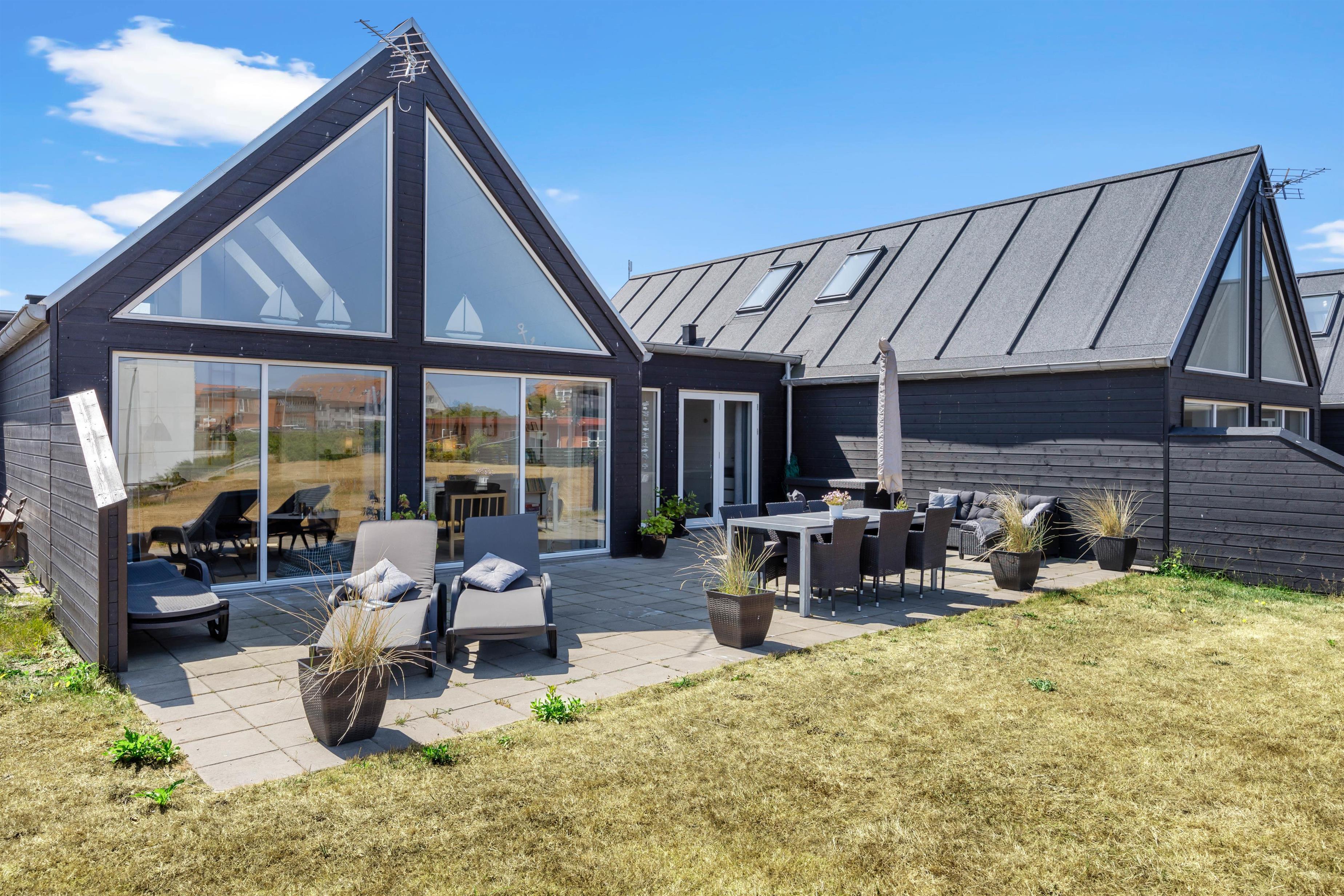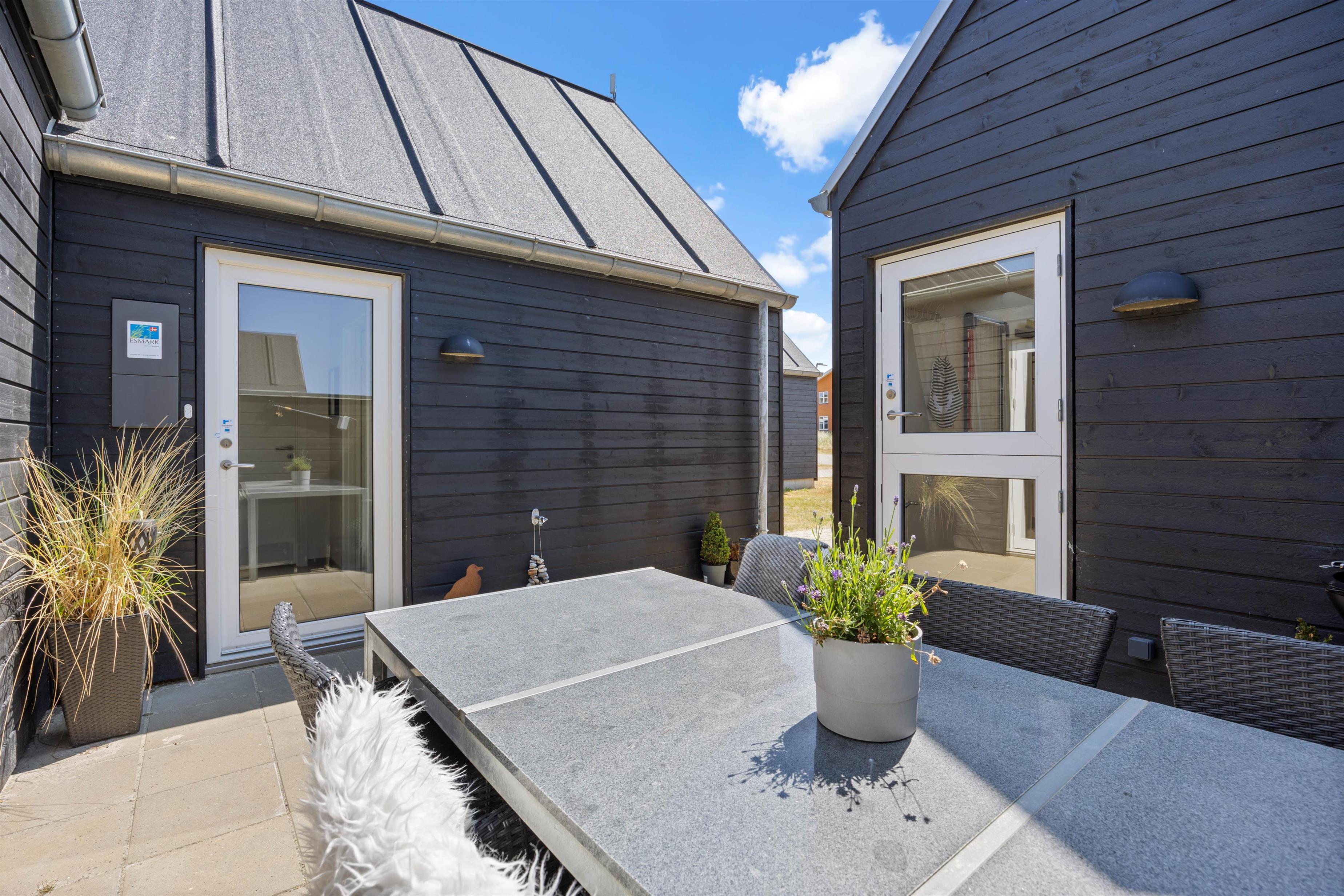 Mod syd er der en helt lukket terrasse. Her kan I slappe af helt ugeneret og nyde en skøn grillmiddag, måske med friskfangede fisk fra havnen, tilberedt på gasgrillen. Nyd middagen i skæret fra den smukke aftenhimmel. Udenfor vil I fra april til november kunne nyde et forfriskende skyl under udebruseren.