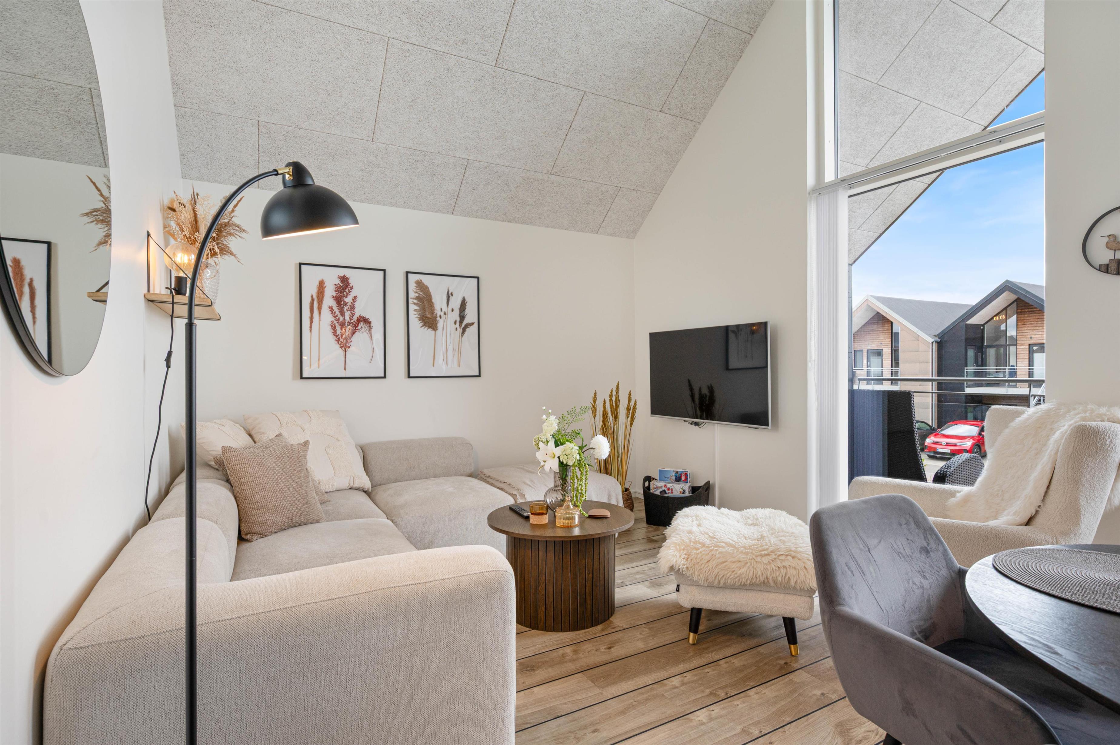 Ferielejligheden på Langsand 133 1.sal er lyst indrettet med moderne møbler og interiør. I lejligheden er der tørretumbler, vaskemaskine og opvaskemaskine, hvilket gør ferien lidt nemmere.