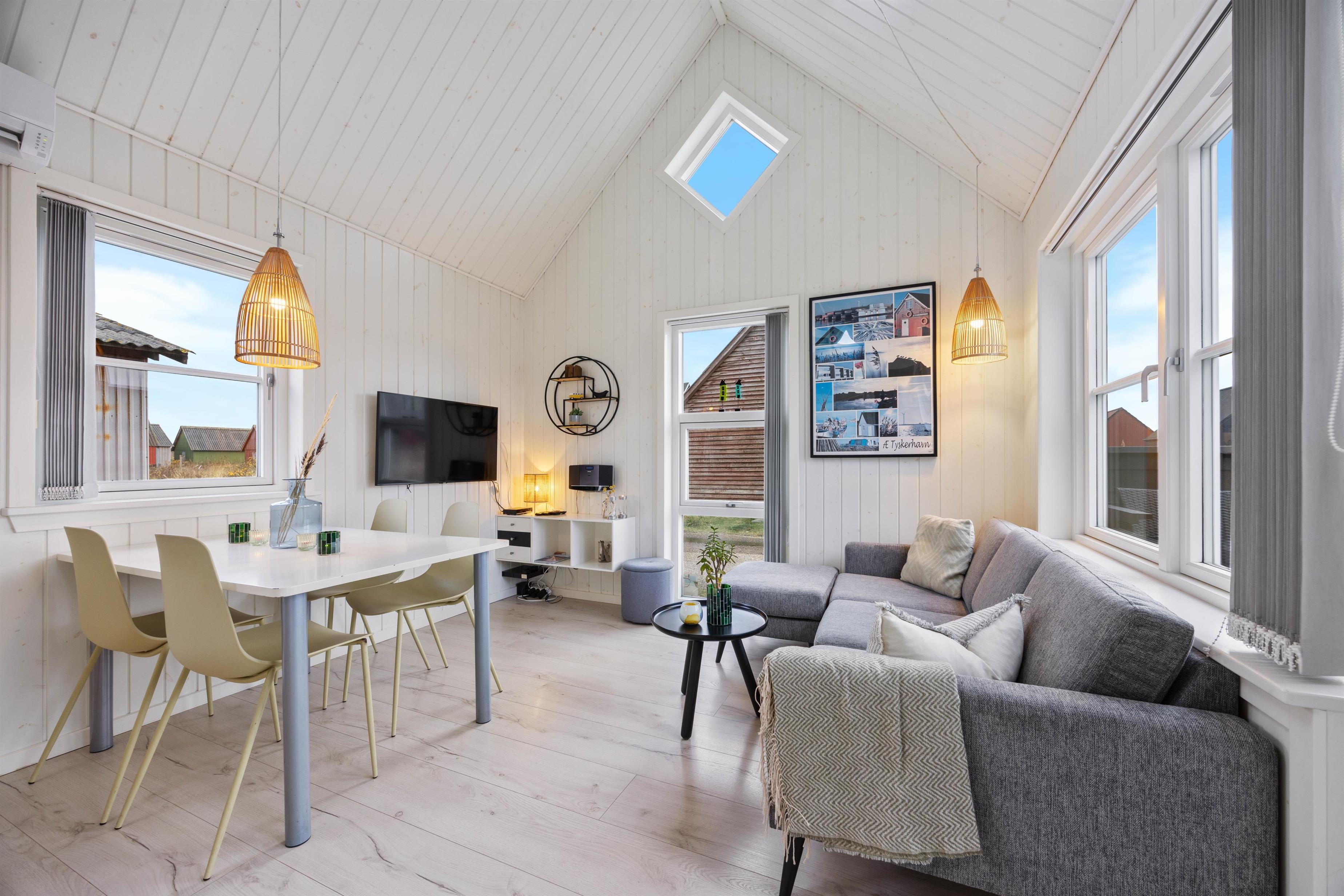 Vinduespartiet ved det hyggelige sofahjørne i sommerhuset skaber et naturligt lysindfald og giver dig en vidunderlig udsigt over det ekstraordinære ferieområde. Køkkenet ligger i åben forbindelse med stuen, og her finder I alt, hvad der skal bruges til at lave et godt måltid. Der er desuden også en opvaskemaskine.