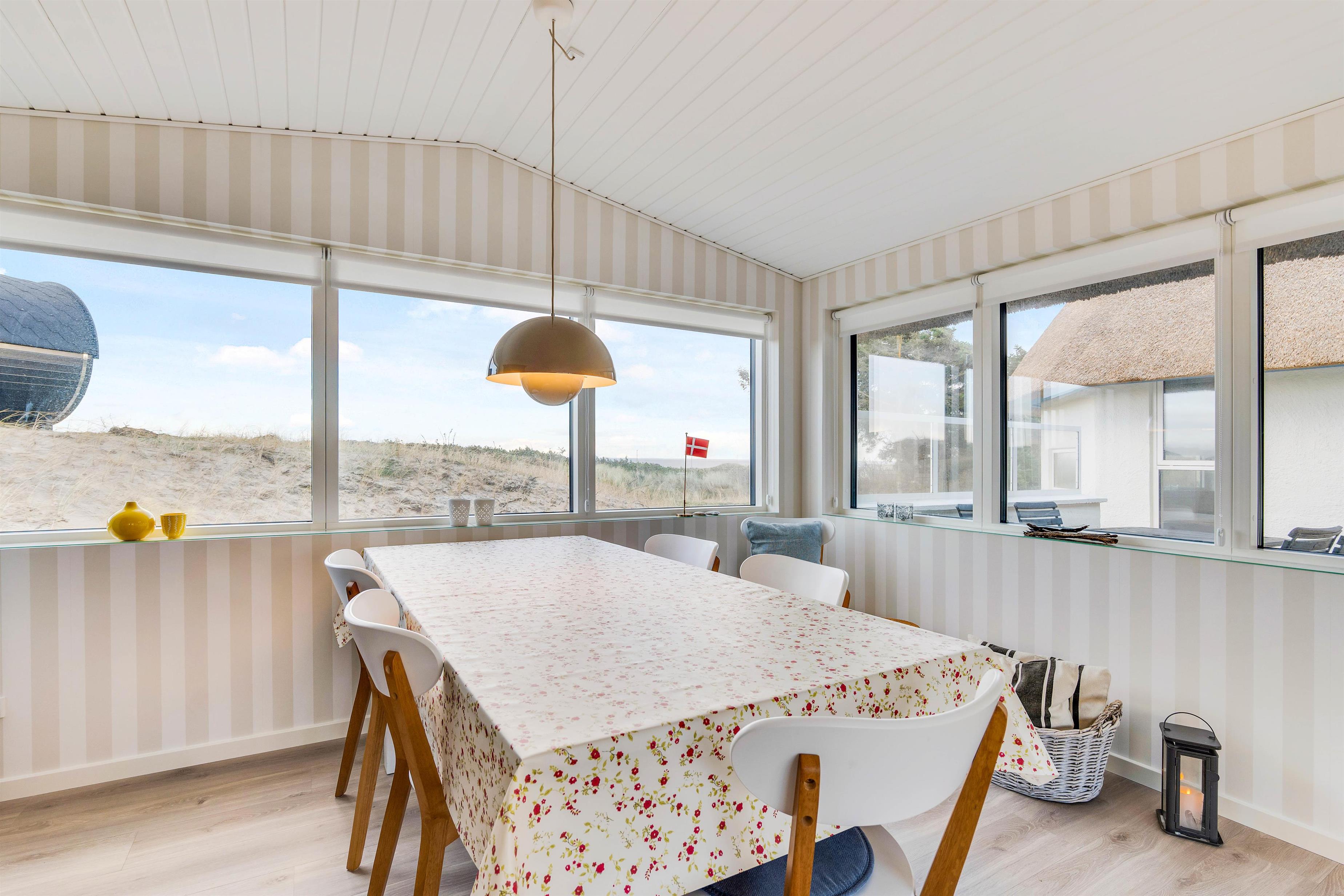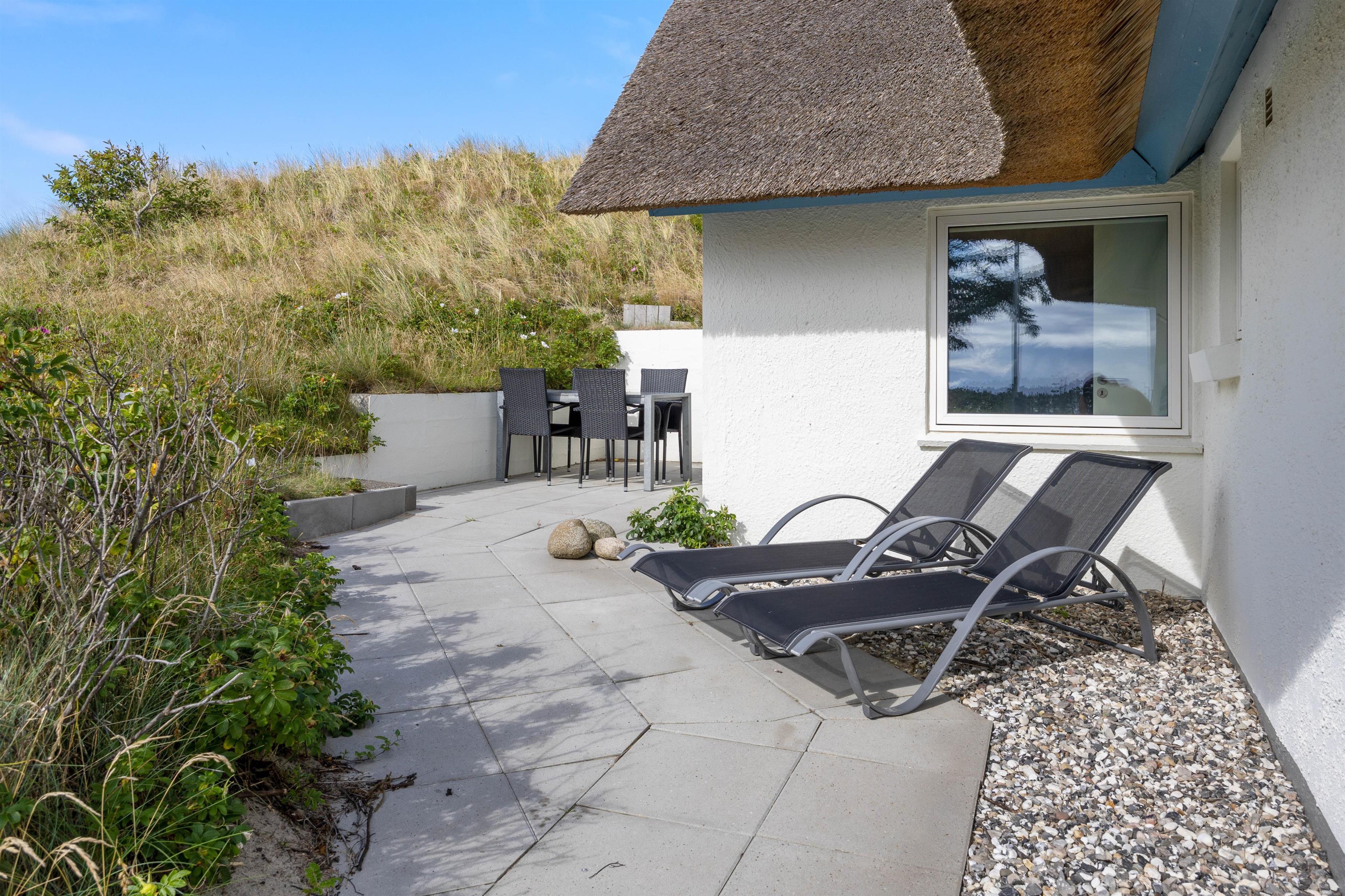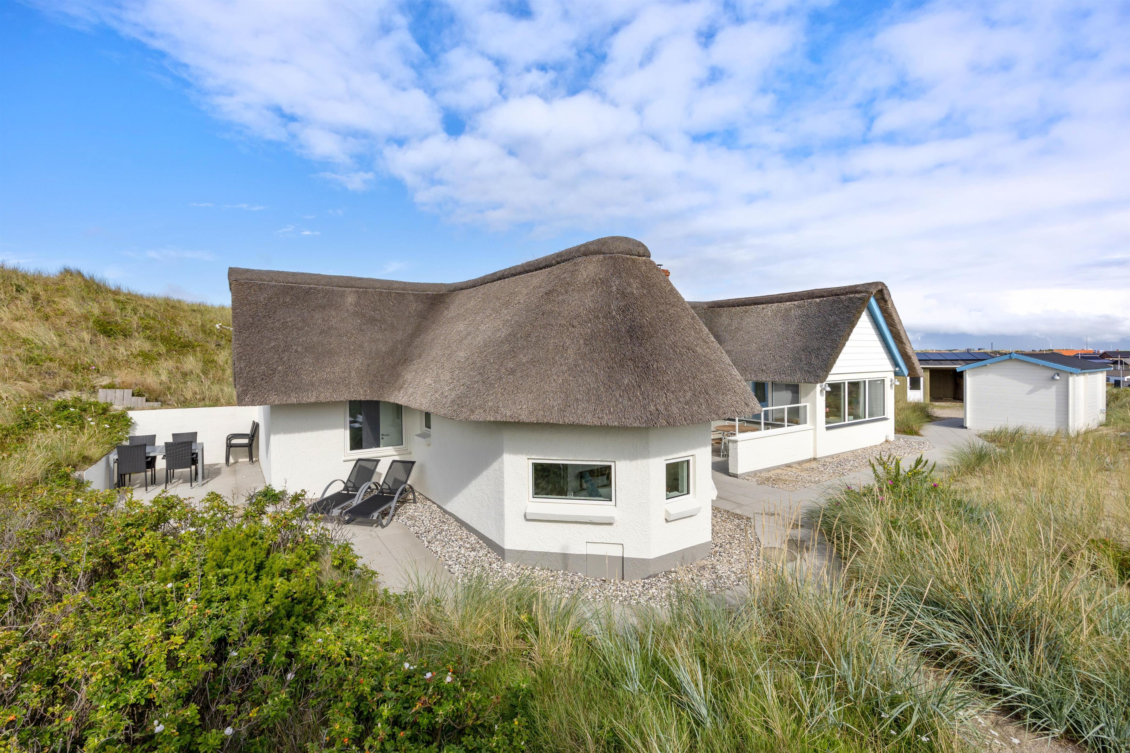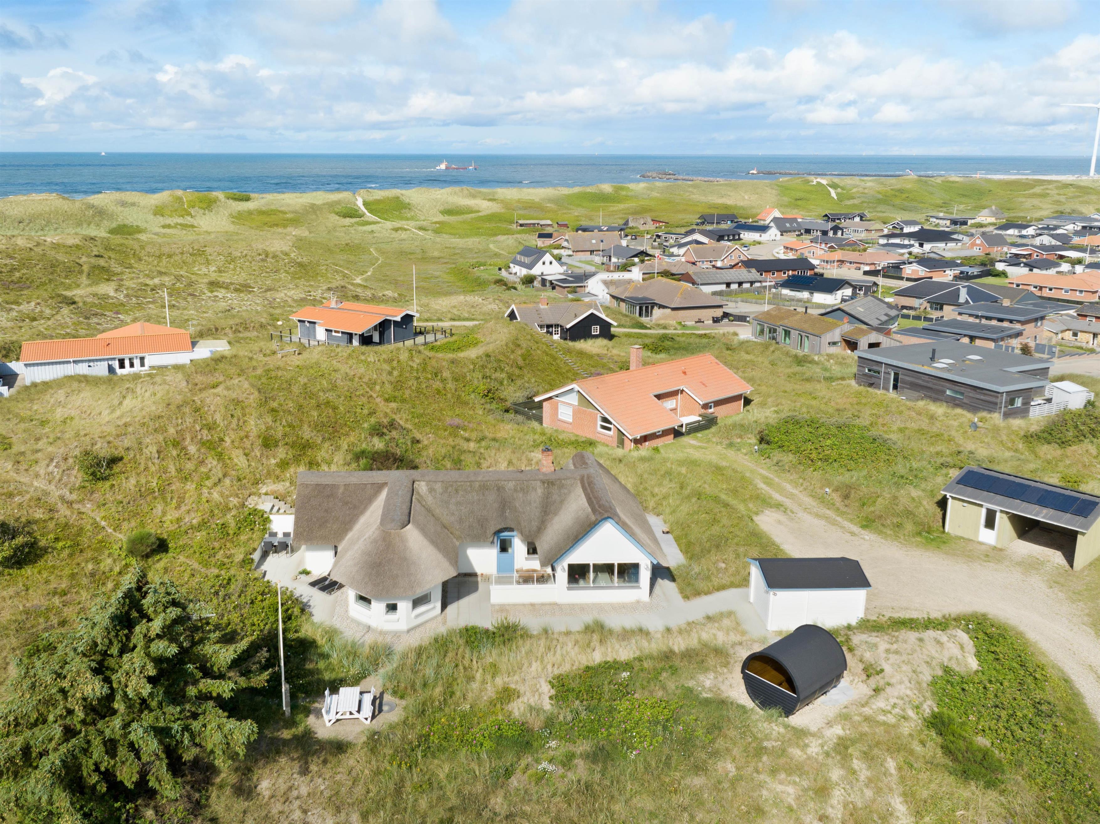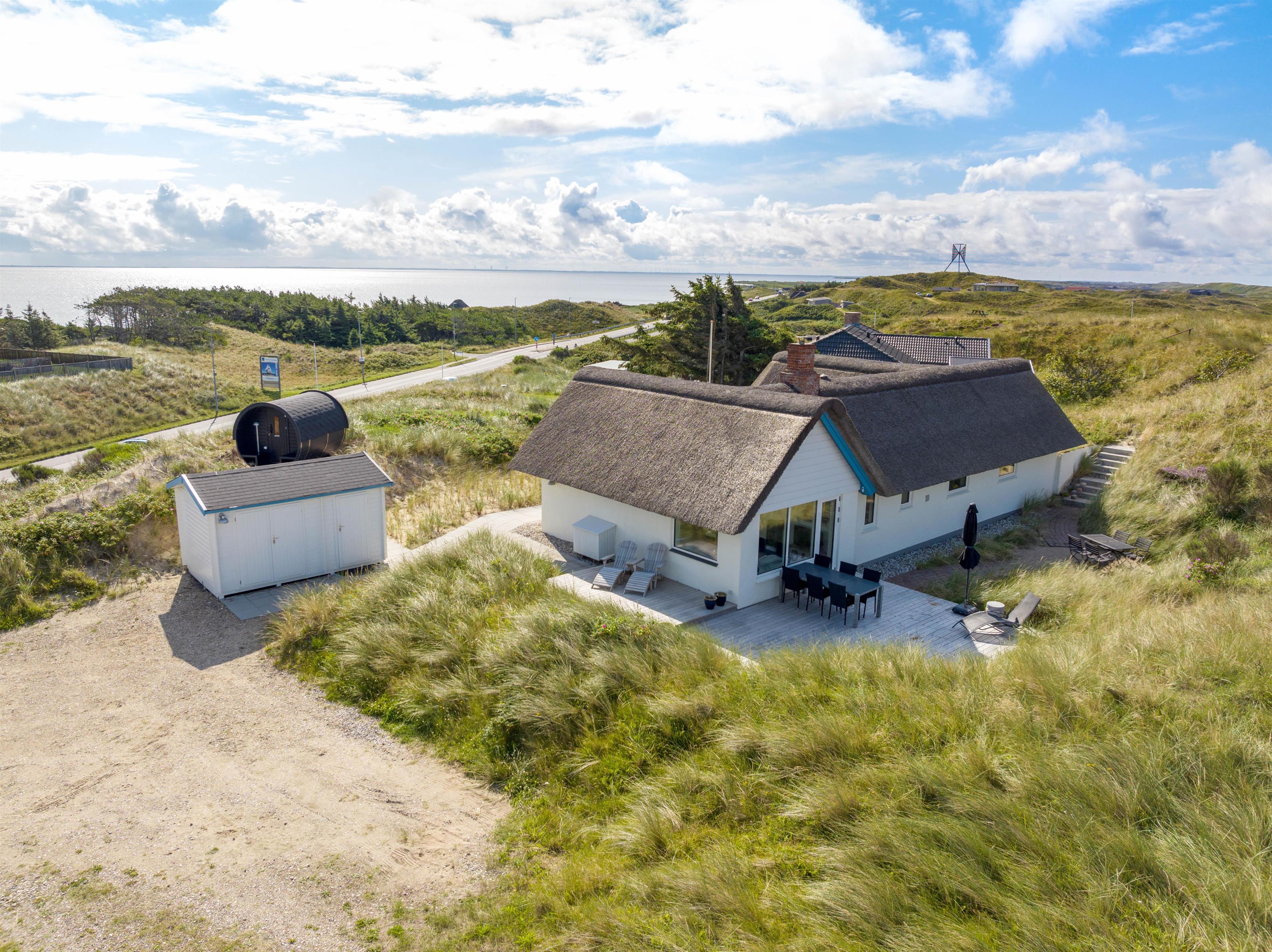 Højt beliggende på en lækker klitgrund ved indgangen til Hvide Sande, ligger dette hyggelige sommerhus på Søndergade 66. Feriehuset har flere dejlige terrasser med gode læforhold, så solens stråler kan nydes hele dagen rundt om sommerhuset. Sommerhuset har sin egen wellnessafdeling med spabad, og udendørs finder I en saunatønde med fantastisk udsigt over Ringkøbing Fjord.