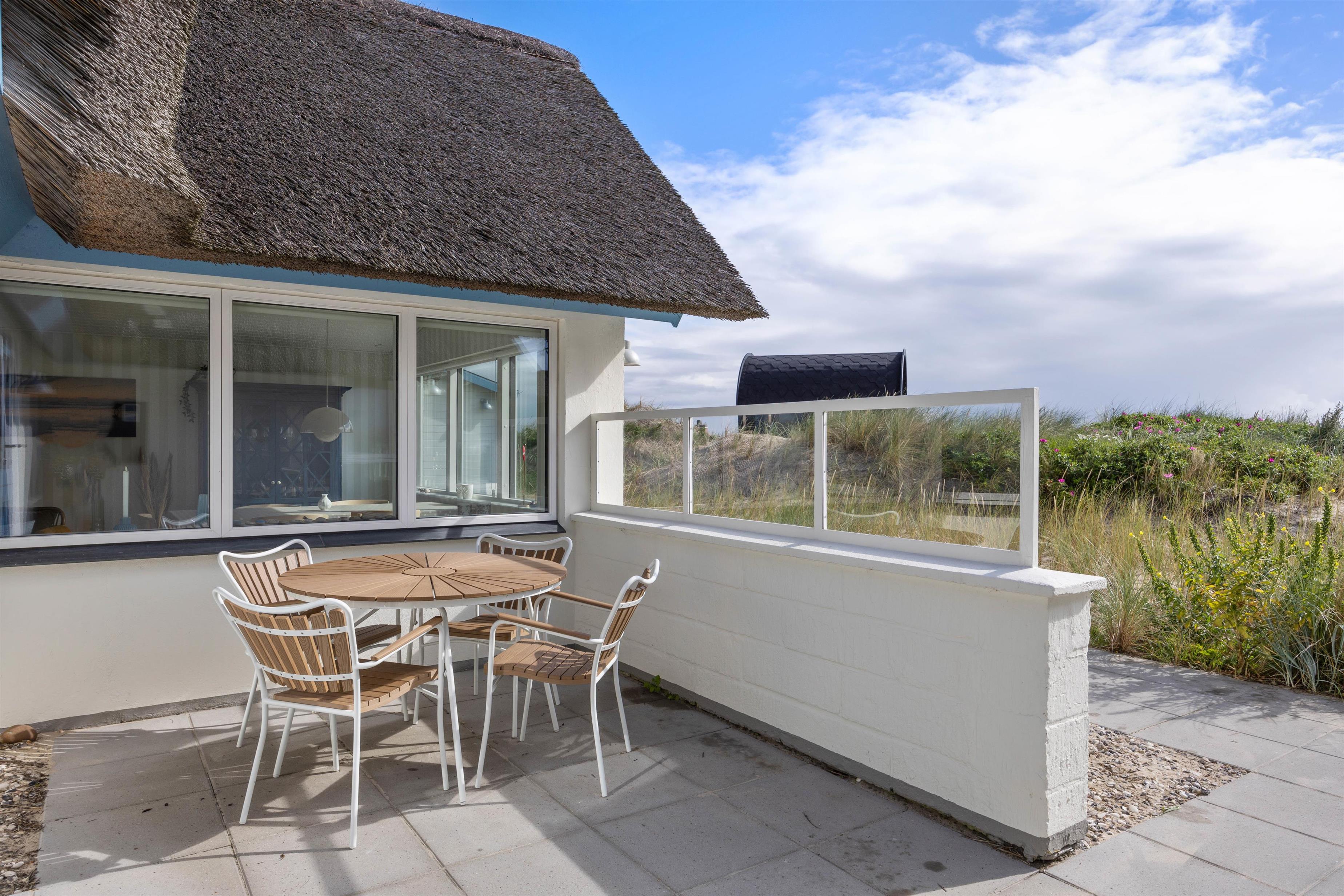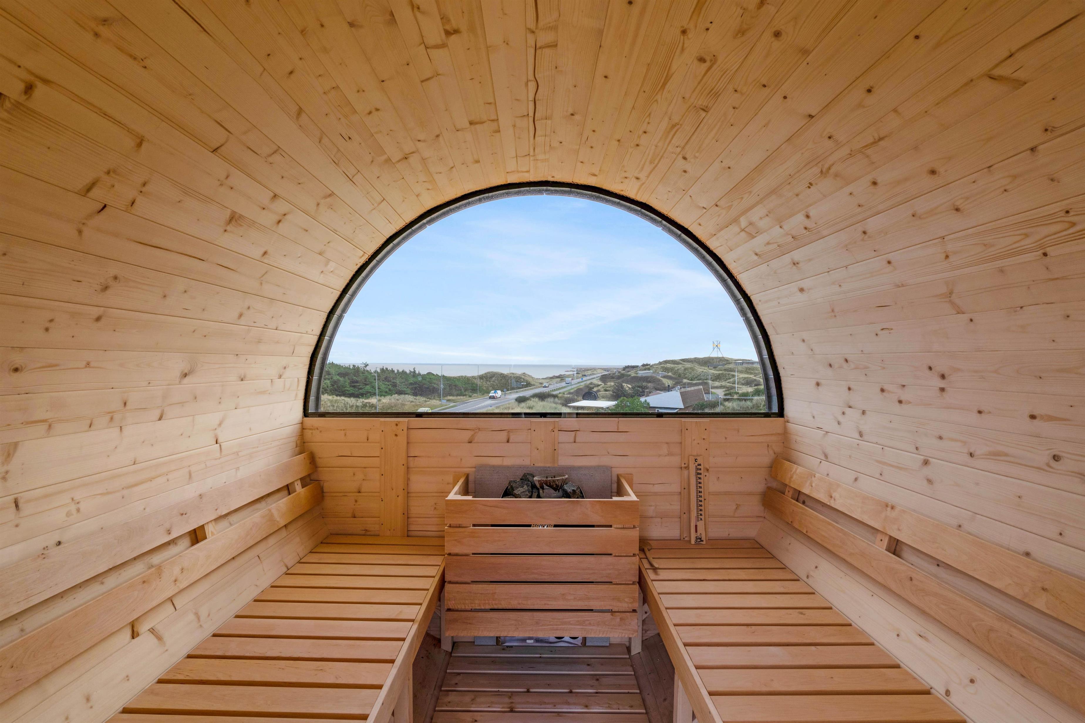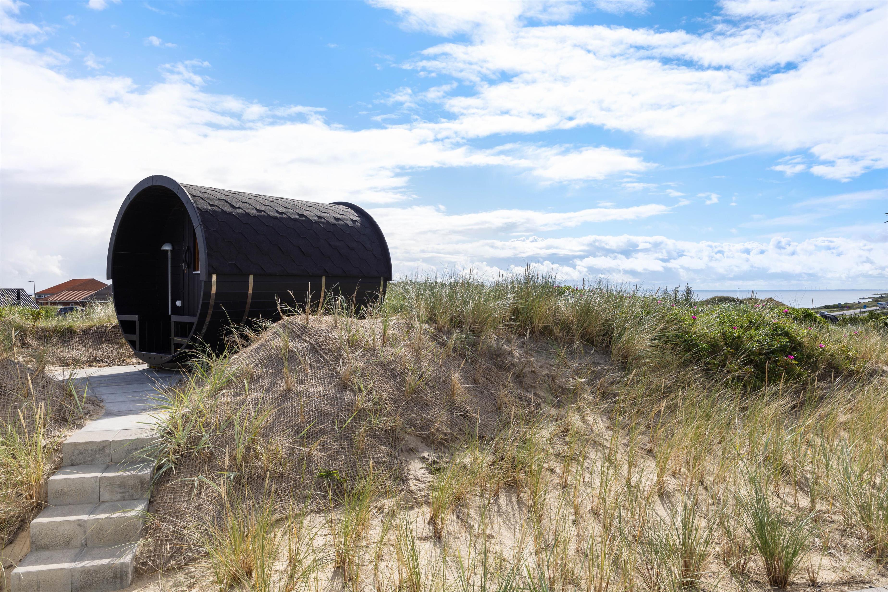 Et af sommerhusets absolutte highlights finder I udendørs på den skønne klitgrund. Her er nemlig en saunatønde, hvorfra I har en helt fantastisk panoramaudsigt til Ringkøbing Fjord.