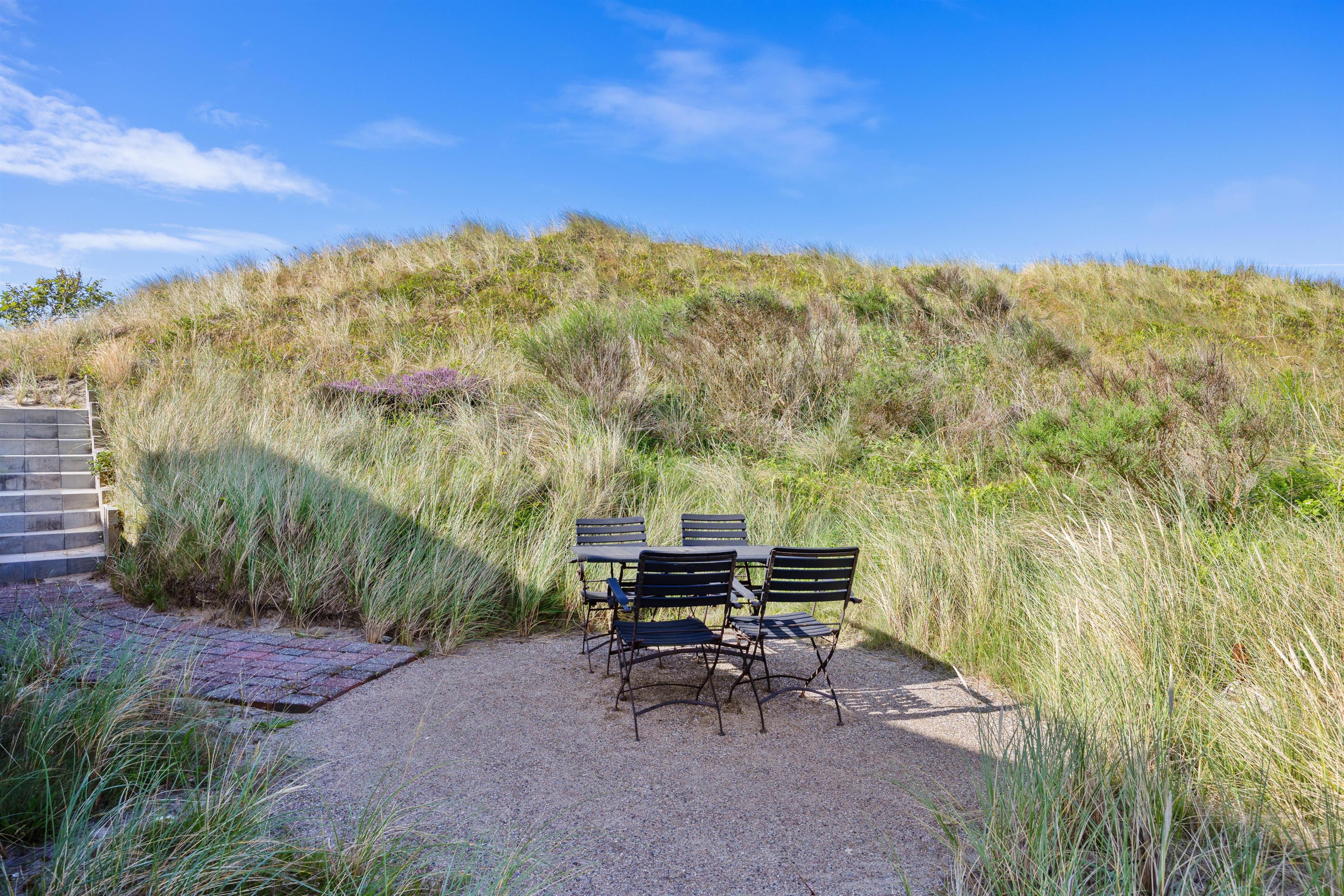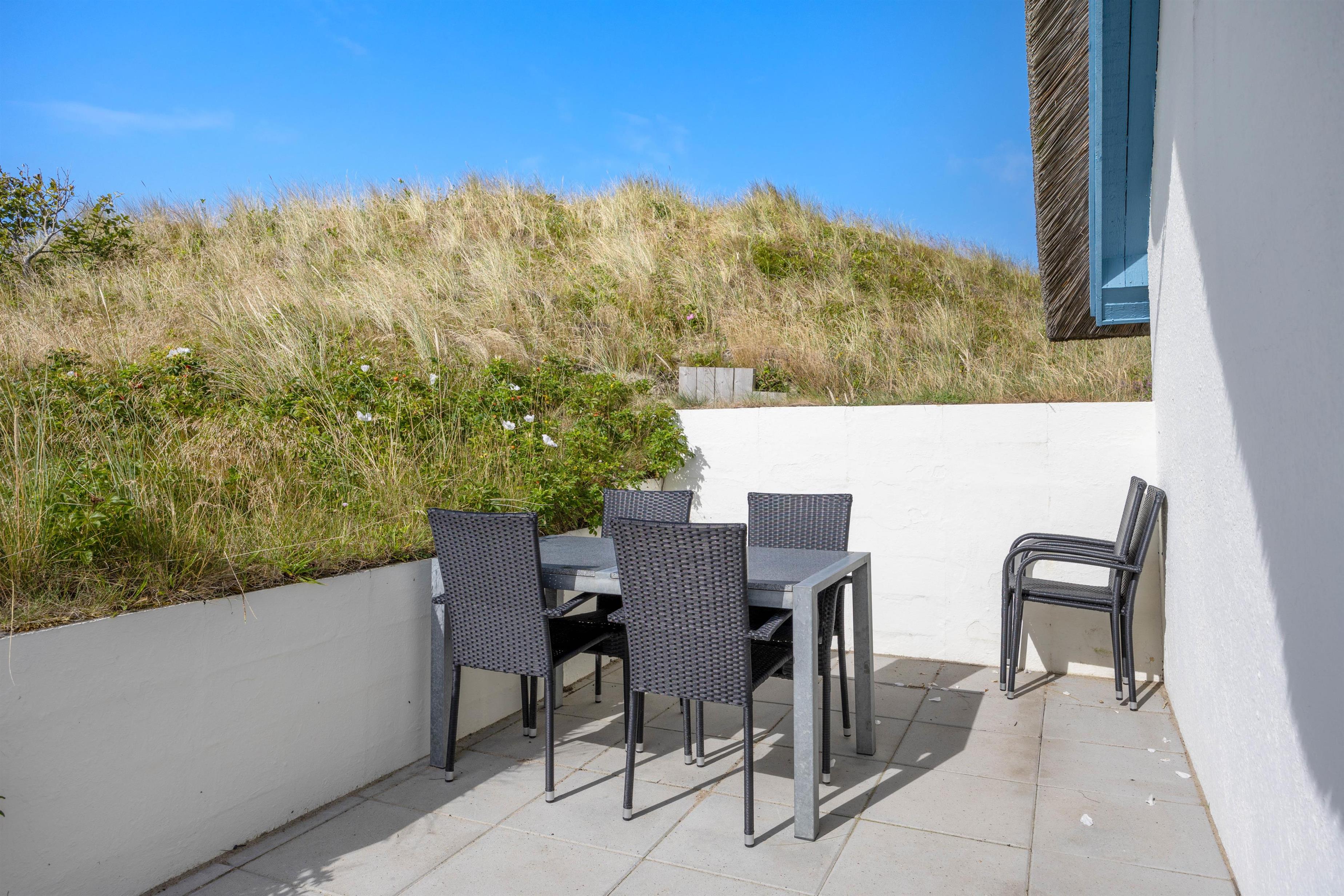 Find din yndlingsterrasse alt efter vindretningen. Her kan du altid finde en plads med læ, hvor du kan nyde et glas vin og hyggeligt selskab. Eller du kan nyde den fine udsigt rundt omkring på grunden, jo højere du kommer op, jo smukkere. Terrassen er udstyret med havemøbler, liggestole og grill.