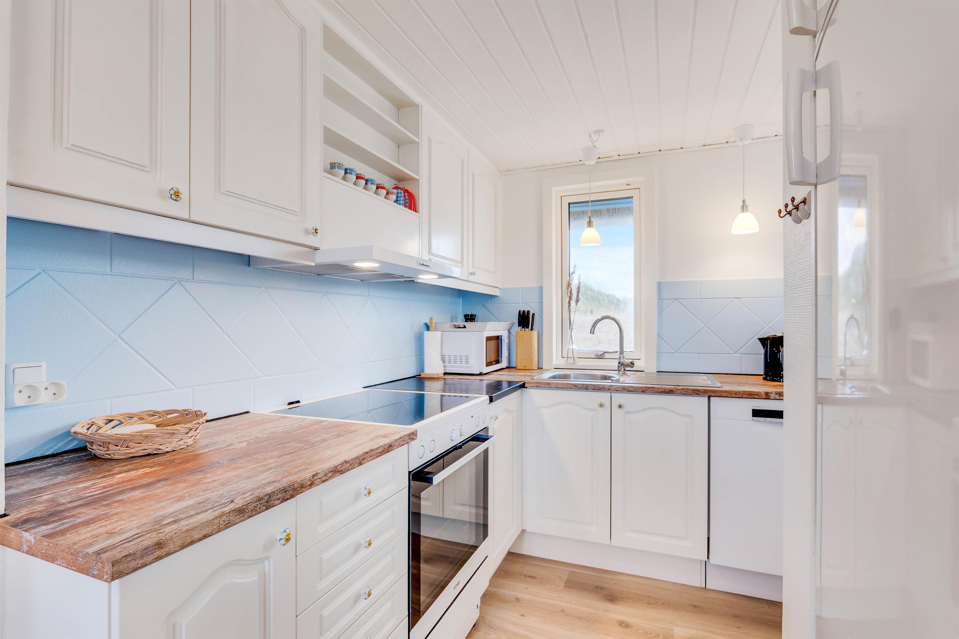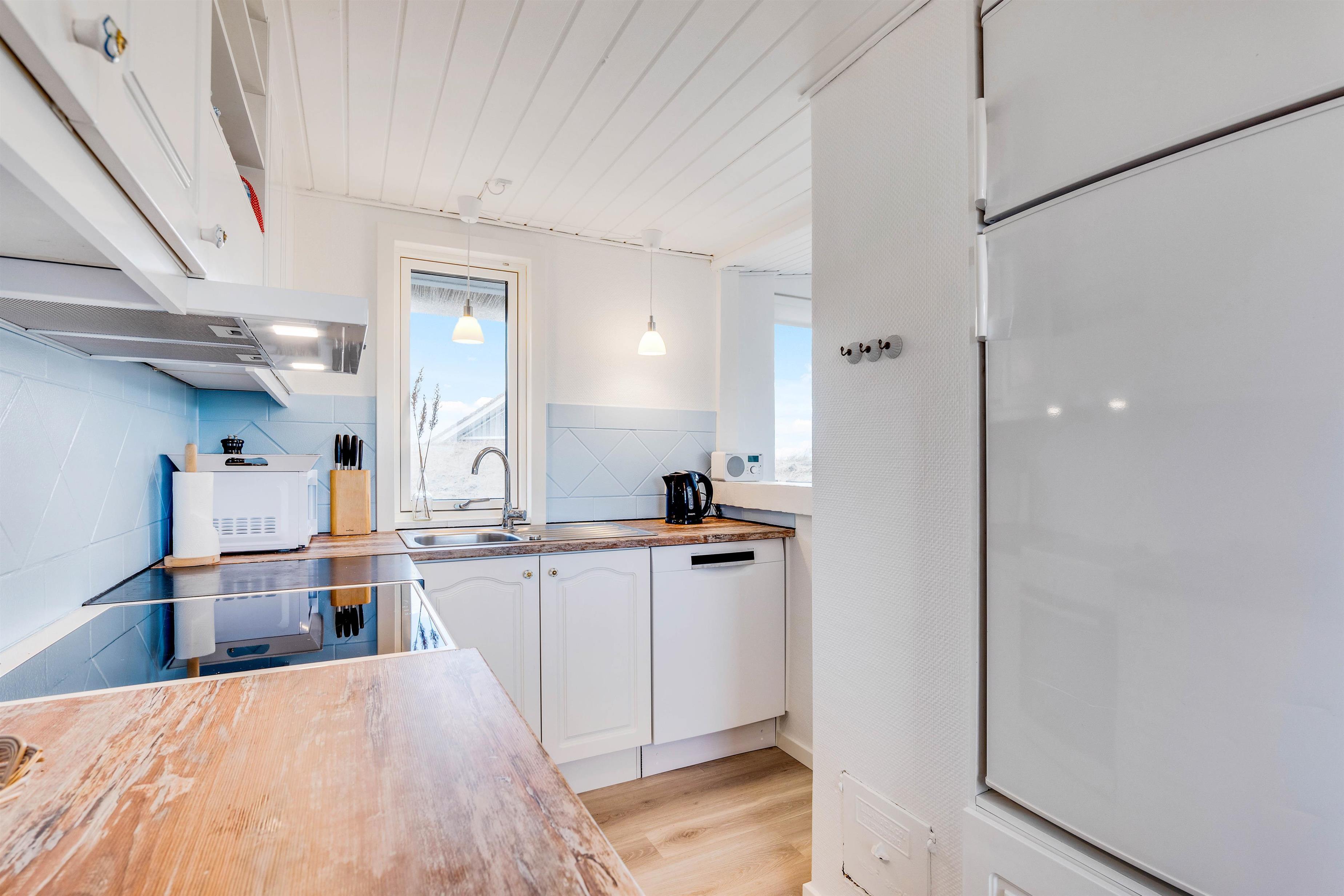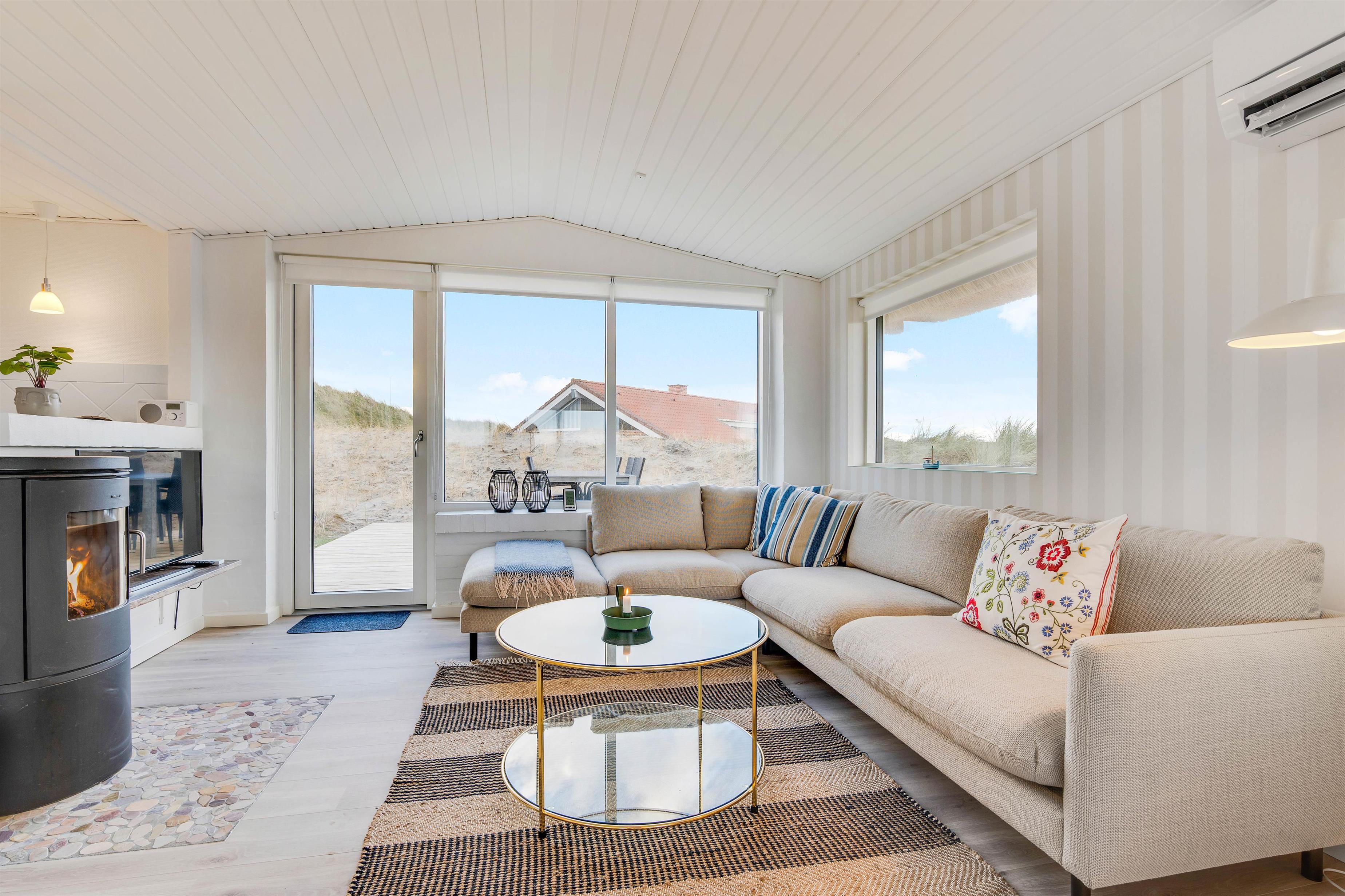 Stuen er hyggeligt indrettet med gode møbler, brændeovn og godt lysindfald fra de store vinduespartier og står i åben forbindelse med køkkenet. I køkkenet er der opvaskemaskine, køleskab med fryser og mikroovn. I sommerhuset råder du over en gratis trådløs internetforbindelse.
