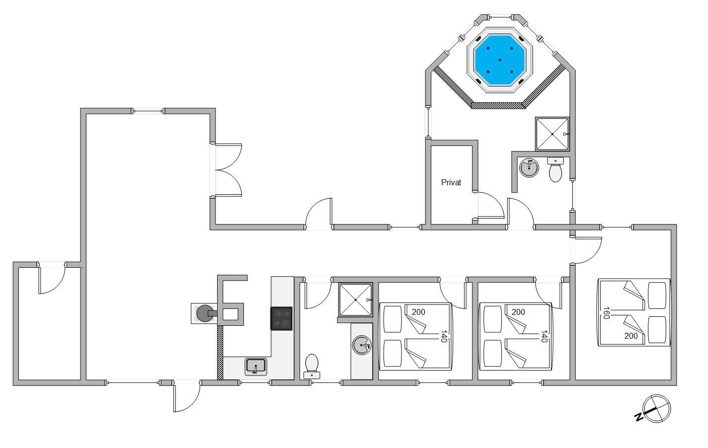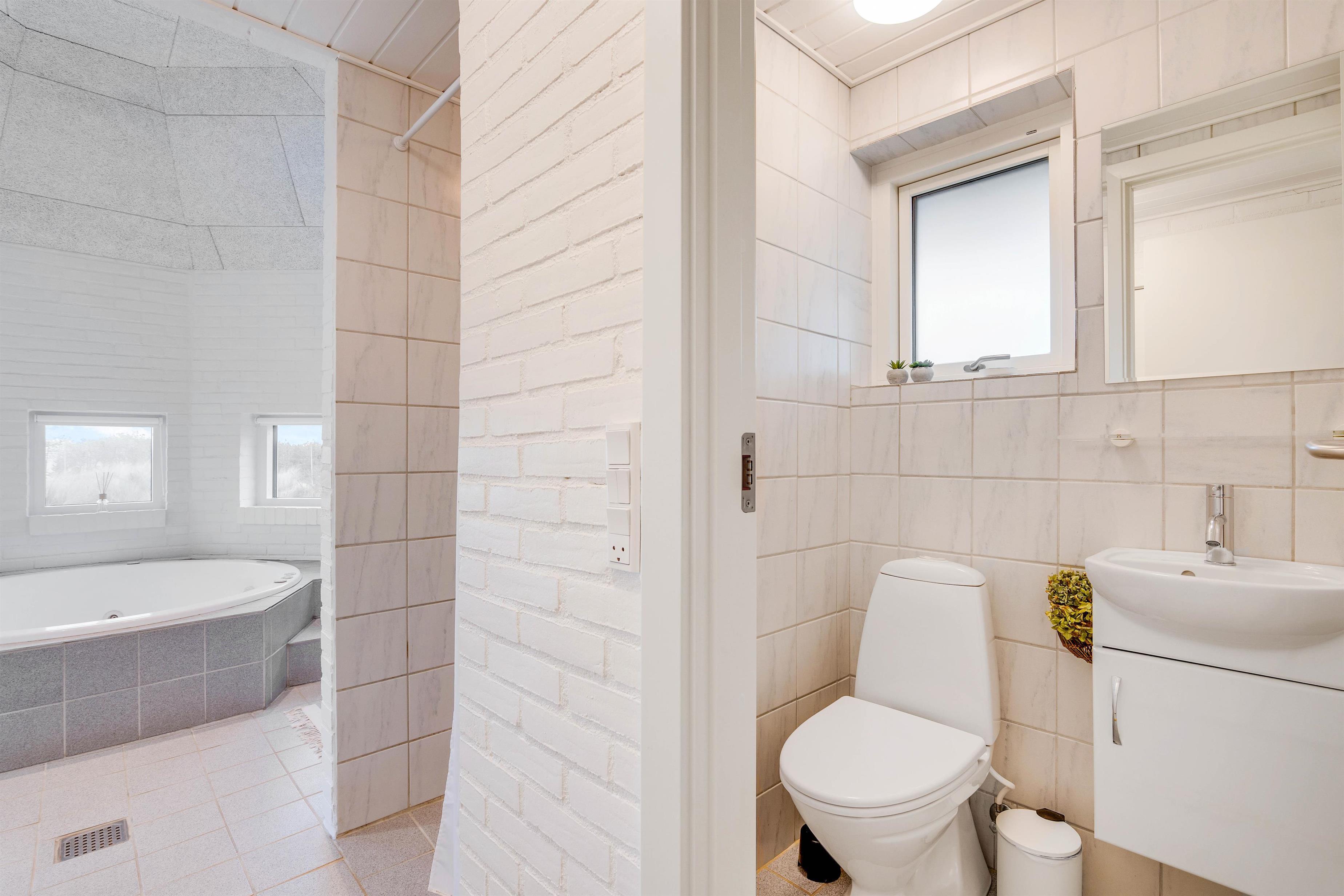 Herudover er der en stor wellness afdeling i sommerhuset, som først og fremmest domineres af det store lækre boblebad, hvor I sagtens kan være 4 af gangen. I denne afdeling er der også bruser og et ekstra gæstetoilet. Boblebadet er et såkaldt standvandsspa, d.v.s det ikke skal tømmes, når det ikke benyttes. Wellnessafdelingen er også udstyret med gulvvarme.