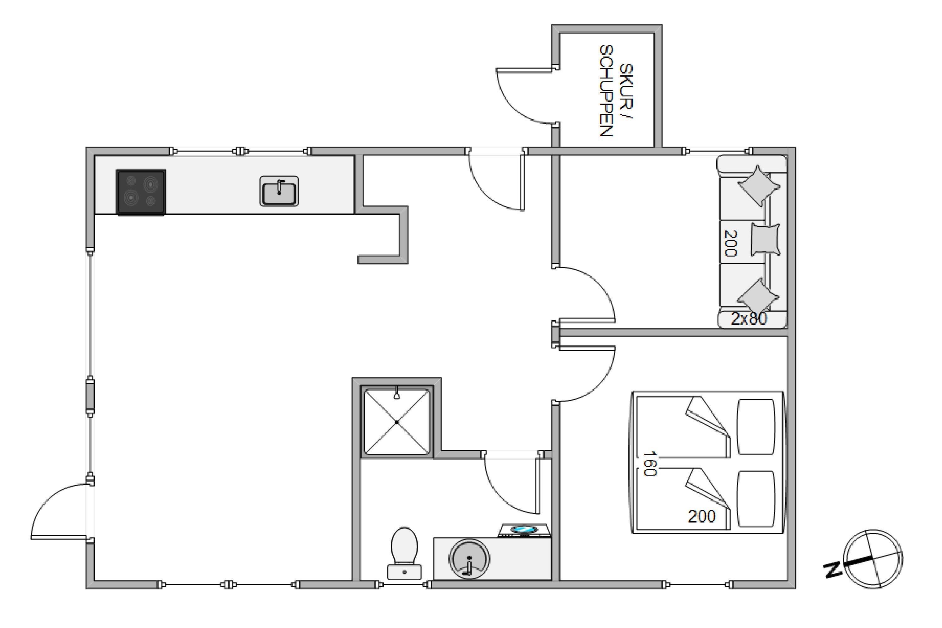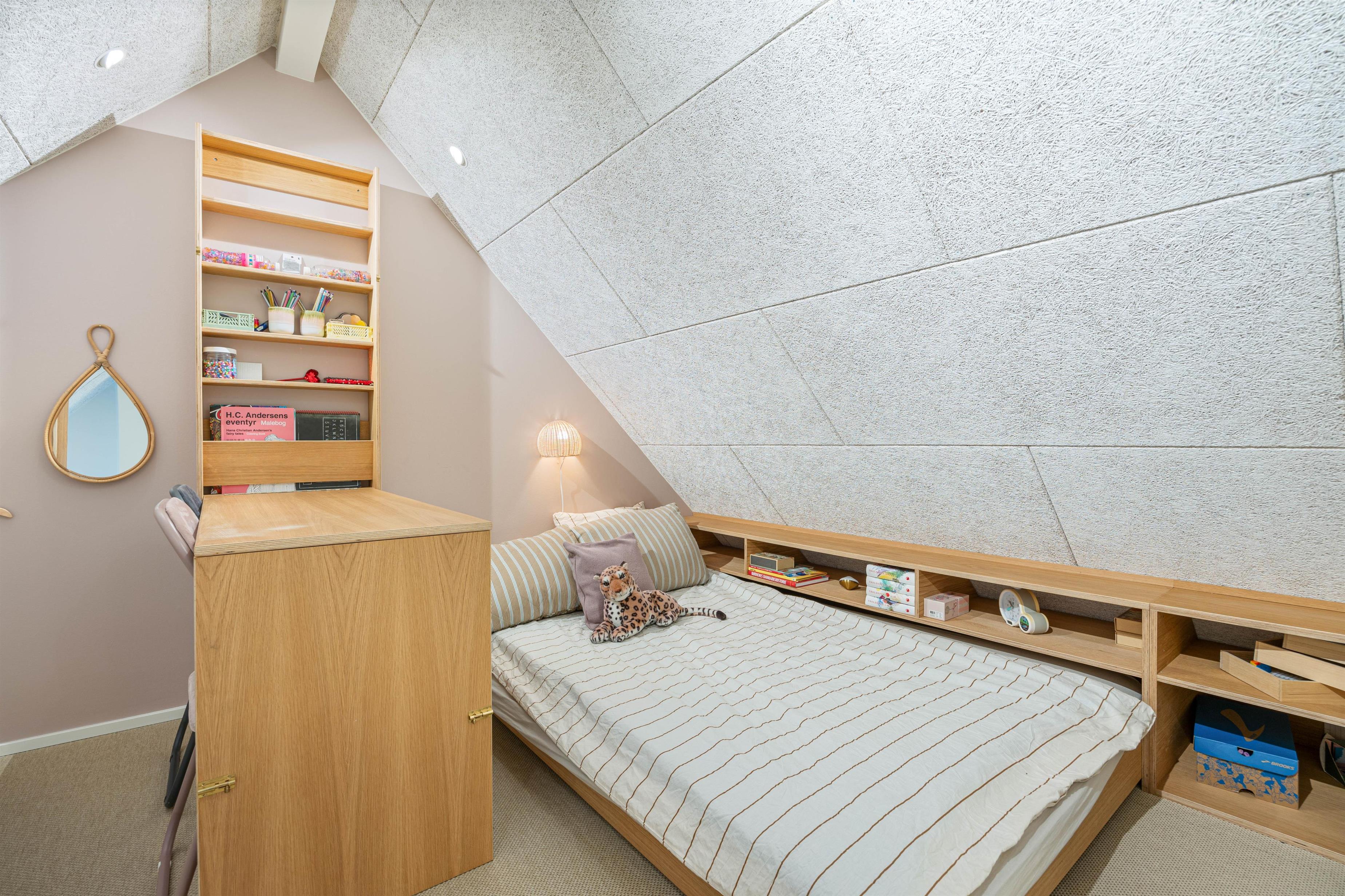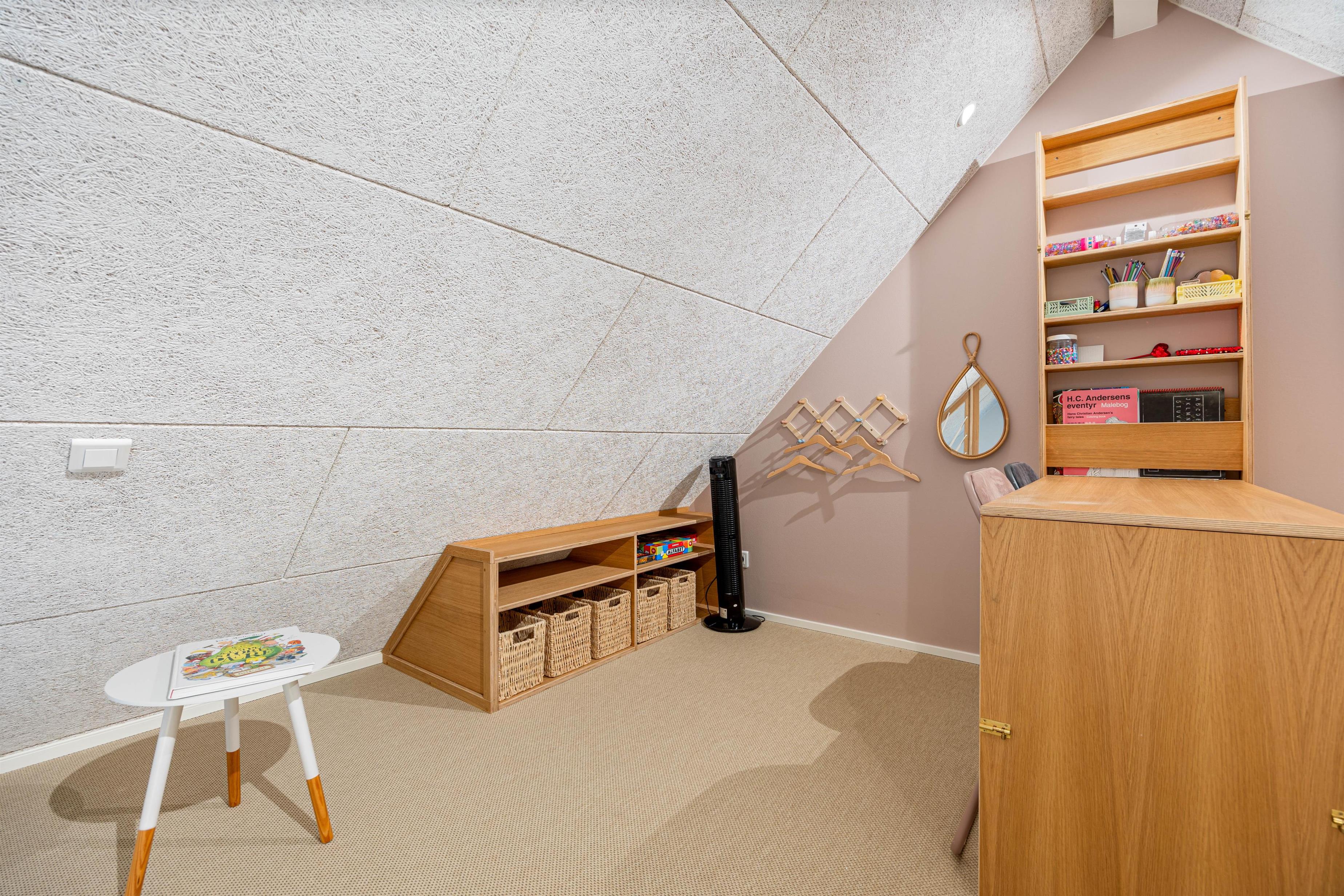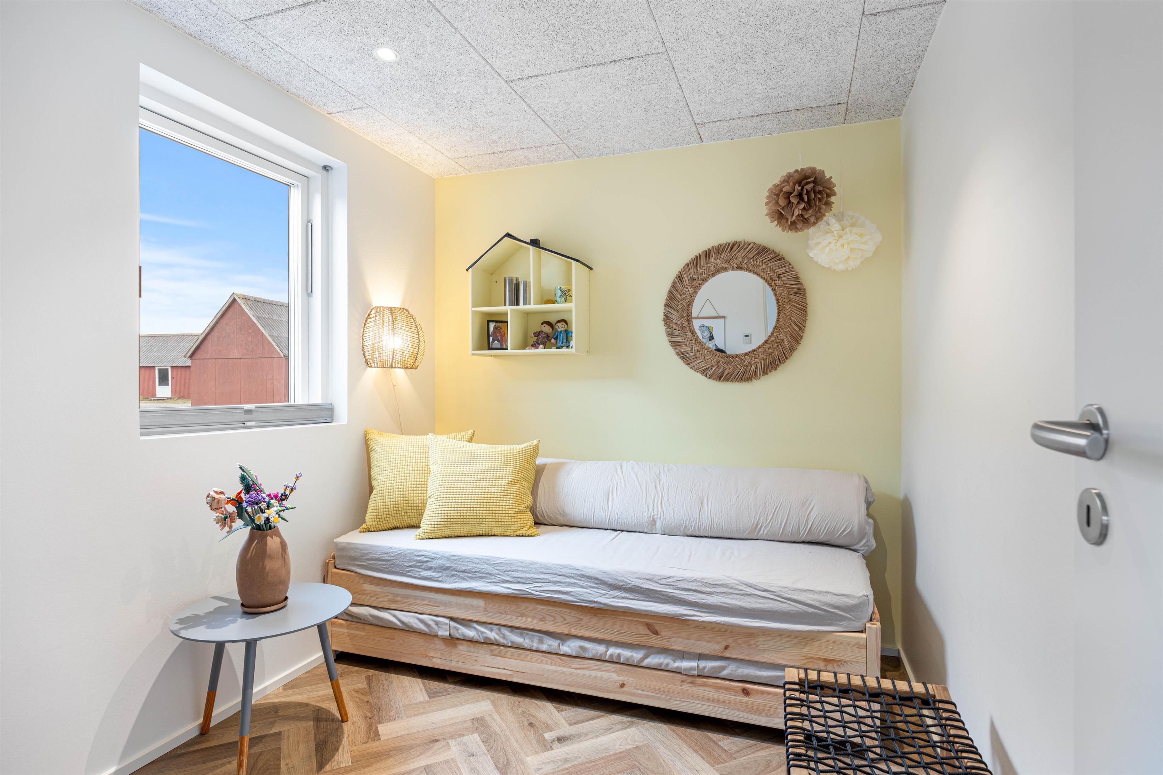 Feriehuset har plads til 4 personer – de 4 sovepladser fordeler sig på to hyggelige soveværelser. Derudover er der også en hyggelig hems på 25 m2, hvor der er plads til, at børnene kan sætte sig op og lege. På badeværelset er er der gulvvarme, og hvis I trænger til at vaske tøj, er der også en kombi vaskemaskine og tørretumbler på badeværelset.
