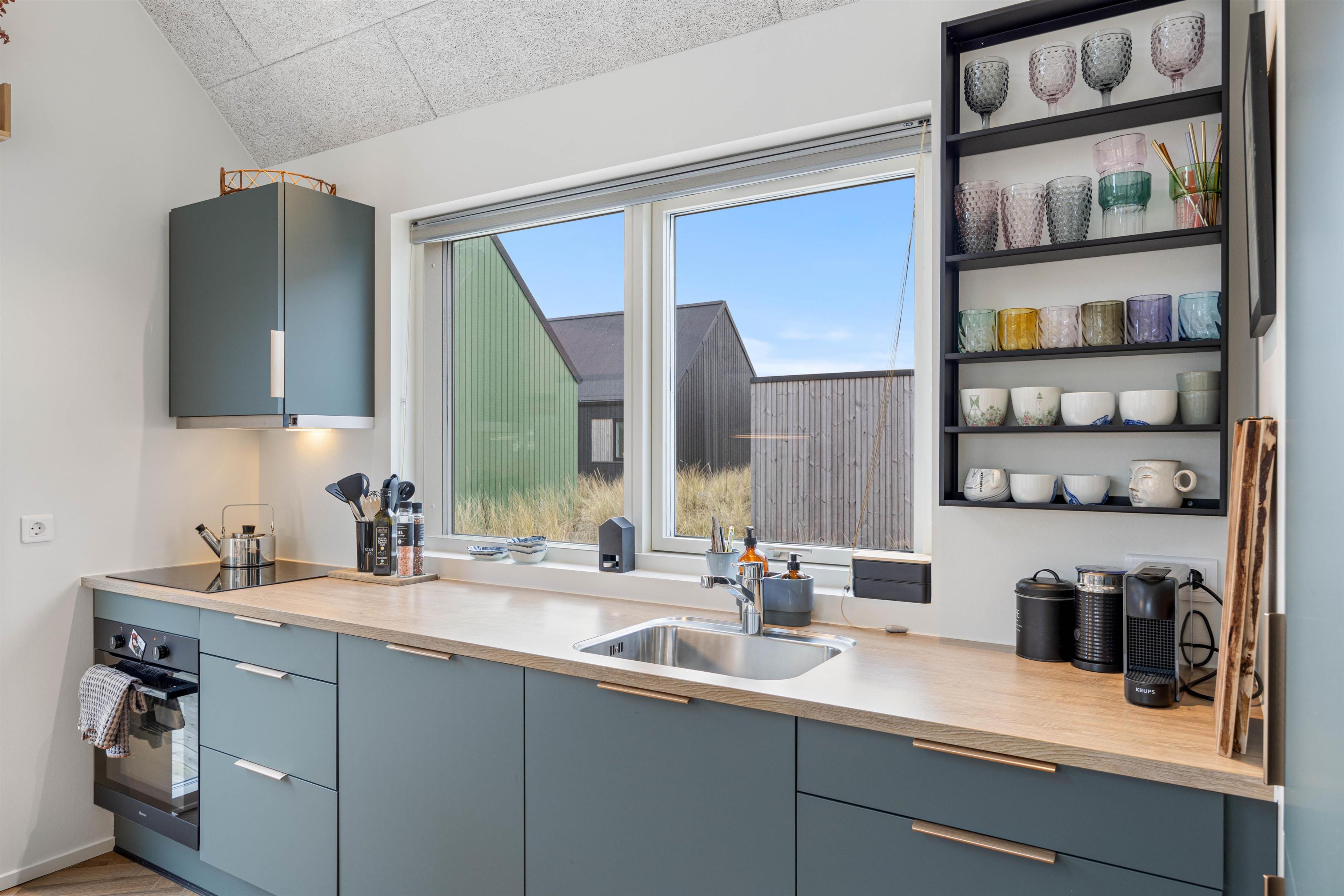 Indenfor byder feriehuset på et hyggeligt lille opholdsrum, der kombinerer stue, spisestue og køkken i ét. I sofaen kan I slappe af med en god bog eller en film på TV’et. I køkkenet er der en opvaskemaskine, så I nemt kan klare opvasken efter dagens måltider.