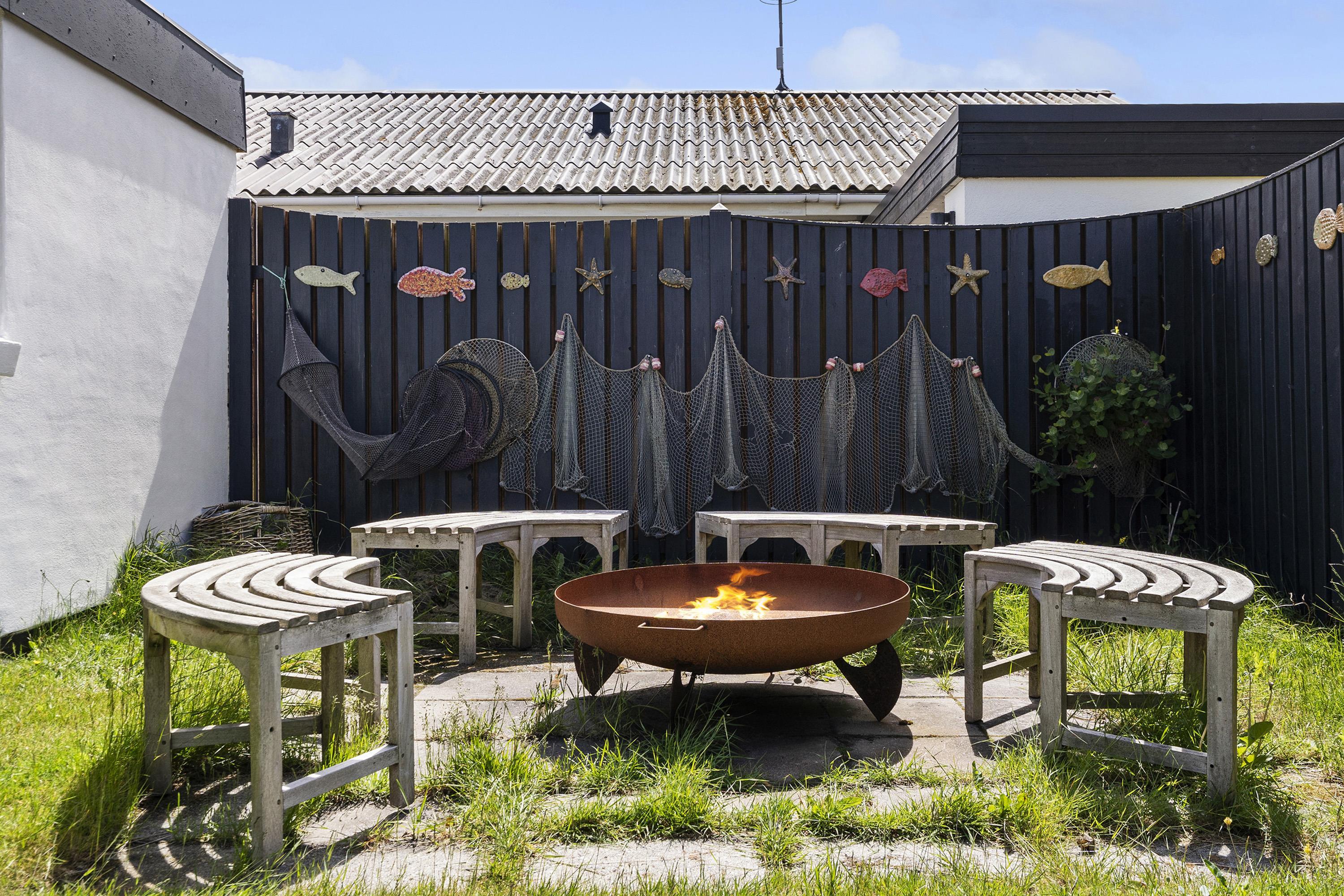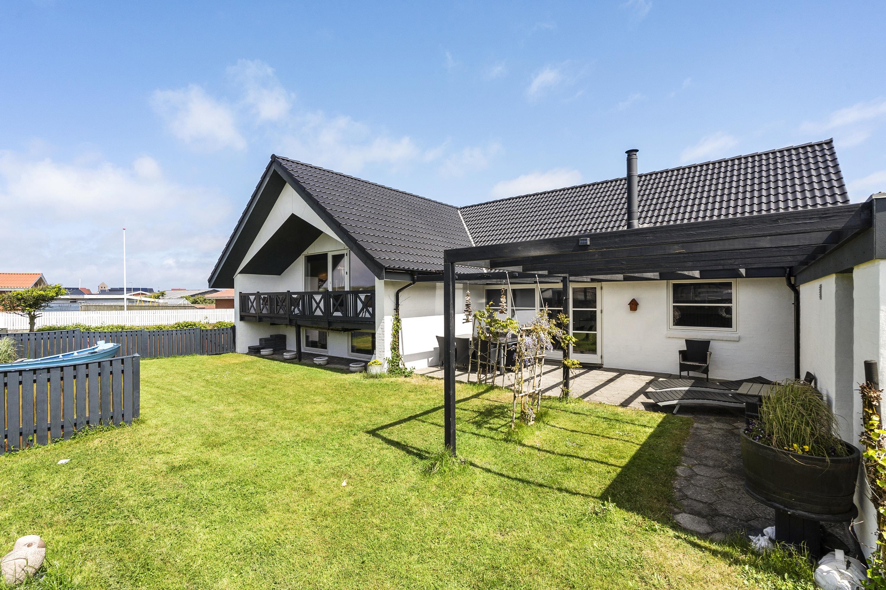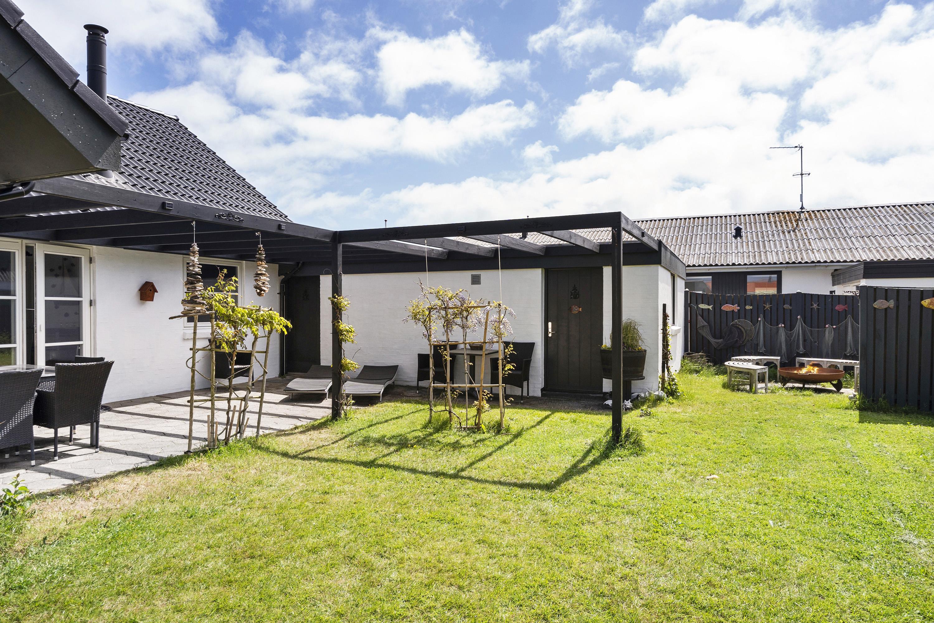 Feriehuset ligger på en indhegnet plænegrund, der giver masser af plads til leg og afslapning. Her finder I både en åben terrasse og en afskærmet terrasse – her kan I sætte jer ned i havemøblerne og nyde morgenkaffen i læ for vinden. Om aftenen kan I finde grillen frem og nyde aftensmaden udenfor på terrassen.