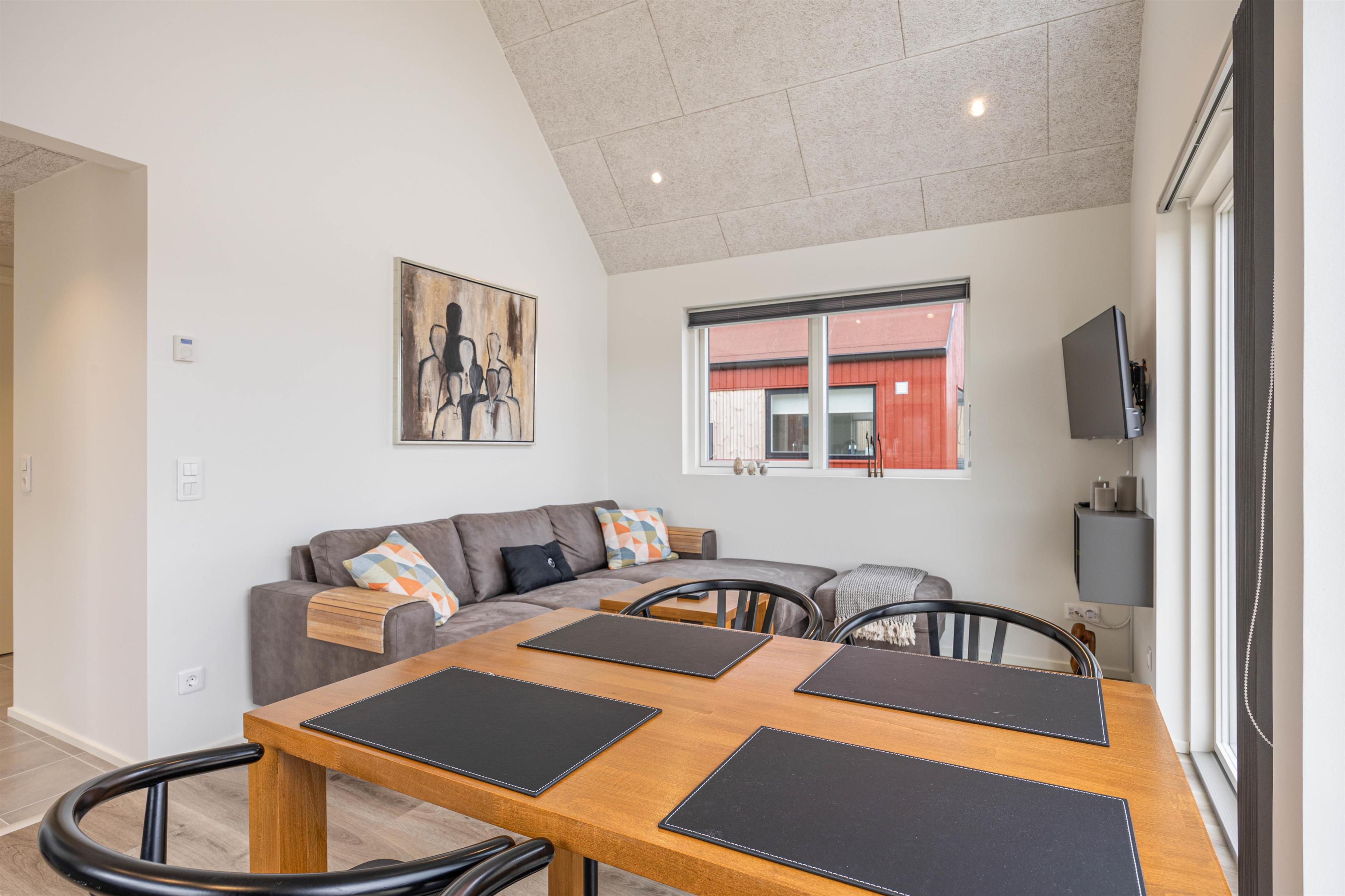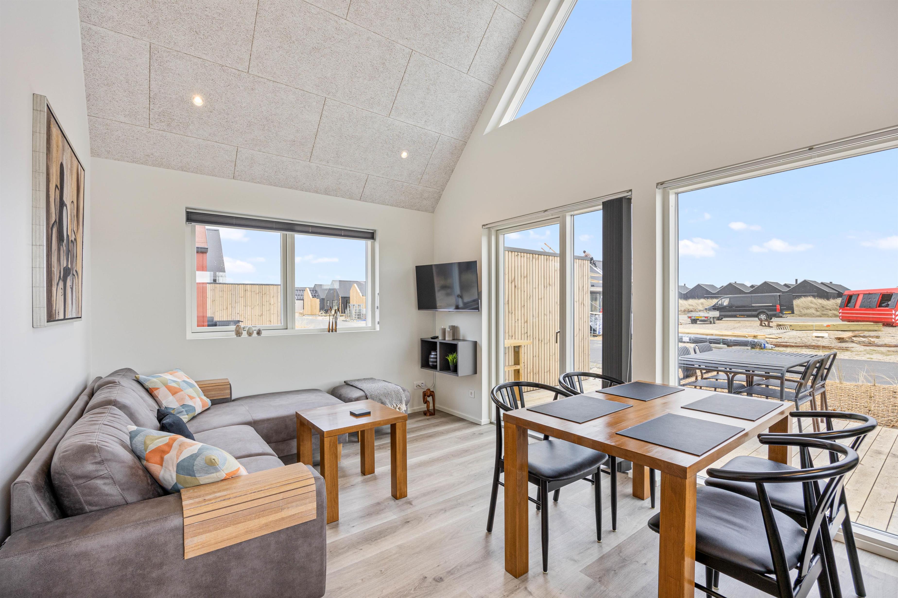 Sommerhuset er dejligt indrettet med et åbent køkken-alrum, hvor store vinduespartier lukker lyset ind og skaber en dejlig atmosfære. Køkkenet er veludstyret med bl.a. opvaskemaskine, så oprydningen efter måltiderne bliver let og hurtig. Den hyggelige stue indbyder til afslapning i sofaen efter en dejlig dag - her kan I nyde en god film eller en brætspilsaften.