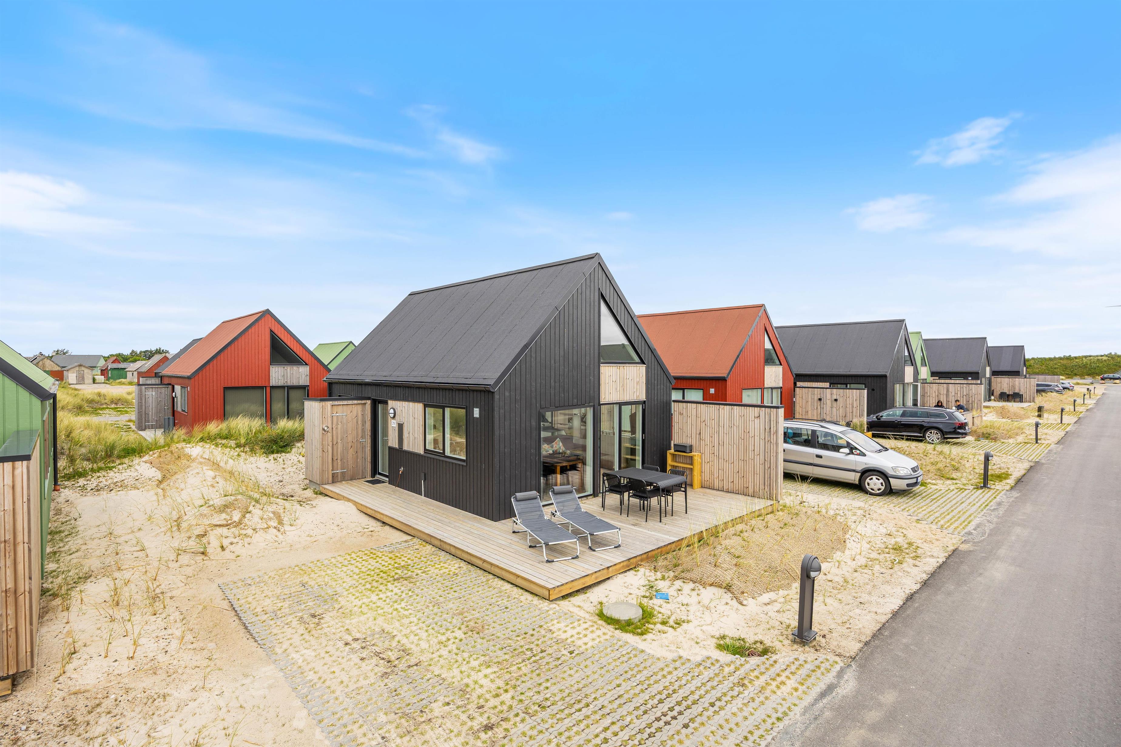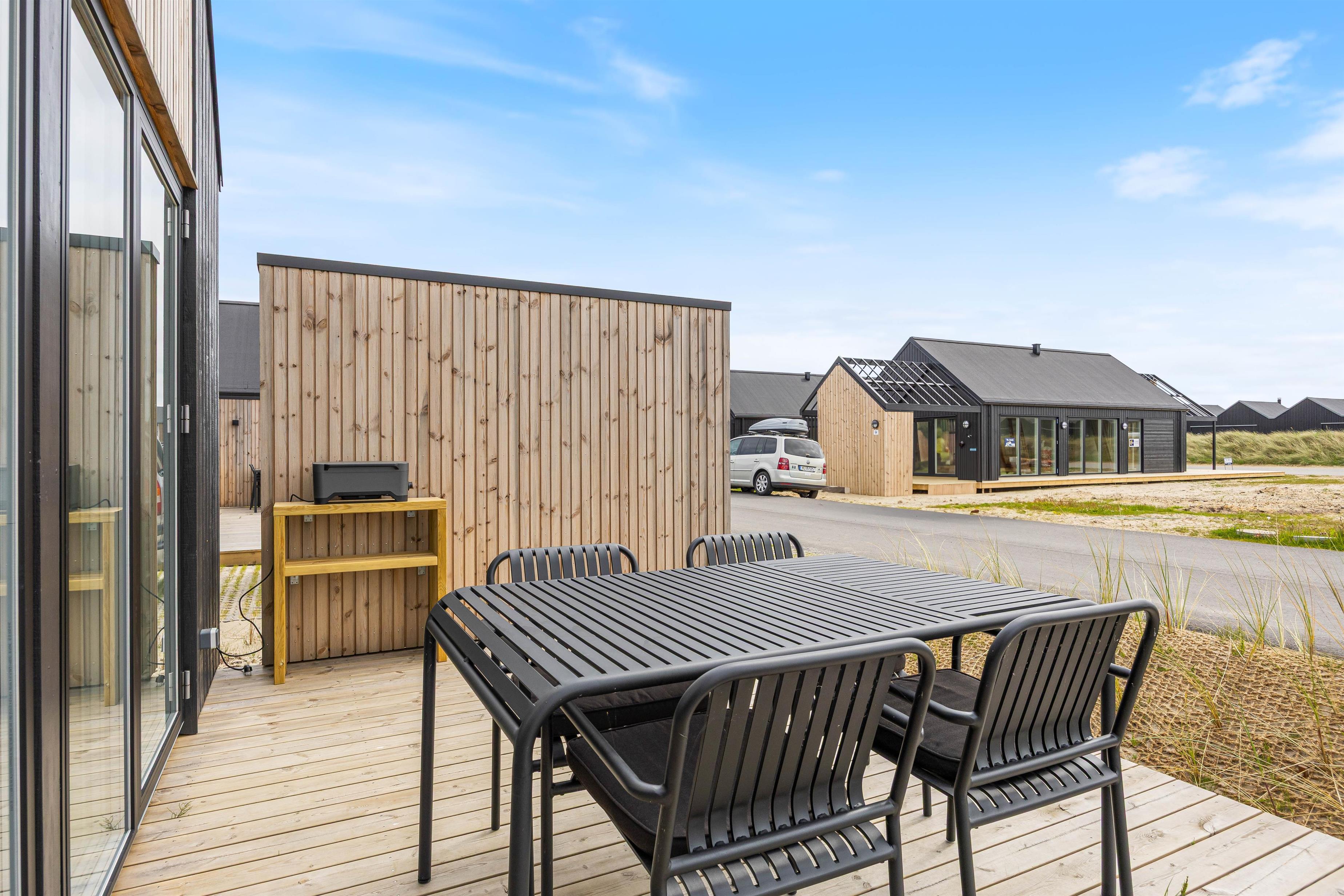 Udendørsarealerne er skabt til hygge og samvær. Den lille åbne terrasse giver masser af plads til at nyde solskinstimerne, og med havemøbler og grill kan I samles om lækre grillmiddage i den friske luft. Området omkring feriehuset er smukt præget af sand og marehalm, hvilket giver en autentisk vestkyststemning.