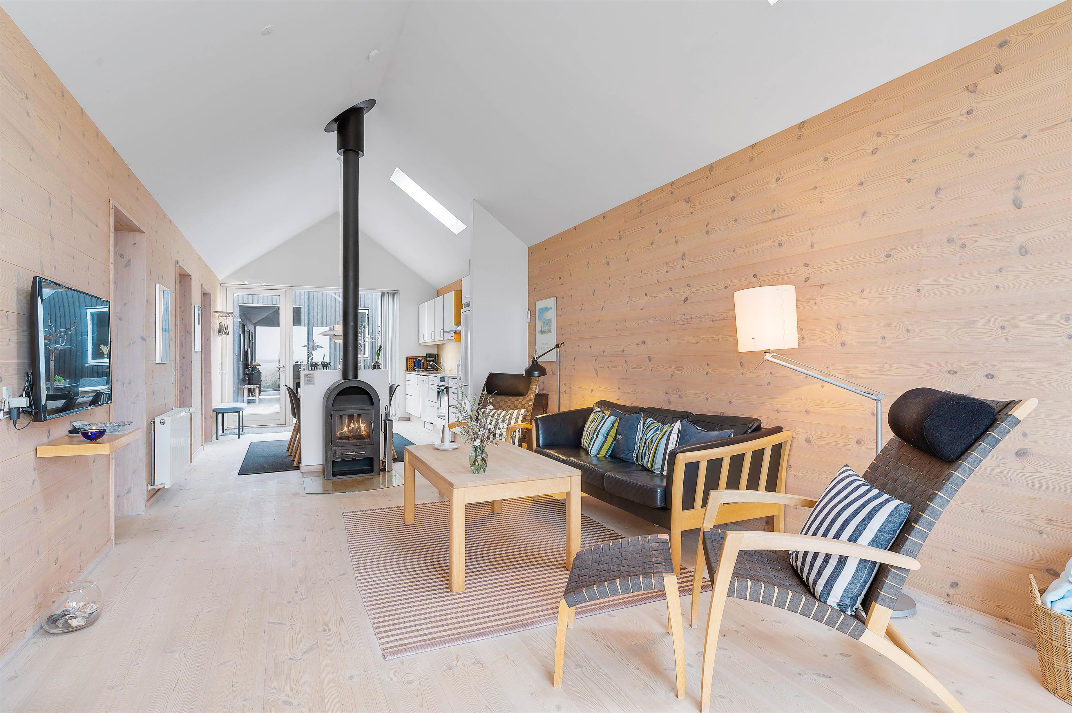 Sommerhusets hjerte er opholdsrummet, som ligger i åben forbindelse med køkkenet. Det store sydvendte vinduesparti skaber et naturligt lysindfald og ikke mindst den mest fantastiske udsigt til vandet og slusen. På en kølig efterårsdag kan I tænde op for brændeovnen, mens I sætter jeres yndlingsfilm på fjernsynet. Sommerhuset har både danske og tyske tv-kanaler samt en Chromecast.