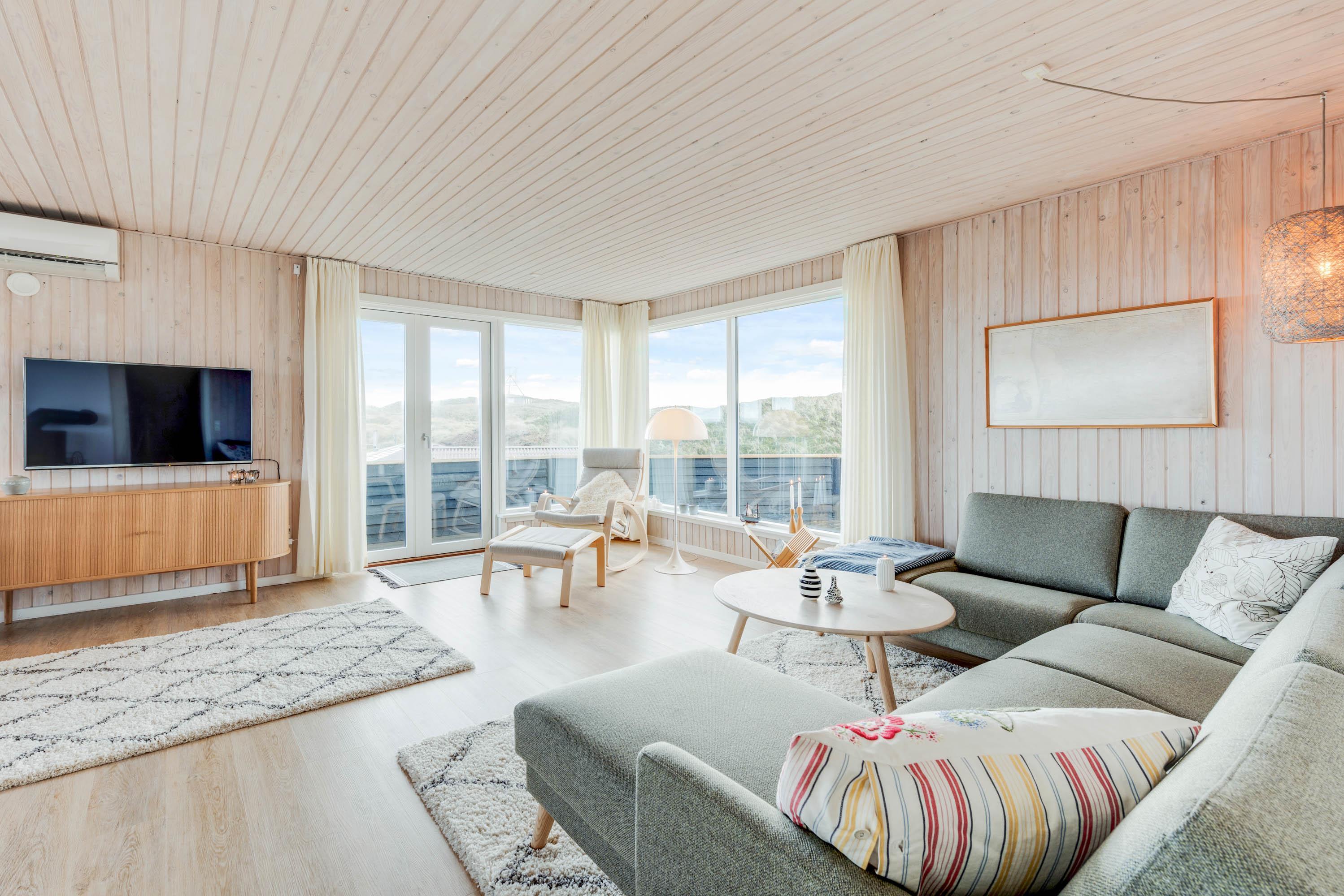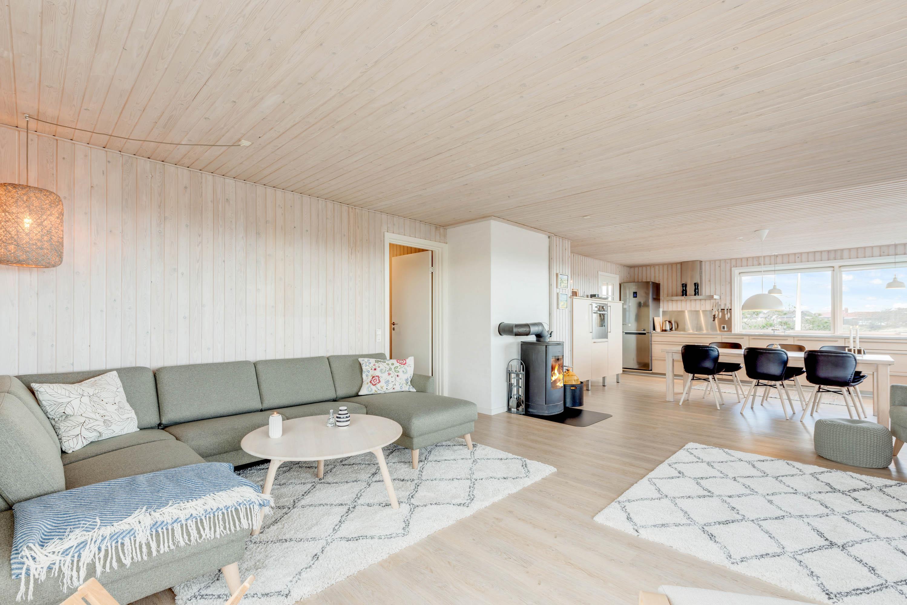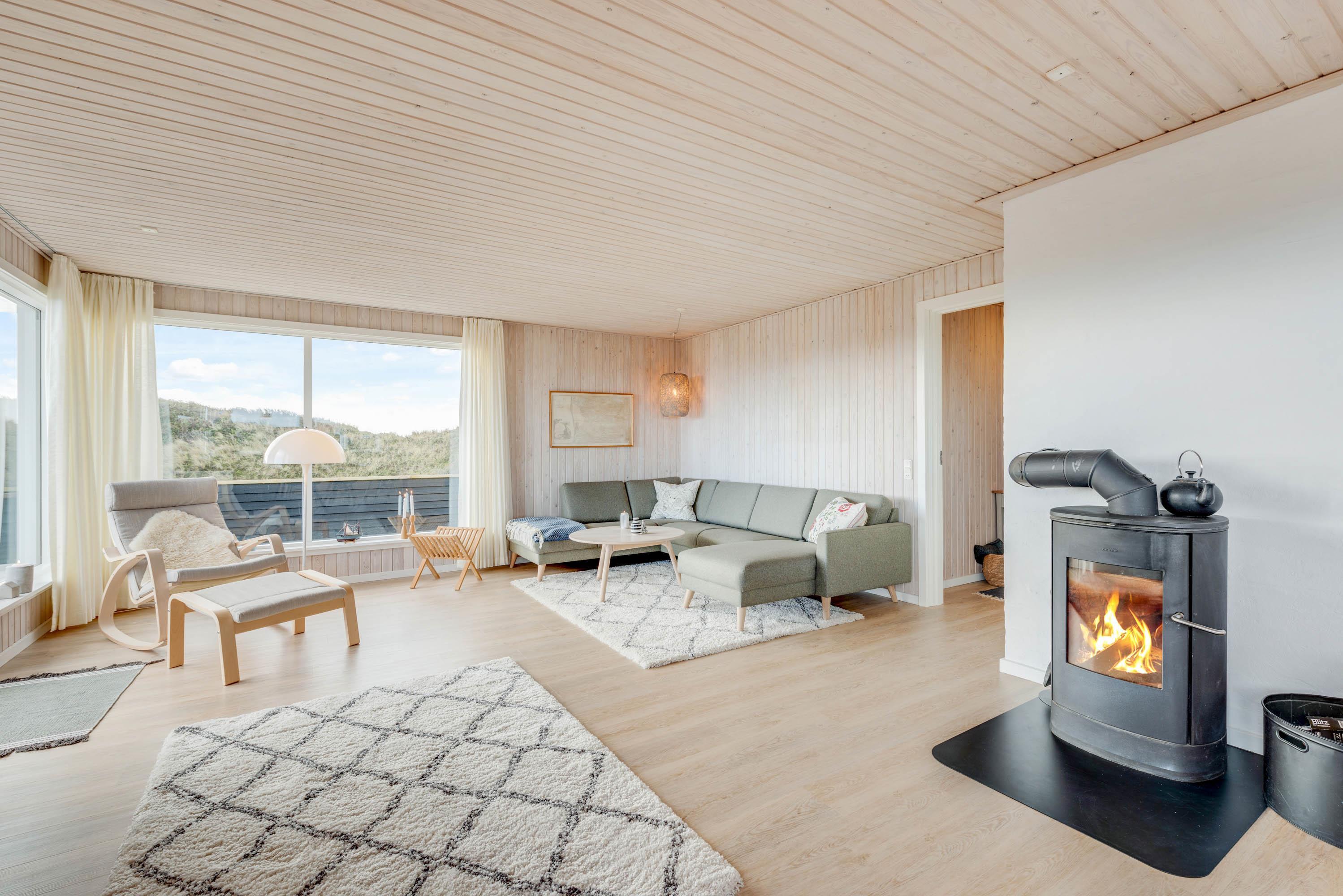 I det åbne opholdsrum er køkken og stue slået sammen i ét, og mens I tilbereder aftensmaden eller flader ud på sofaen, kan I nyde den flotte fjordudsigt gennem vinduerne. På de kølige feriedage står brændeovnen klar til at varme jer.
