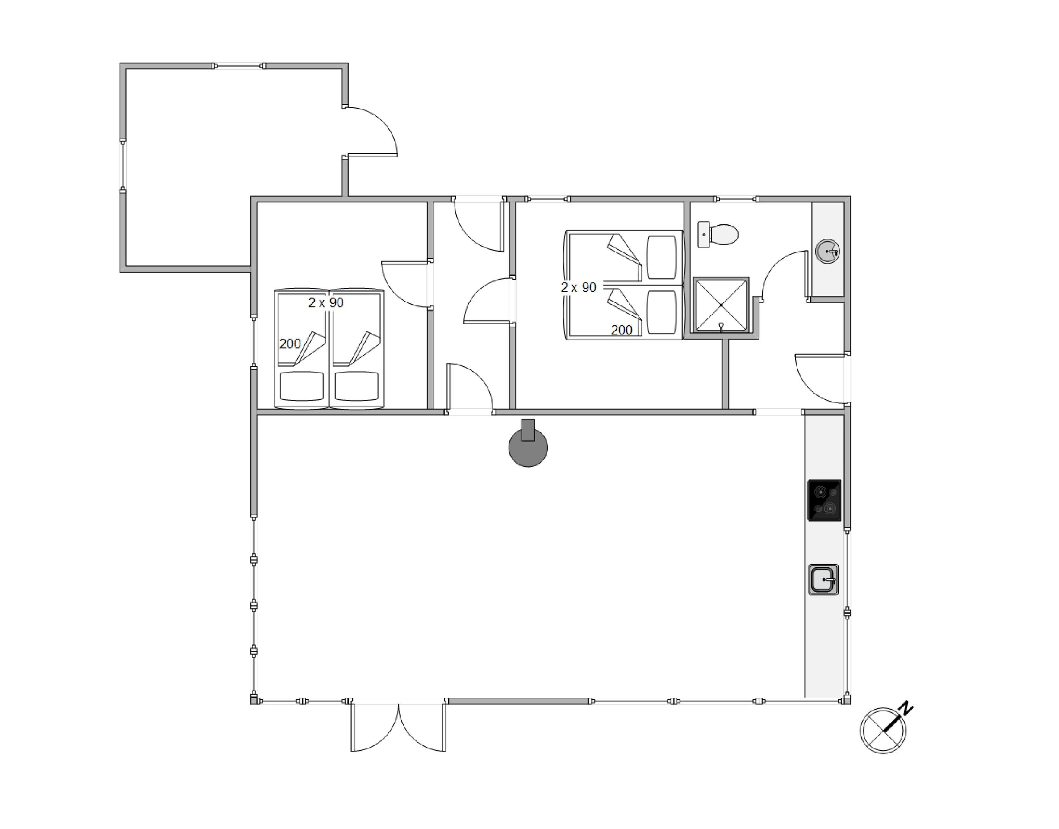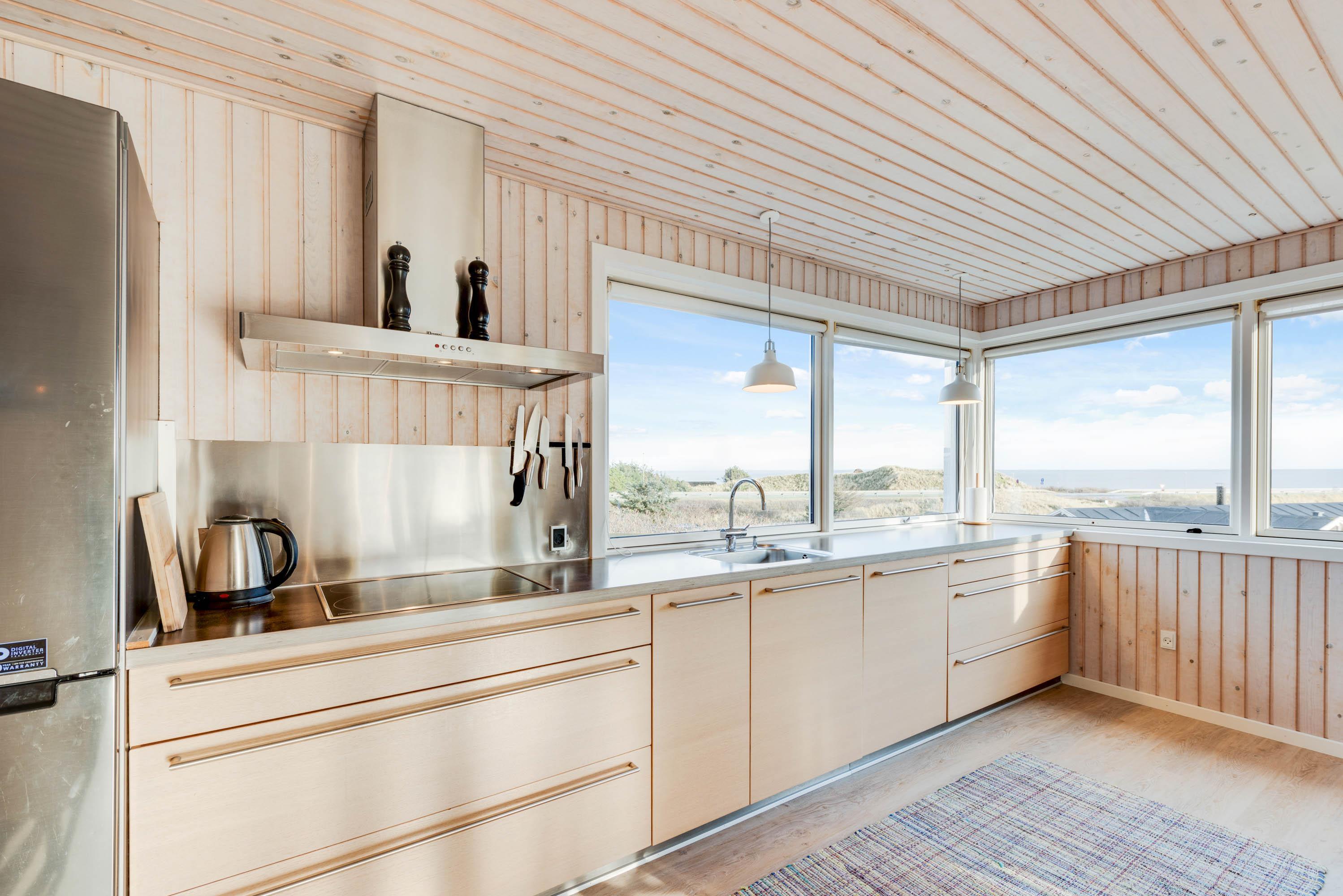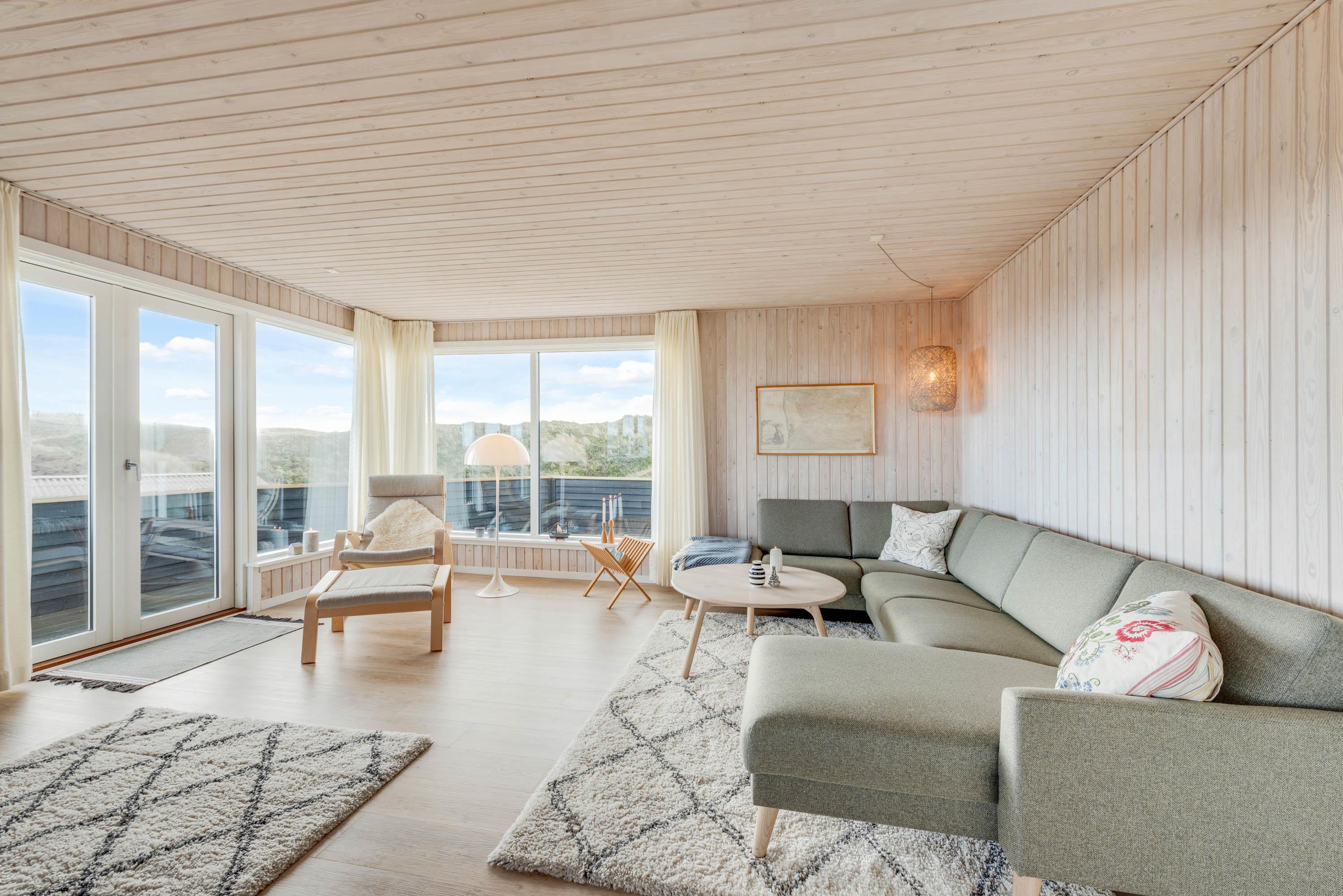 I det åbne opholdsrum er køkken og stue slået sammen i ét, og mens I tilbereder aftensmaden eller flader ud på sofaen, kan I nyde den flotte fjordudsigt gennem vinduerne. På de kølige feriedage står brændeovnen klar til at varme jer.