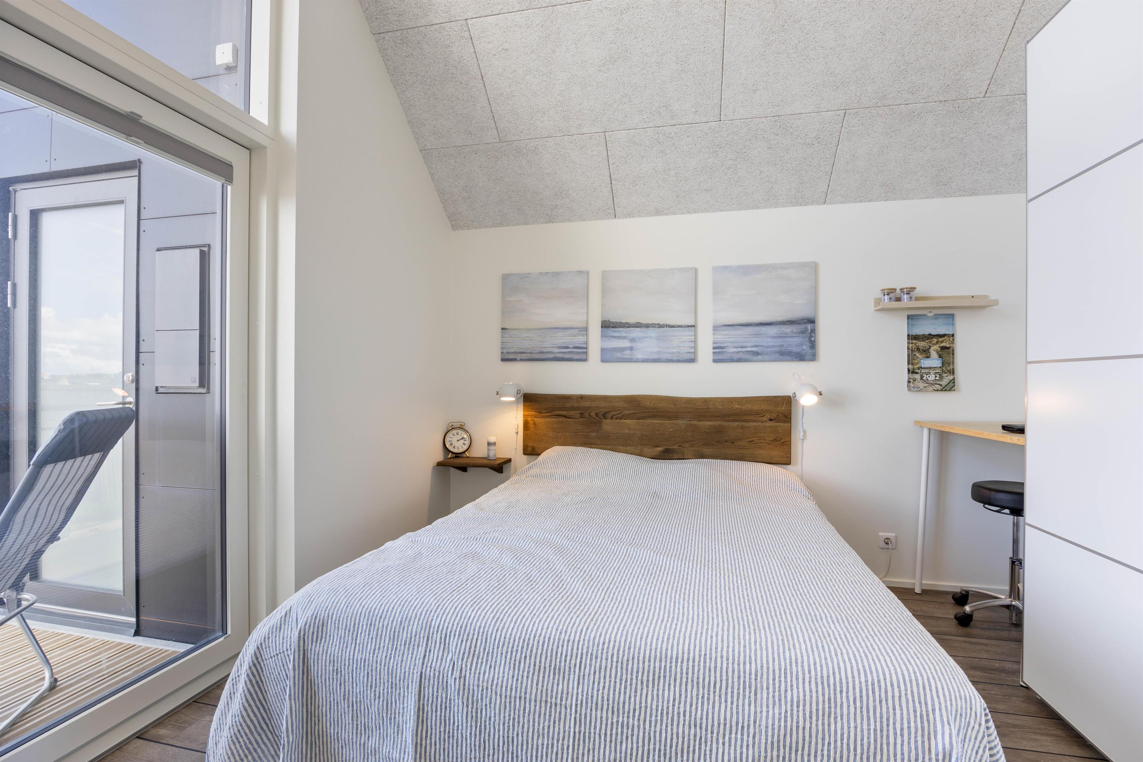 Her er der et soveværelse med en dobbeltseng, værelset er både lyst og rummeligt. Her vil I kunne nyde en god nats søvn. Desuden er der fra værelset også direkte adgang til altanen, så I kan nyde jeres morgenkaffe. Der er et badeværelse i lejligheden med gulvvarme.