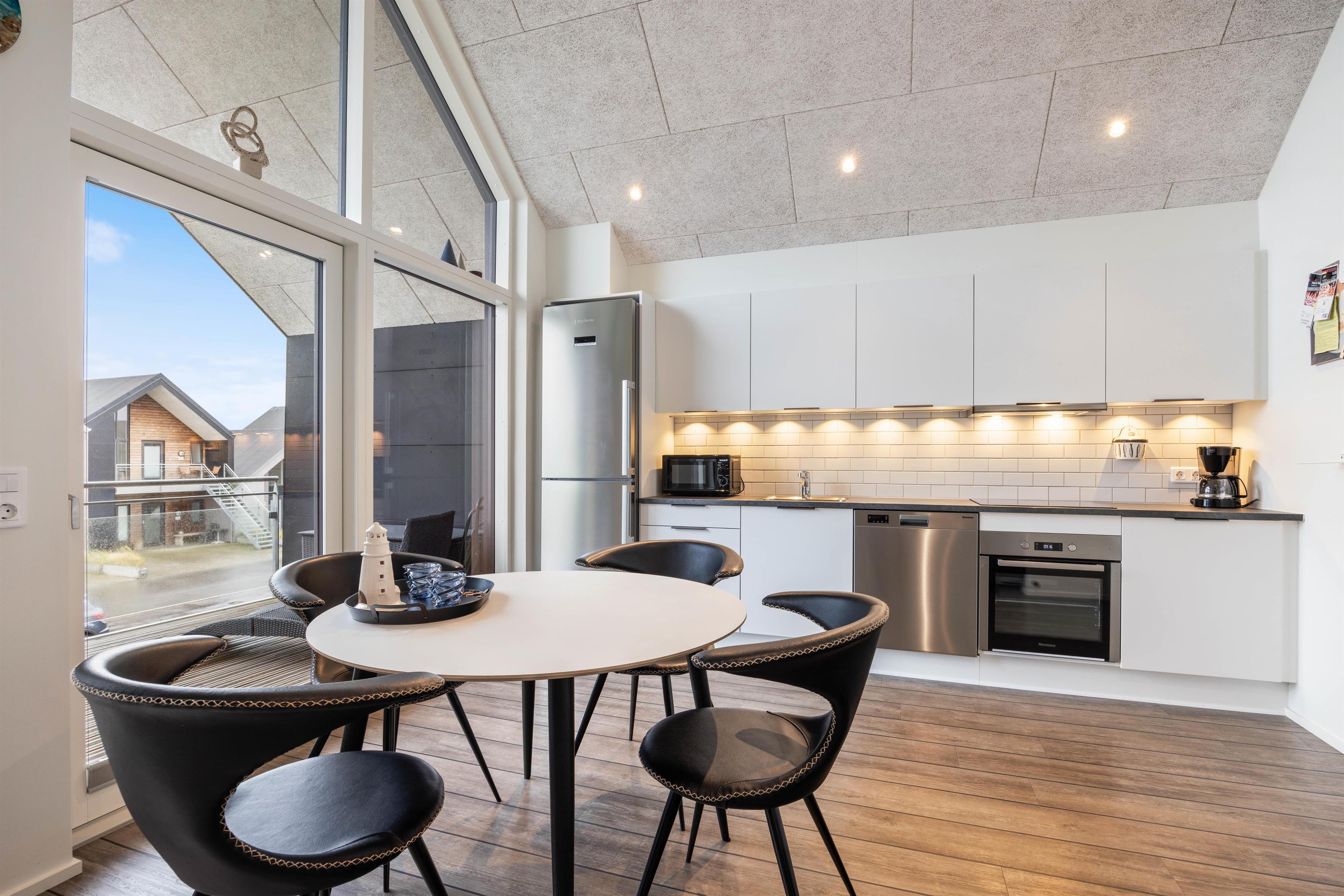 Ferielejligheden på Langsand 121, 1. sal har en moderne indretning med store og lyse rum. I vil helt sikkert føle jer godt tilpas her med en skøn udsigt til Tyskerhavnen og fjorden. I ferielejligheden er der et dejligt køkkenalrum med et funktionelt køkken og et komfortabelt stueområde. Fra køkkenalrummet har I direkte adgang til altanen, hvorfra I kan nyde udsigten.