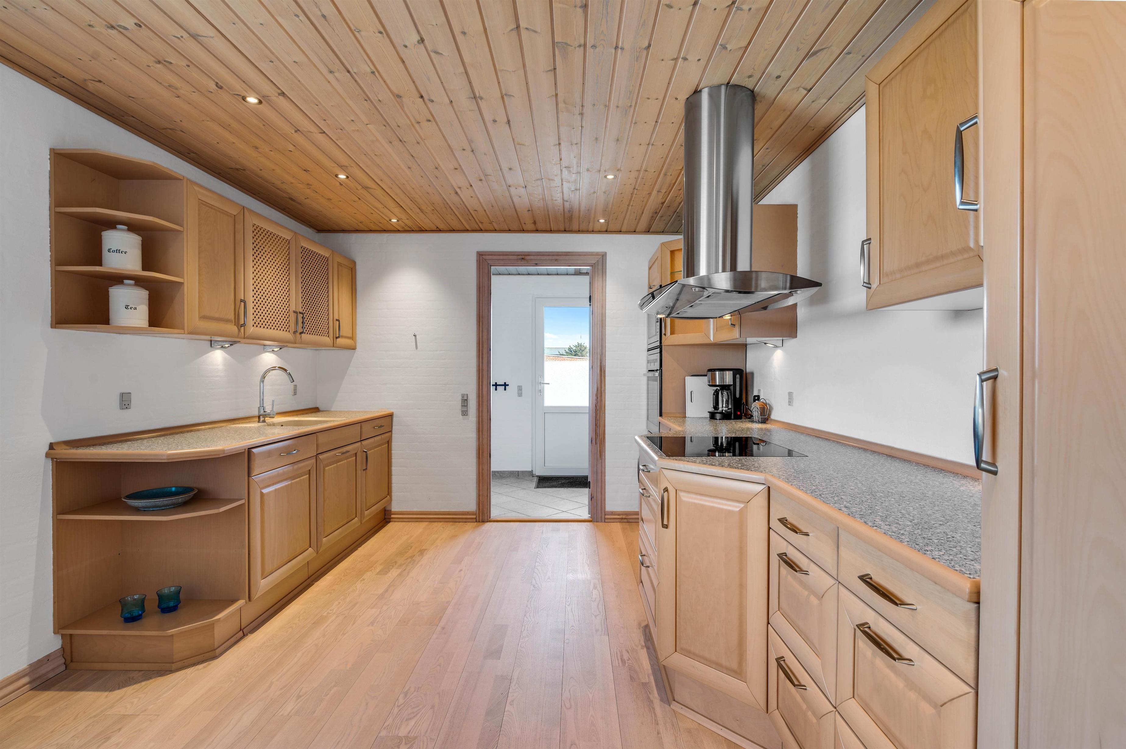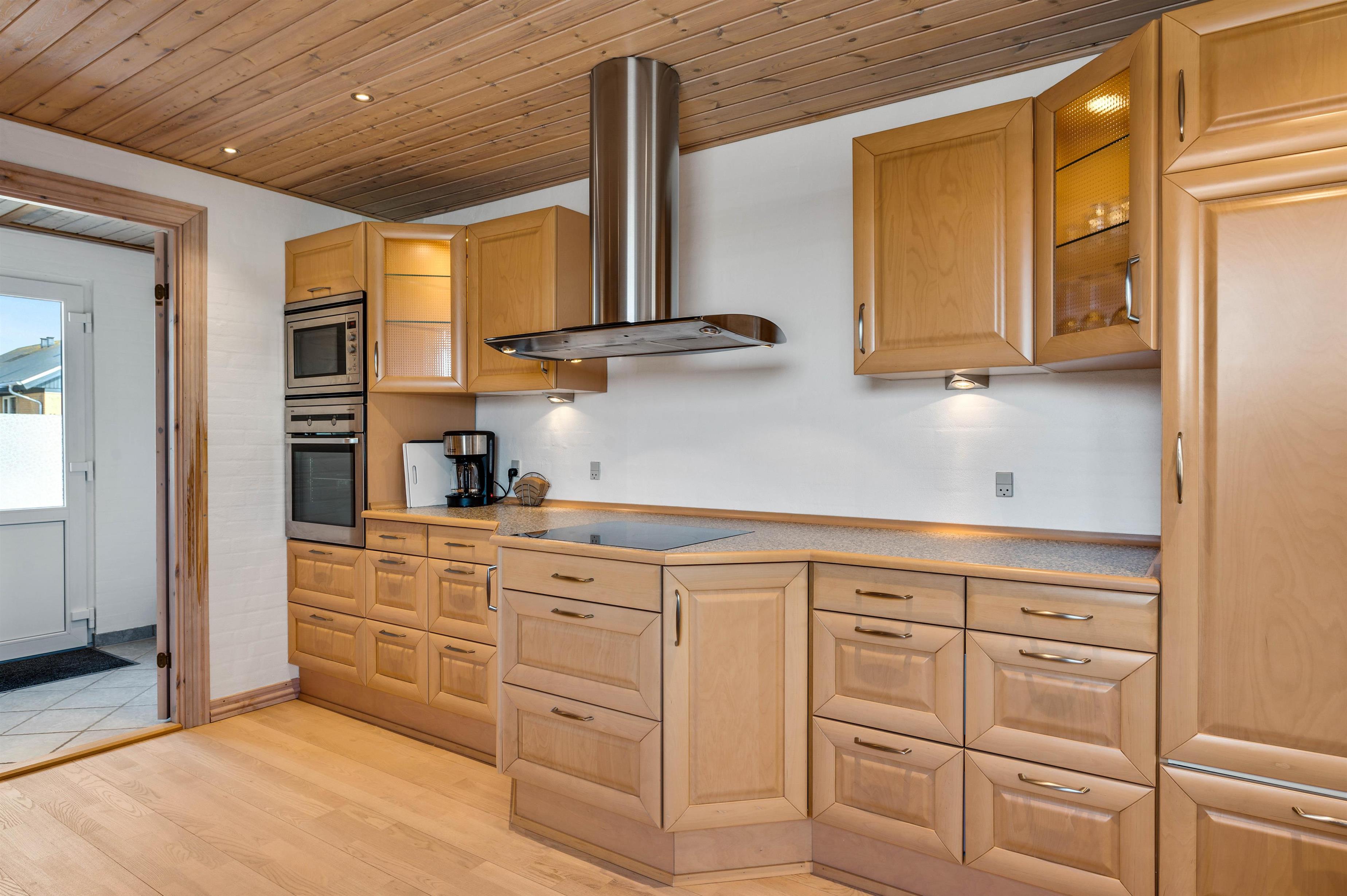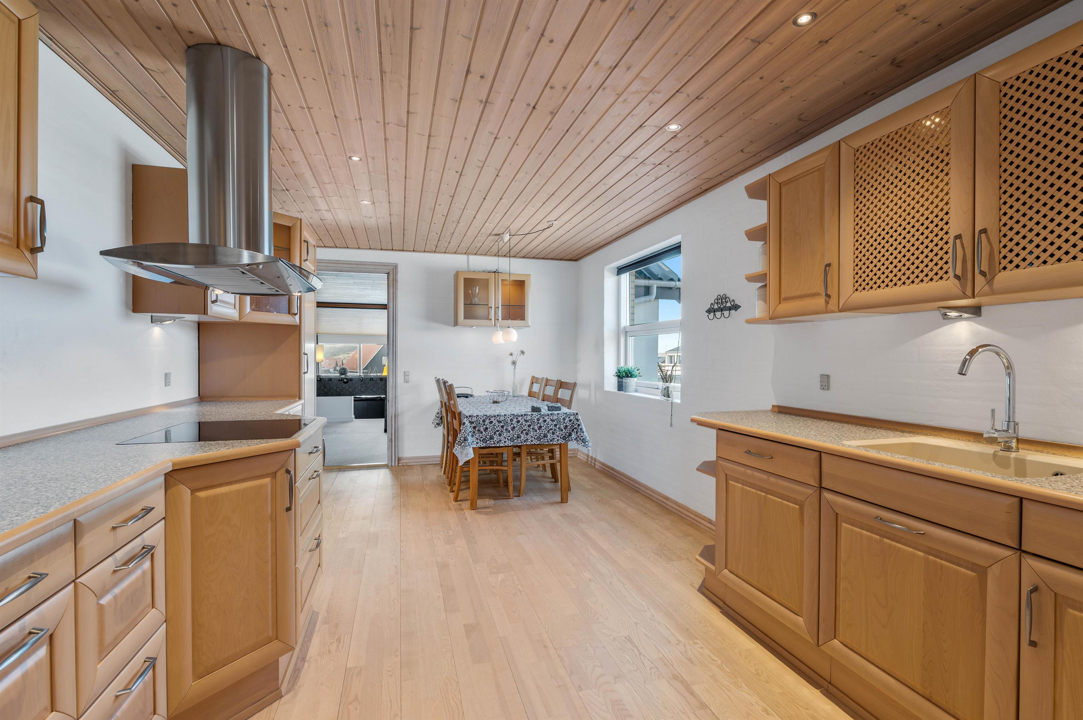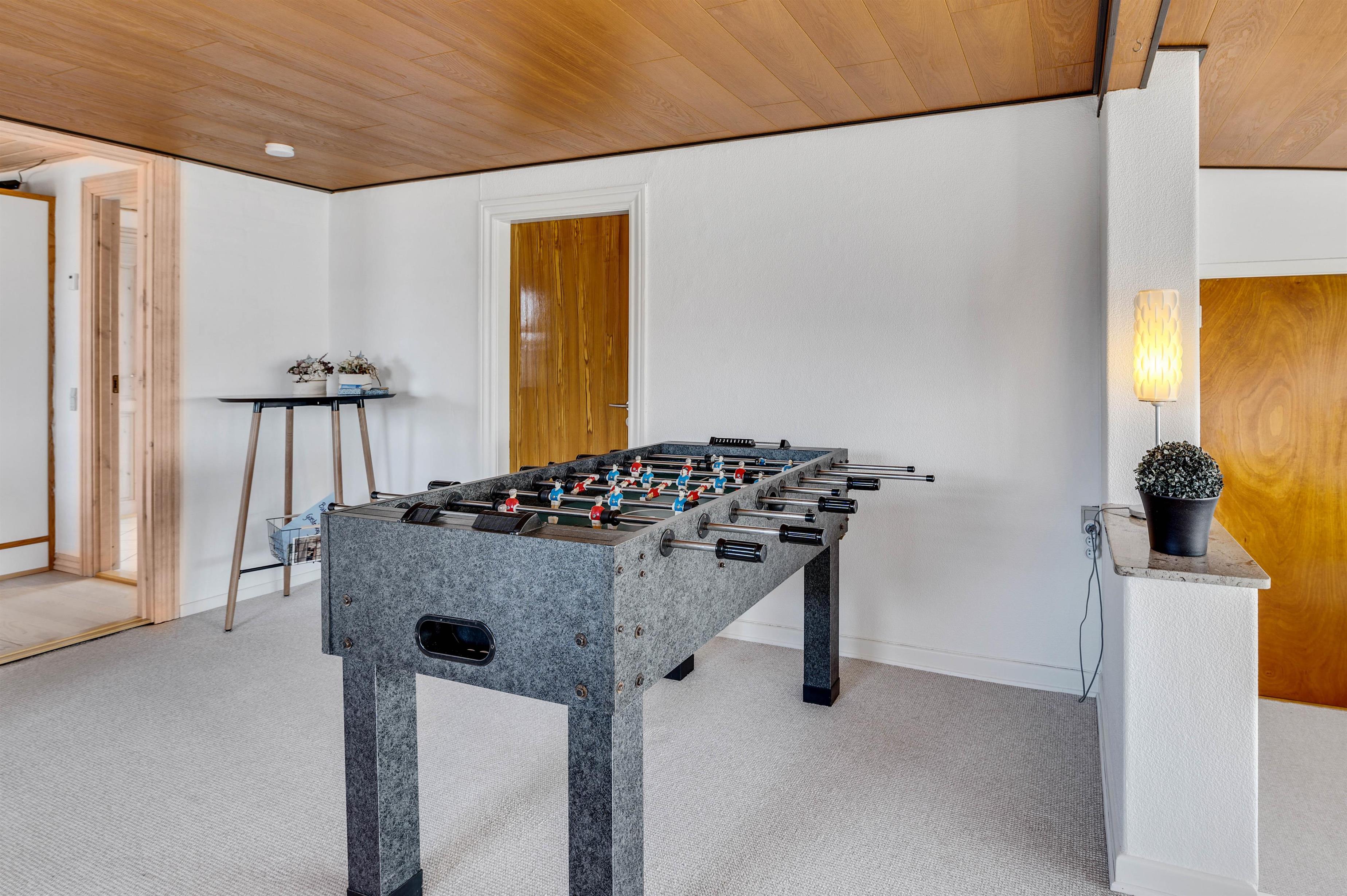 Sommerhuset har et praktisk udstyret køkken med blandt andet opvaskemaskine, mikroovn og induktionskomfur, så der kan laves et lækkert måltid, mens resten af familien tager et spil bordfodbold i opholdsrummet.