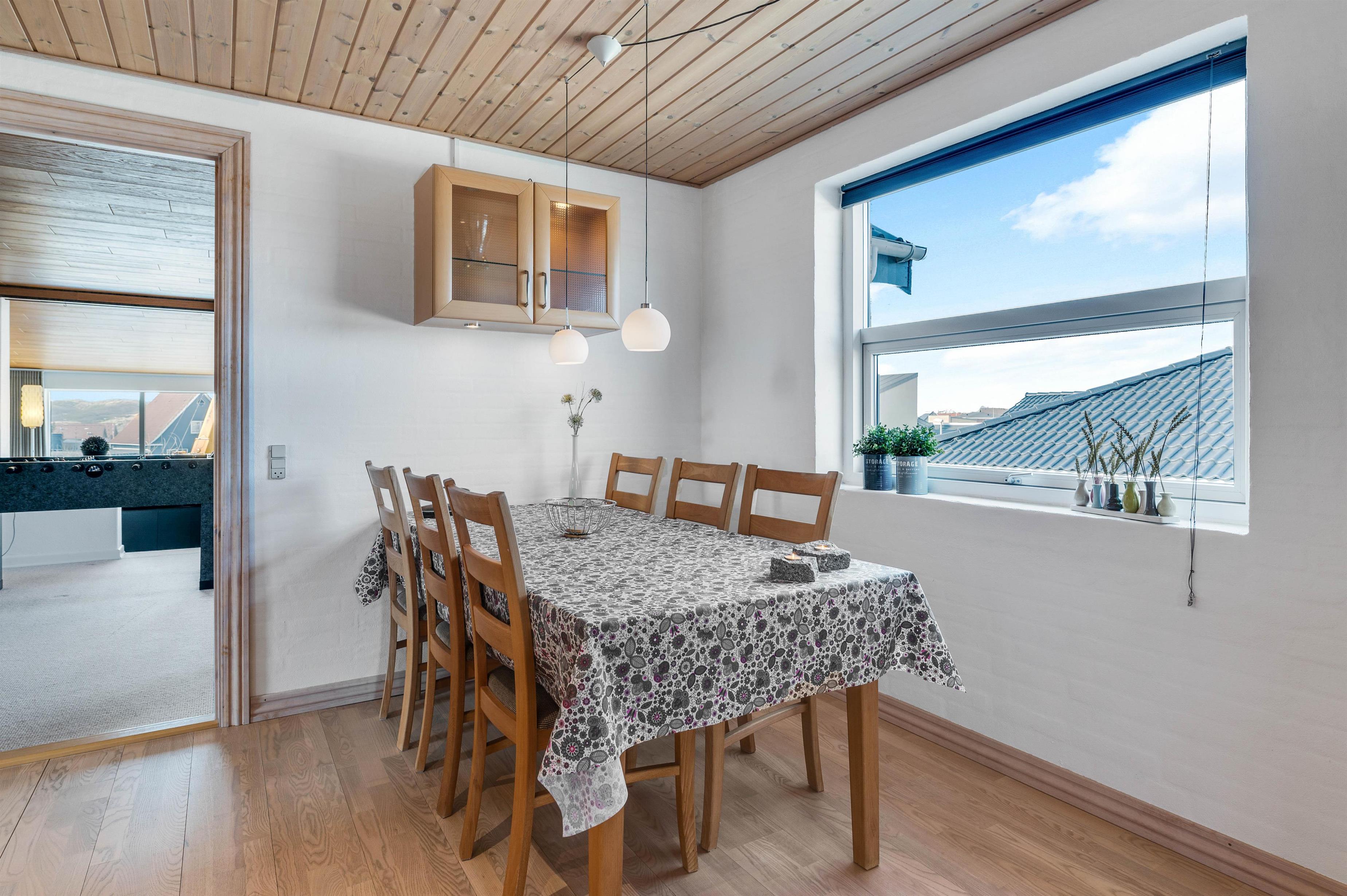 Fra stuen er der direkte udgang til den vestvendte terrasse, og derfor har I også herfra en fin udsigt over byen og klitterne.