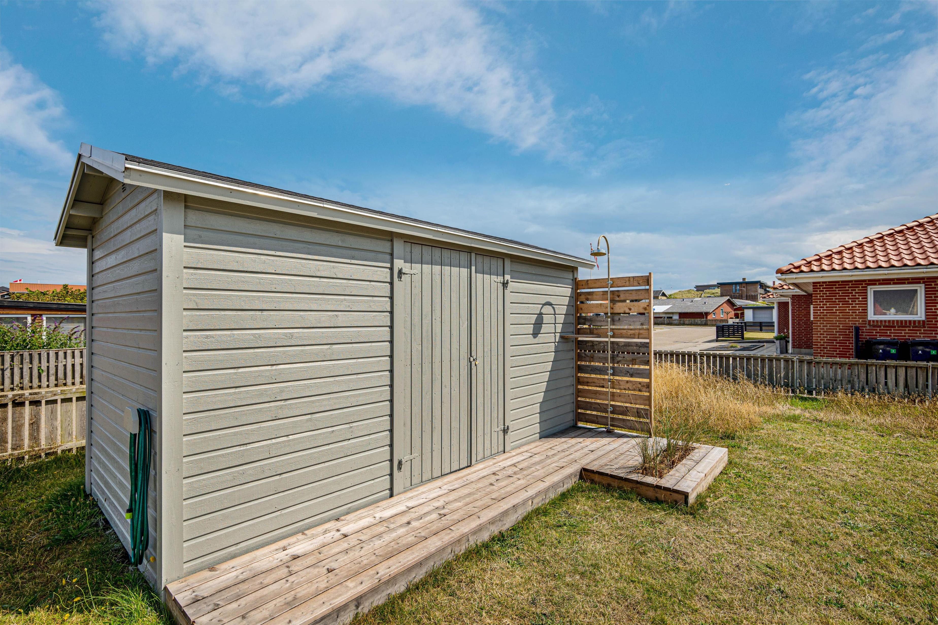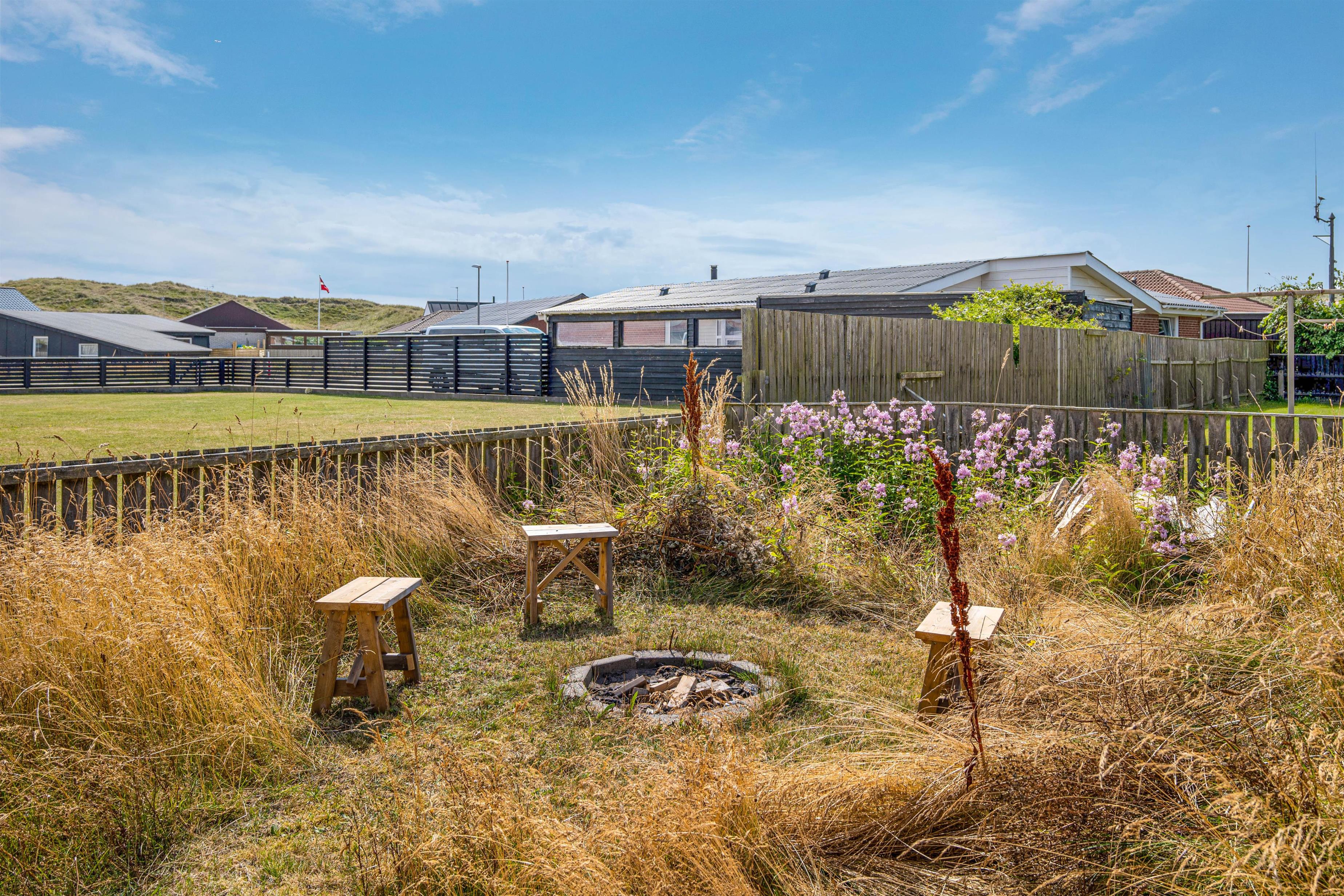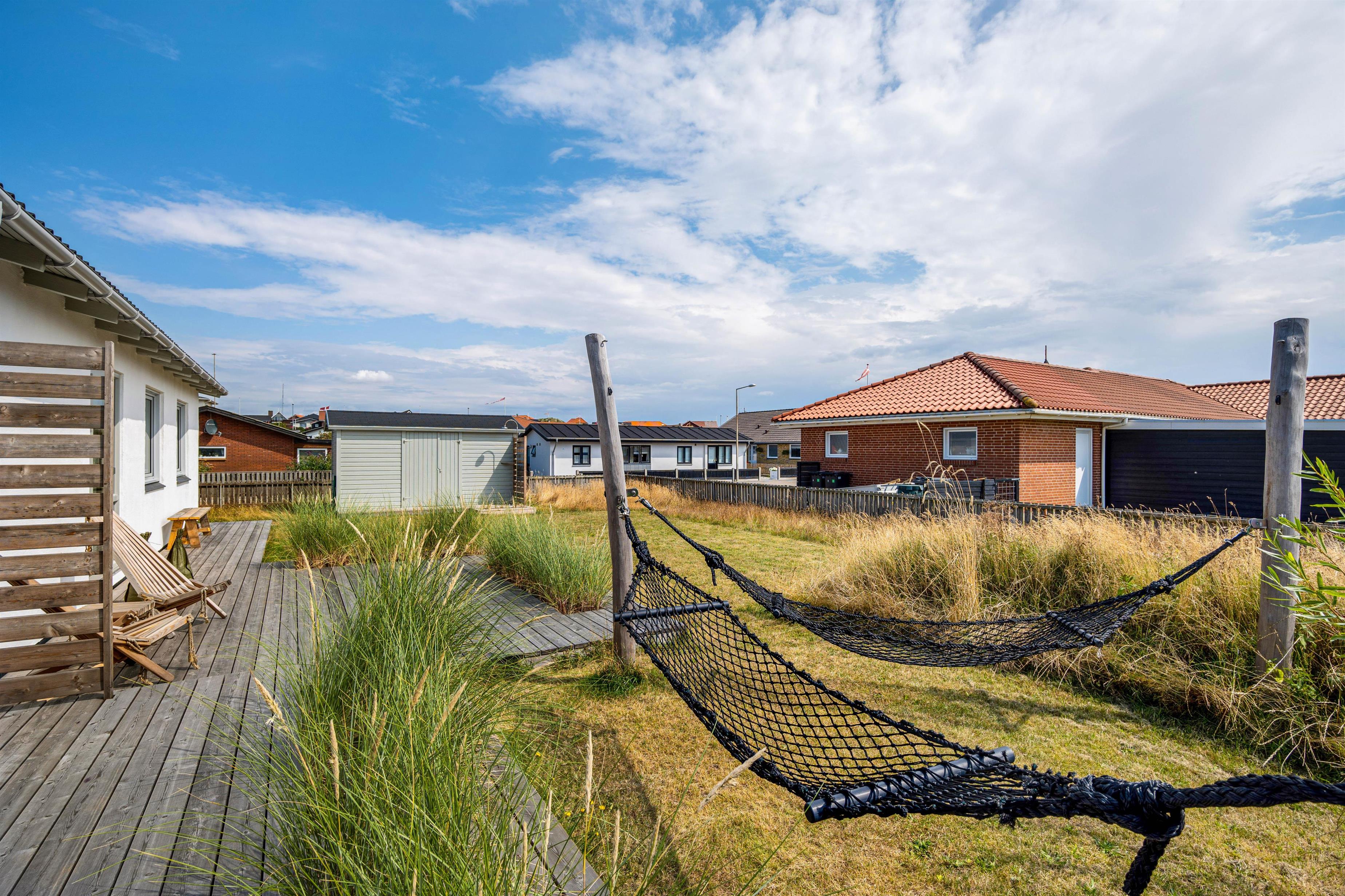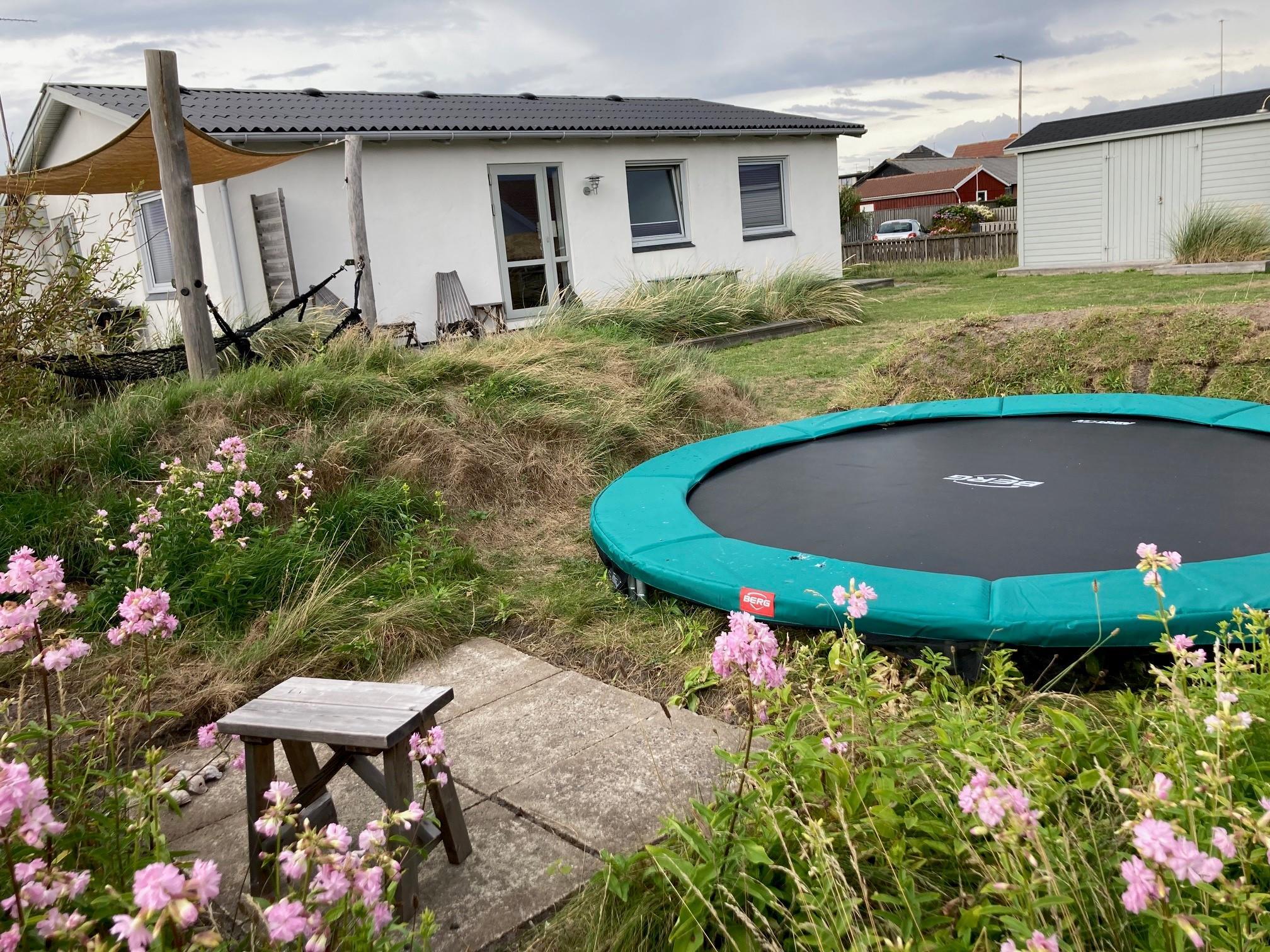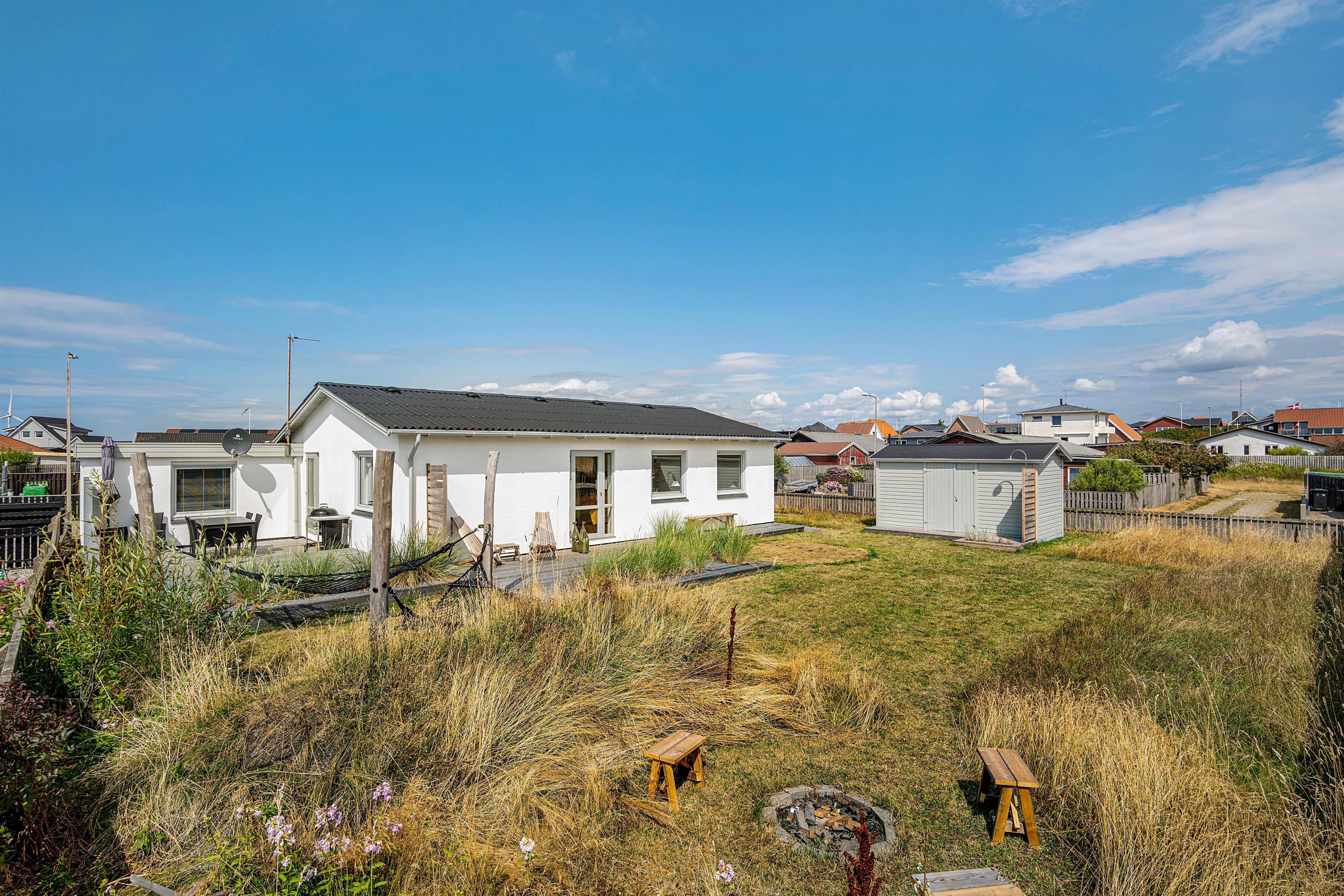 Fra den hyggelige stue er der adgang til den store terrasse med flere flotte detaljer som de indbyggede plantebede med marehalm. Det giver et flot og enkelt indtryk uden at ødelægge udsigten til haven og klitterne i baggrunden. Terrassen er både åben og afskærmet, hvilket giver jer mulighed for at sidde i læ for vestenvinden, mens I nyder en lækker grillmiddag, og samtidig kan holde øje med børnene på trampolinen.